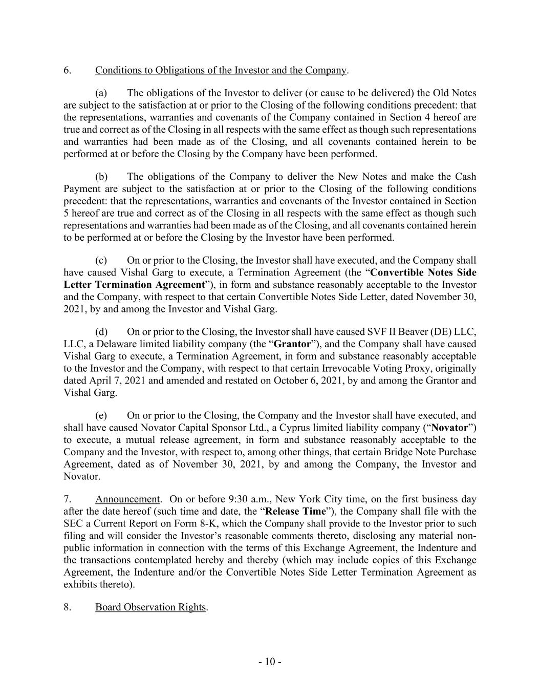 - 10 - 6. Conditions to Obligations of the Investor and the Company. (a) The obligations of the Investor to deliver (or cause to be delivered) the Old Notes are subject to the satisfaction at or prior to the Closing of the following conditions precedent: that the representations, warranties and covenants of the Company contained in Section 4 hereof are true and correct as of the Closing in all respects with the same effect as though such representations and warranties had been made as of the Closing, and all covenants contained herein to be performed at or before the Closing by the Company have been performed. (b) The obligations of the Company to deliver the New Notes and make the Cash Payment are subject to the satisfaction at or prior to the Closing of the following conditions precedent: that the representations, warranties and covenants of the Investor contained in Section 5 hereof are true and correct as of the Closing in all respects with the same effect as though such representations and warranties had been made as of the Closing, and all covenants contained herein to be performed at or before the Closing by the Investor have been performed. (c) On or prior to the Closing, the Investor shall have executed, and the Company shall have caused Vishal Garg to execute, a Termination Agreement (the “Convertible Notes Side Letter Termination Agreement”), in form and substance reasonably acceptable to the Investor and the Company, with respect to that certain Convertible Notes Side Letter, dated November 30, 2021, by and among the Investor and Vishal Garg. (d) On or prior to the Closing, the Investor shall have caused SVF II Beaver (DE) LLC, LLC, a Delaware limited liability company (the “Grantor”), and the Company shall have caused Vishal Garg to execute, a Termination Agreement, in form and substance reasonably acceptable to the Investor and the Company, with respect to that certain Irrevocable Voting Proxy, originally dated April 7, 2021 and amended and restated on October 6, 2021, by and among the Grantor and Vishal Garg. (e) On or prior to the Closing, the Company and the Investor shall have executed, and shall have caused Novator Capital Sponsor Ltd., a Cyprus limited liability company (“Novator”) to execute, a mutual release agreement, in form and substance reasonably acceptable to the Company and the Investor, with respect to, among other things, that certain Bridge Note Purchase Agreement, dated as of November 30, 2021, by and among the Company, the Investor and Novator. 7. Announcement. On or before 9:30 a.m., New York City time, on the first business day after the date hereof (such time and date, the “Release Time”), the Company shall file with the SEC a Current Report on Form 8-K, which the Company shall provide to the Investor prior to such filing and will consider the Investor’s reasonable comments thereto, disclosing any material non- public information in connection with the terms of this Exchange Agreement, the Indenture and the transactions contemplated hereby and thereby (which may include copies of this Exchange Agreement, the Indenture and/or the Convertible Notes Side Letter Termination Agreement as exhibits thereto). 8. Board Observation Rights.