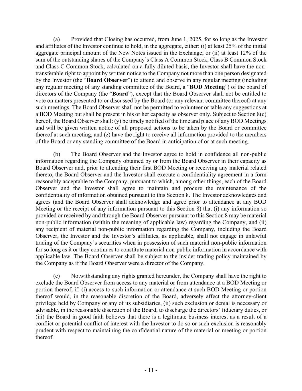 - 11 - (a) Provided that Closing has occurred, from June 1, 2025, for so long as the Investor and affiliates of the Investor continue to hold, in the aggregate, either: (i) at least 25% of the initial aggregate principal amount of the New Notes issued in the Exchange; or (ii) at least 12% of the sum of the outstanding shares of the Company’s Class A Common Stock, Class B Common Stock and Class C Common Stock, calculated on a fully diluted basis, the Investor shall have the non- transferable right to appoint by written notice to the Company not more than one person designated by the Investor (the “Board Observer”) to attend and observe in any regular meeting (including any regular meeting of any standing committee of the Board, a “BOD Meeting”) of the board of directors of the Company (the “Board”), except that the Board Observer shall not be entitled to vote on matters presented to or discussed by the Board (or any relevant committee thereof) at any such meetings. The Board Observer shall not be permitted to volunteer or table any suggestions at a BOD Meeting but shall be present in his or her capacity as observer only. Subject to Section 8(c) hereof, the Board Observer shall: (y) be timely notified of the time and place of any BOD Meetings and will be given written notice of all proposed actions to be taken by the Board or committee thereof at such meeting, and (z) have the right to receive all information provided to the members of the Board or any standing committee of the Board in anticipation of or at such meeting. (b) The Board Observer and the Investor agree to hold in confidence all non-public information regarding the Company obtained by or from the Board Observer in their capacity as Board Observer and, prior to attending their first BOD Meeting or receiving any material related thereto, the Board Observer and the Investor shall execute a confidentiality agreement in a form reasonably acceptable to the Company, pursuant to which, among other things, each of the Board Observer and the Investor shall agree to maintain and procure the maintenance of the confidentiality of information obtained pursuant to this Section 8. The Investor acknowledges and agrees (and the Board Observer shall acknowledge and agree prior to attendance at any BOD Meeting or the receipt of any information pursuant to this Section 8) that (i) any information so provided or received by and through the Board Observer pursuant to this Section 8 may be material non-public information (within the meaning of applicable law) regarding the Company, and (ii) any recipient of material non-public information regarding the Company, including the Board Observer, the Investor and the Investor’s affiliates, as applicable, shall not engage in unlawful trading of the Company’s securities when in possession of such material non-public information for so long as it or they continues to constitute material non-public information in accordance with applicable law. The Board Observer shall be subject to the insider trading policy maintained by the Company as if the Board Observer were a director of the Company. (c) Notwithstanding any rights granted hereunder, the Company shall have the right to exclude the Board Observer from access to any material or from attendance at a BOD Meeting or portion thereof, if: (i) access to such information or attendance at such BOD Meeting or portion thereof would, in the reasonable discretion of the Board, adversely affect the attorney-client privilege held by Company or any of its subsidiaries, (ii) such exclusion or denial is necessary or advisable, in the reasonable discretion of the Board, to discharge the directors’ fiduciary duties, or (iii) the Board in good faith believes that there is a legitimate business interest as a result of a conflict or potential conflict of interest with the Investor to do so or such exclusion is reasonably prudent with respect to maintaining the confidential nature of the material or meeting or portion thereof.