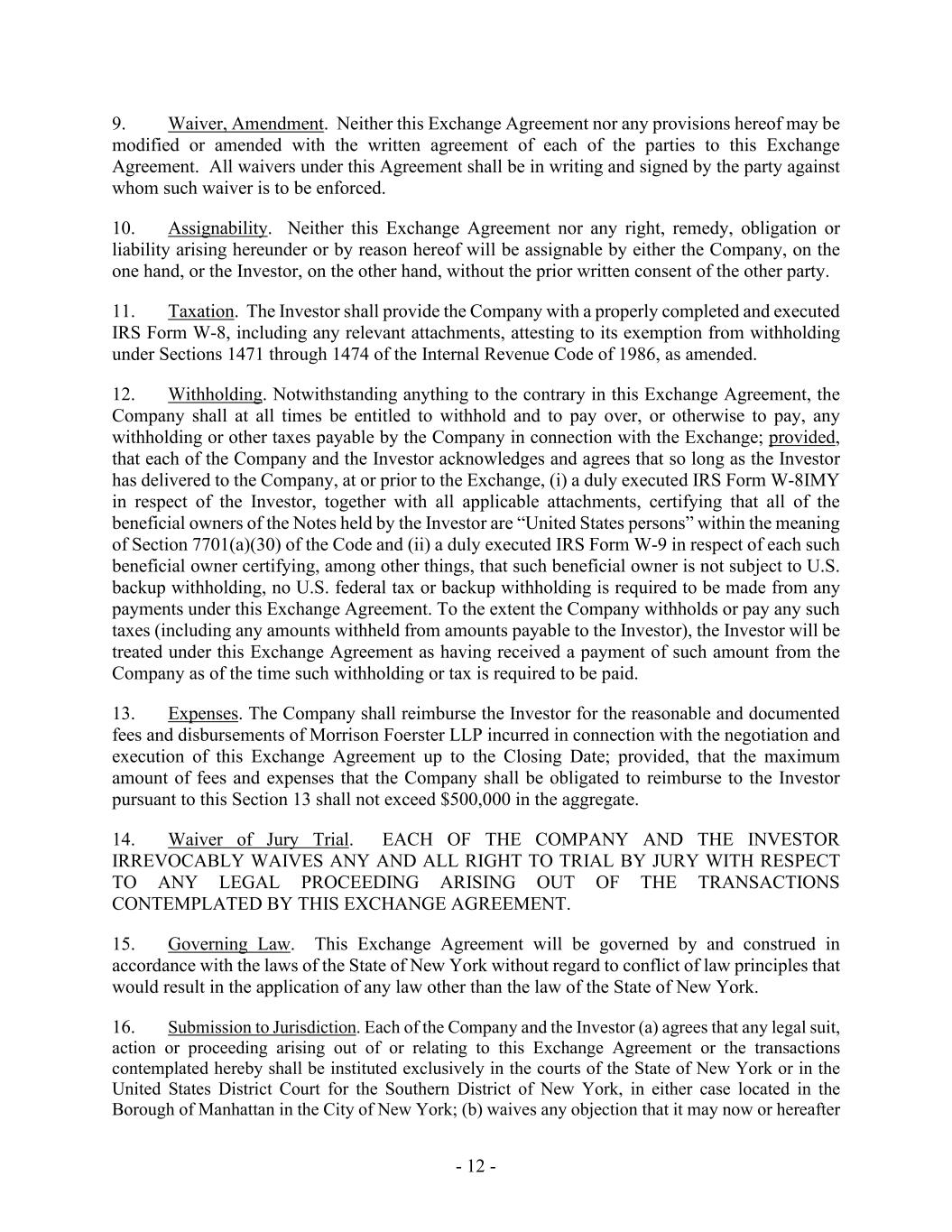 - 12 - 9. Waiver, Amendment. Neither this Exchange Agreement nor any provisions hereof may be modified or amended with the written agreement of each of the parties to this Exchange Agreement. All waivers under this Agreement shall be in writing and signed by the party against whom such waiver is to be enforced. 10. Assignability. Neither this Exchange Agreement nor any right, remedy, obligation or liability arising hereunder or by reason hereof will be assignable by either the Company, on the one hand, or the Investor, on the other hand, without the prior written consent of the other party. 11. Taxation. The Investor shall provide the Company with a properly completed and executed IRS Form W-8, including any relevant attachments, attesting to its exemption from withholding under Sections 1471 through 1474 of the Internal Revenue Code of 1986, as amended. 12. Withholding. Notwithstanding anything to the contrary in this Exchange Agreement, the Company shall at all times be entitled to withhold and to pay over, or otherwise to pay, any withholding or other taxes payable by the Company in connection with the Exchange; provided, that each of the Company and the Investor acknowledges and agrees that so long as the Investor has delivered to the Company, at or prior to the Exchange, (i) a duly executed IRS Form W-8IMY in respect of the Investor, together with all applicable attachments, certifying that all of the beneficial owners of the Notes held by the Investor are “United States persons” within the meaning of Section 7701(a)(30) of the Code and (ii) a duly executed IRS Form W-9 in respect of each such beneficial owner certifying, among other things, that such beneficial owner is not subject to U.S. backup withholding, no U.S. federal tax or backup withholding is required to be made from any payments under this Exchange Agreement. To the extent the Company withholds or pay any such taxes (including any amounts withheld from amounts payable to the Investor), the Investor will be treated under this Exchange Agreement as having received a payment of such amount from the Company as of the time such withholding or tax is required to be paid. 13. Expenses. The Company shall reimburse the Investor for the reasonable and documented fees and disbursements of Morrison Foerster LLP incurred in connection with the negotiation and execution of this Exchange Agreement up to the Closing Date; provided, that the maximum amount of fees and expenses that the Company shall be obligated to reimburse to the Investor pursuant to this Section 13 shall not exceed $500,000 in the aggregate. 14. Waiver of Jury Trial. EACH OF THE COMPANY AND THE INVESTOR IRREVOCABLY WAIVES ANY AND ALL RIGHT TO TRIAL BY JURY WITH RESPECT TO ANY LEGAL PROCEEDING ARISING OUT OF THE TRANSACTIONS CONTEMPLATED BY THIS EXCHANGE AGREEMENT. 15. Governing Law. This Exchange Agreement will be governed by and construed in accordance with the laws of the State of New York without regard to conflict of law principles that would result in the application of any law other than the law of the State of New York. 16. Submission to Jurisdiction. Each of the Company and the Investor (a) agrees that any legal suit, action or proceeding arising out of or relating to this Exchange Agreement or the transactions contemplated hereby shall be instituted exclusively in the courts of the State of New York or in the United States District Court for the Southern District of New York, in either case located in the Borough of Manhattan in the City of New York; (b) waives any objection that it may now or hereafter