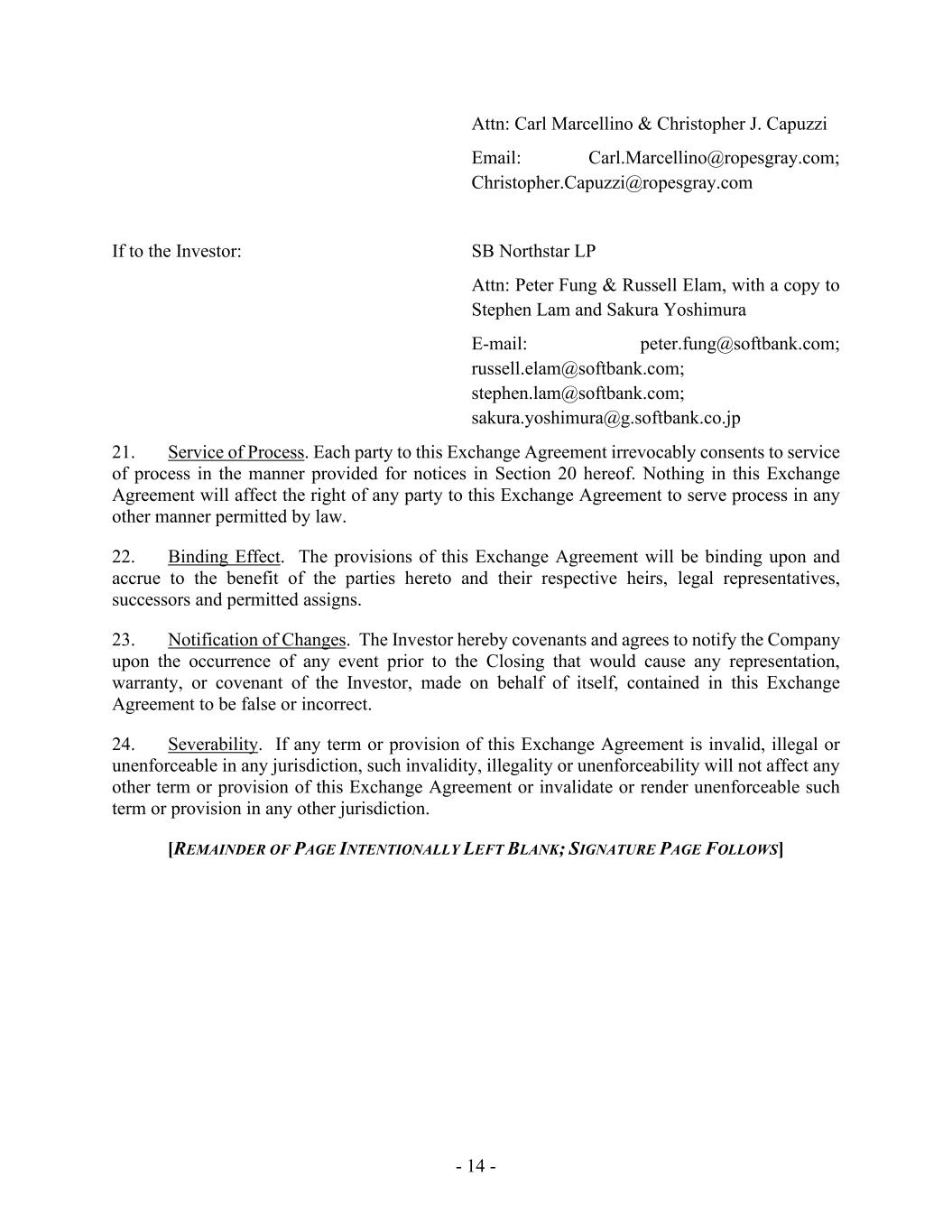 - 14 - Attn: Carl Marcellino & Christopher J. Capuzzi Email: Carl.Marcellino@ropesgray.com; Christopher.Capuzzi@ropesgray.com If to the Investor: SB Northstar LP Attn: Peter Fung & Russell Elam, with a copy to Stephen Lam and Sakura Yoshimura E-mail: peter.fung@softbank.com; russell.elam@softbank.com; stephen.lam@softbank.com; sakura.yoshimura@g.softbank.co.jp 21. Service of Process. Each party to this Exchange Agreement irrevocably consents to service of process in the manner provided for notices in Section 20 hereof. Nothing in this Exchange Agreement will affect the right of any party to this Exchange Agreement to serve process in any other manner permitted by law. 22. Binding Effect. The provisions of this Exchange Agreement will be binding upon and accrue to the benefit of the parties hereto and their respective heirs, legal representatives, successors and permitted assigns. 23. Notification of Changes. The Investor hereby covenants and agrees to notify the Company upon the occurrence of any event prior to the Closing that would cause any representation, warranty, or covenant of the Investor, made on behalf of itself, contained in this Exchange Agreement to be false or incorrect. 24. Severability. If any term or provision of this Exchange Agreement is invalid, illegal or unenforceable in any jurisdiction, such invalidity, illegality or unenforceability will not affect any other term or provision of this Exchange Agreement or invalidate or render unenforceable such term or provision in any other jurisdiction. [REMAINDER OF PAGE INTENTIONALLY LEFT BLANK; SIGNATURE PAGE FOLLOWS]
