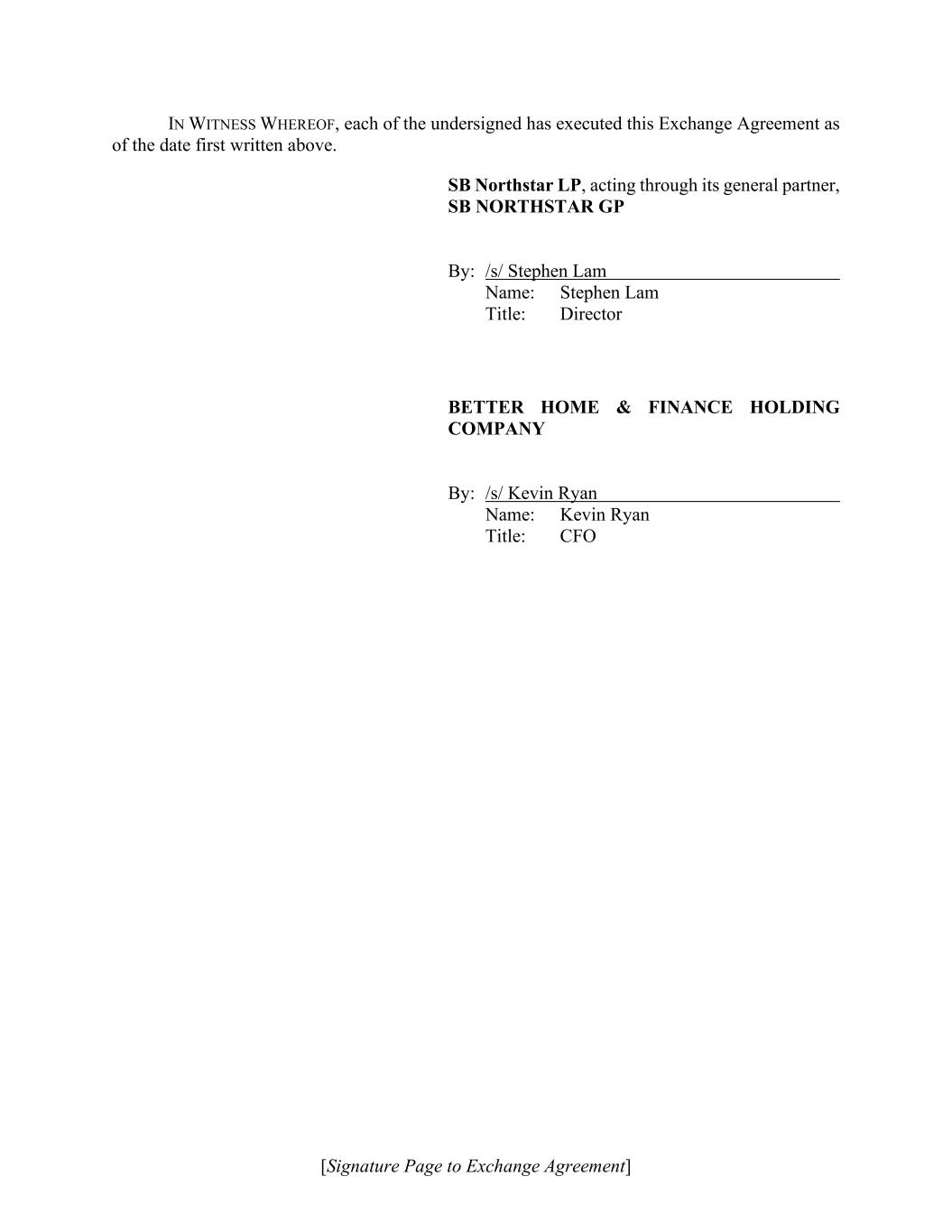 [Signature Page to Exchange Agreement] IN WITNESS WHEREOF, each of the undersigned has executed this Exchange Agreement as of the date first written above. SB Northstar LP, acting through its general partner, SB NORTHSTAR GP By: /s/ Stephen Lam Name: Stephen Lam Title: Director BETTER HOME & FINANCE HOLDING COMPANY By: /s/ Kevin Ryan Name: Kevin Ryan Title: CFO