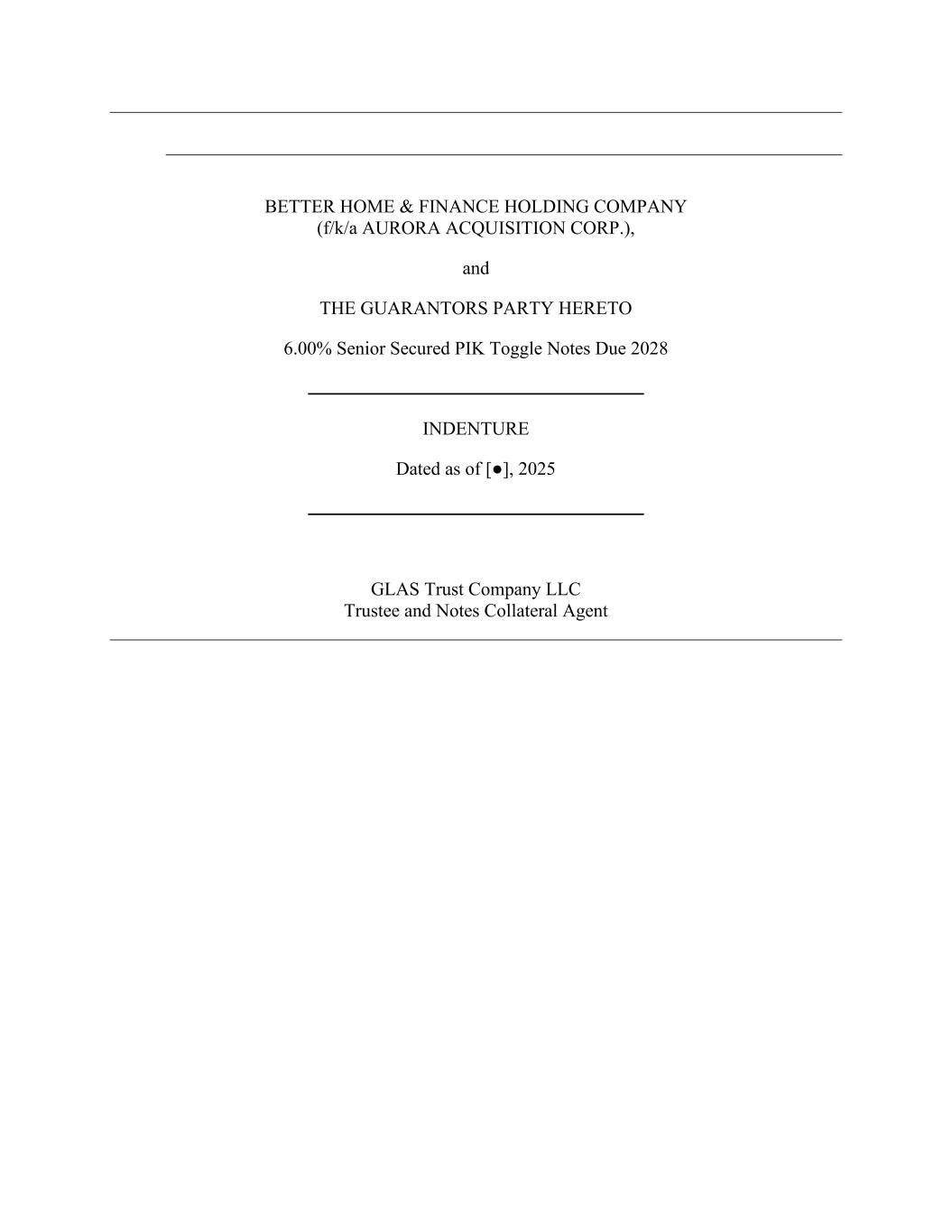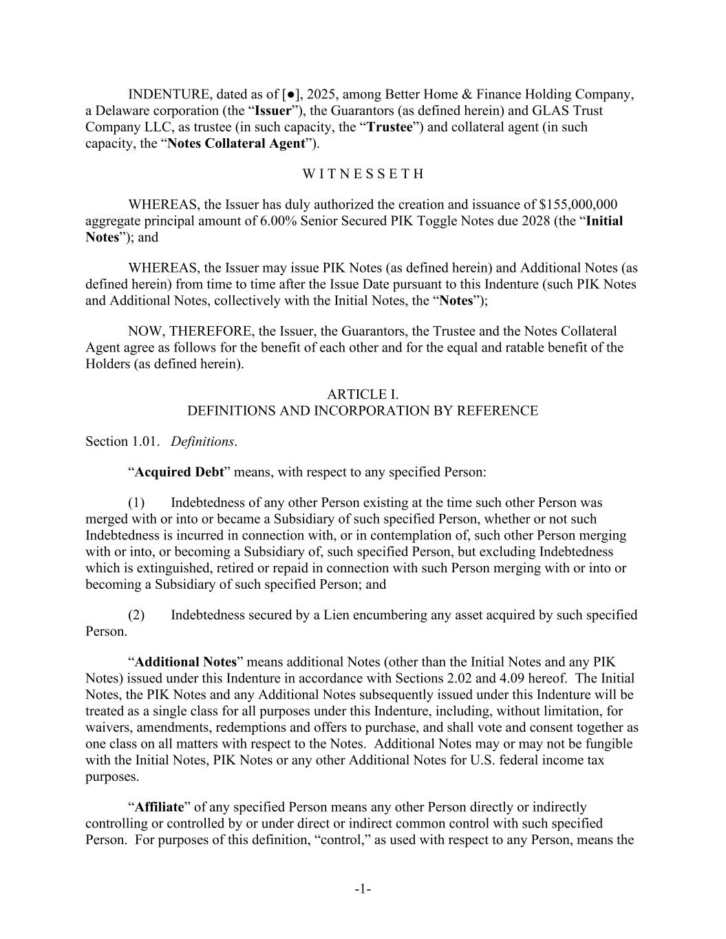 -1- INDENTURE, dated as of [●], 2025, among Better Home & Finance Holding Company, a Delaware corporation (the “Issuer”), the Guarantors (as defined herein) and GLAS Trust Company LLC, as trustee (in such capacity, the “Trustee”) and collateral agent (in such capacity, the “Notes Collateral Agent”). W I T N E S S E T H WHEREAS, the Issuer has duly authorized the creation and issuance of $155,000,000 aggregate principal amount of 6.00% Senior Secured PIK Toggle Notes due 2028 (the “Initial Notes”); and WHEREAS, the Issuer may issue PIK Notes (as defined herein) and Additional Notes (as defined herein) from time to time after the Issue Date pursuant to this Indenture (such PIK Notes and Additional Notes, collectively with the Initial Notes, the “Notes”); NOW, THEREFORE, the Issuer, the Guarantors, the Trustee and the Notes Collateral Agent agree as follows for the benefit of each other and for the equal and ratable benefit of the Holders (as defined herein). ARTICLE I. DEFINITIONS AND INCORPORATION BY REFERENCE Section 1.01. Definitions. “Acquired Debt” means, with respect to any specified Person: (1) Indebtedness of any other Person existing at the time such other Person was merged with or into or became a Subsidiary of such specified Person, whether or not such Indebtedness is incurred in connection with, or in contemplation of, such other Person merging with or into, or becoming a Subsidiary of, such specified Person, but excluding Indebtedness which is extinguished, retired or repaid in connection with such Person merging with or into or becoming a Subsidiary of such specified Person; and (2) Indebtedness secured by a Lien encumbering any asset acquired by such specified Person. “Additional Notes” means additional Notes (other than the Initial Notes and any PIK Notes) issued under this Indenture in accordance with Sections 2.02 and 4.09 hereof. The Initial Notes, the PIK Notes and any Additional Notes subsequently issued under this Indenture will be treated as a single class for all purposes under this Indenture, including, without limitation, for waivers, amendments, redemptions and offers to purchase, and shall vote and consent together as one class on all matters with respect to the Notes. Additional Notes may or may not be fungible with the Initial Notes, PIK Notes or any other Additional Notes for U.S. federal income tax purposes. “Affiliate” of any specified Person means any other Person directly or indirectly controlling or controlled by or under direct or indirect common control with such specified Person. For purposes of this definition, “control,” as used with respect to any Person, means the