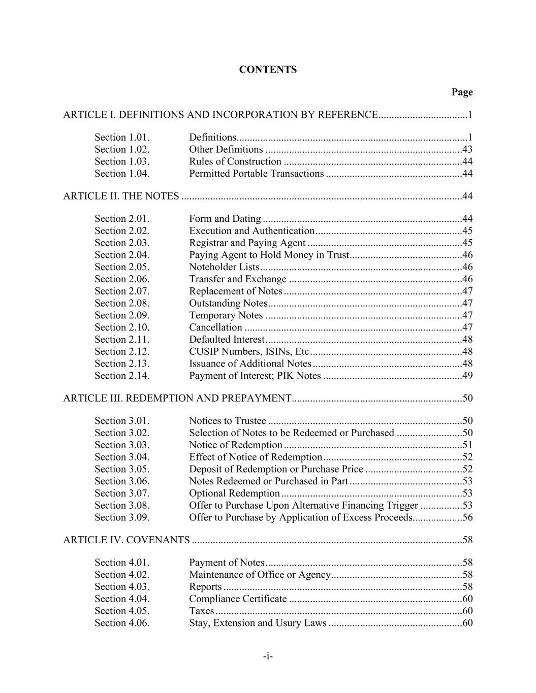 -i- CONTENTS Page ARTICLE I. DEFINITIONS AND INCORPORATION BY REFERENCE ..................................1 Section 1.01. Definitions........................................................................................1 Section 1.02. Other Definitions ...........................................................................43 Section 1.03. Rules of Construction ....................................................................44 Section 1.04. Permitted Portable Transactions ....................................................44 ARTICLE II. THE NOTES ...........................................................................................................44 Section 2.01. Form and Dating ............................................................................44 Section 2.02. Execution and Authentication ........................................................45 Section 2.03. Registrar and Paying Agent ...........................................................45 Section 2.04. Paying Agent to Hold Money in Trust ...........................................46 Section 2.05. Noteholder Lists .............................................................................46 Section 2.06. Transfer and Exchange ..................................................................46 Section 2.07. Replacement of Notes ....................................................................47 Section 2.08. Outstanding Notes ..........................................................................47 Section 2.09. Temporary Notes ...........................................................................47 Section 2.10. Cancellation ...................................................................................47 Section 2.11. Defaulted Interest ...........................................................................48 Section 2.12. CUSIP Numbers, ISINs, Etc ..........................................................48 Section 2.13. Issuance of Additional Notes .........................................................48 Section 2.14. Payment of Interest; PIK Notes .....................................................49 ARTICLE III. REDEMPTION AND PREPAYMENT.................................................................50 Section 3.01. Notices to Trustee ..........................................................................50 Section 3.02. Selection of Notes to be Redeemed or Purchased .........................50 Section 3.03. Notice of Redemption ....................................................................51 Section 3.04. Effect of Notice of Redemption .....................................................52 Section 3.05. Deposit of Redemption or Purchase Price .....................................52 Section 3.06. Notes Redeemed or Purchased in Part ...........................................53 Section 3.07. Optional Redemption .....................................................................53 Section 3.08. Offer to Purchase Upon Alternative Financing Trigger ................53 Section 3.09. Offer to Purchase by Application of Excess Proceeds...................56 ARTICLE IV. COVENANTS .......................................................................................................58 Section 4.01. Payment of Notes ...........................................................................58 Section 4.02. Maintenance of Office or Agency ..................................................58 Section 4.03. Reports ...........................................................................................58 Section 4.04. Compliance Certificate ..................................................................60 Section 4.05. Taxes ..............................................................................................60 Section 4.06. Stay, Extension and Usury Laws ...................................................60
