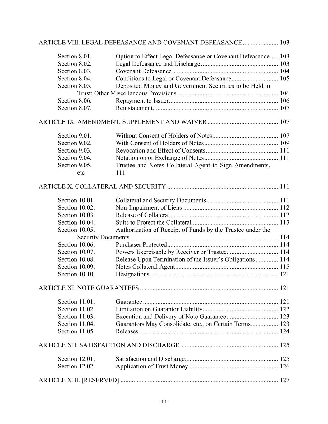 -iii- ARTICLE VIII. LEGAL DEFEASANCE AND COVENANT DEFEASANCE .......................103 Section 8.01. Option to Effect Legal Defeasance or Covenant Defeasance ......103 Section 8.02. Legal Defeasance and Discharge .................................................103 Section 8.03. Covenant Defeasance ...................................................................104 Section 8.04. Conditions to Legal or Covenant Defeasance ..............................105 Section 8.05. Deposited Money and Government Securities to be Held in Trust; Other Miscellaneous Provisions ................................................................106 Section 8.06. Repayment to Issuer .....................................................................106 Section 8.07. Reinstatement ...............................................................................107 ARTICLE IX. AMENDMENT, SUPPLEMENT AND WAIVER .............................................107 Section 9.01. Without Consent of Holders of Notes ..........................................107 Section 9.02. With Consent of Holders of Notes ...............................................109 Section 9.03. Revocation and Effect of Consents ..............................................111 Section 9.04. Notation on or Exchange of Notes ...............................................111 Section 9.05. Trustee and Notes Collateral Agent to Sign Amendments, etc 111 ARTICLE X. COLLATERAL AND SECURITY ......................................................................111 Section 10.01. Collateral and Security Documents .............................................111 Section 10.02. Non-Impairment of Liens ............................................................112 Section 10.03. Release of Collateral ....................................................................112 Section 10.04. Suits to Protect the Collateral ......................................................113 Section 10.05. Authorization of Receipt of Funds by the Trustee under the Security Documents .............................................................................................114 Section 10.06. Purchaser Protected ......................................................................114 Section 10.07. Powers Exercisable by Receiver or Trustee.................................114 Section 10.08. Release Upon Termination of the Issuer’s Obligations ...............114 Section 10.09. Notes Collateral Agent .................................................................115 Section 10.10. Designations .................................................................................121 ARTICLE XI. NOTE GUARANTEES .......................................................................................121 Section 11.01. Guarantee .....................................................................................121 Section 11.02. Limitation on Guarantor Liability ................................................122 Section 11.03. Execution and Delivery of Note Guarantee .................................123 Section 11.04. Guarantors May Consolidate, etc., on Certain Terms ..................123 Section 11.05. Releases........................................................................................124 ARTICLE XII. SATISFACTION AND DISCHARGE ..............................................................125 Section 12.01. Satisfaction and Discharge ...........................................................125 Section 12.02. Application of Trust Money .........................................................126 ARTICLE XIII. [RESERVED] ...................................................................................................127