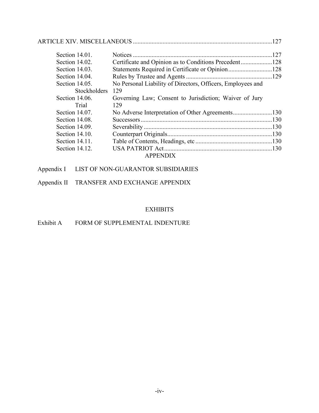 -iv- ARTICLE XIV. MISCELLANEOUS .........................................................................................127 Section 14.01. Notices .........................................................................................127 Section 14.02. Certificate and Opinion as to Conditions Precedent ....................128 Section 14.03. Statements Required in Certificate or Opinion ............................128 Section 14.04. Rules by Trustee and Agents .......................................................129 Section 14.05. No Personal Liability of Directors, Officers, Employees and Stockholders 129 Section 14.06. Governing Law; Consent to Jurisdiction; Waiver of Jury Trial 129 Section 14.07. No Adverse Interpretation of Other Agreements .........................130 Section 14.08. Successors ....................................................................................130 Section 14.09. Severability ..................................................................................130 Section 14.10. Counterpart Originals...................................................................130 Section 14.11. Table of Contents, Headings, etc .................................................130 Section 14.12. USA PATRIOT Act .....................................................................130 APPENDIX Appendix I LIST OF NON-GUARANTOR SUBSIDIARIES Appendix II TRANSFER AND EXCHANGE APPENDIX EXHIBITS Exhibit A FORM OF SUPPLEMENTAL INDENTURE