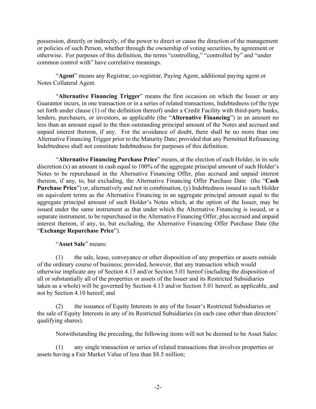 -2- possession, directly or indirectly, of the power to direct or cause the direction of the management or policies of such Person, whether through the ownership of voting securities, by agreement or otherwise. For purposes of this definition, the terms “controlling,” “controlled by” and “under common control with” have correlative meanings. “Agent” means any Registrar, co-registrar, Paying Agent, additional paying agent or Notes Collateral Agent. “Alternative Financing Trigger” means the first occasion on which the Issuer or any Guarantor incurs, in one transaction or in a series of related transactions, Indebtedness (of the type set forth under clause (1) of the definition thereof) under a Credit Facility with third-party banks, lenders, purchasers, or investors, as applicable (the “Alternative Financing”) in an amount no less than an amount equal to the then outstanding principal amount of the Notes and accrued and unpaid interest thereon, if any. For the avoidance of doubt, there shall be no more than one Alternative Financing Trigger prior to the Maturity Date; provided that any Permitted Refinancing Indebtedness shall not constitute Indebtedness for purposes of this definition. “Alternative Financing Purchase Price” means, at the election of each Holder, in its sole discretion (x) an amount in cash equal to 100% of the aggregate principal amount of such Holder’s Notes to be repurchased in the Alternative Financing Offer, plus accrued and unpaid interest thereon, if any, to, but excluding, the Alternative Financing Offer Purchase Date (the “Cash Purchase Price”) or, alternatively and not in combination, (y) Indebtedness issued to such Holder on equivalent terms as the Alternative Financing in an aggregate principal amount equal to the aggregate principal amount of such Holder’s Notes which, at the option of the Issuer, may be issued under the same instrument as that under which the Alternative Financing is issued, or a separate instrument, to be repurchased in the Alternative Financing Offer, plus accrued and unpaid interest thereon, if any, to, but excluding, the Alternative Financing Offer Purchase Date (the “Exchange Repurchase Price”). “Asset Sale” means: (1) the sale, lease, conveyance or other disposition of any properties or assets outside of the ordinary course of business; provided, however, that any transaction which would otherwise implicate any of Section 4.13 and/or Section 5.01 hereof (including the disposition of all or substantially all of the properties or assets of the Issuer and its Restricted Subsidiaries taken as a whole) will be governed by Section 4.13 and/or Section 5.01 hereof, as applicable, and not by Section 4.10 hereof; and (2) the issuance of Equity Interests in any of the Issuer’s Restricted Subsidiaries or the sale of Equity Interests in any of its Restricted Subsidiaries (in each case other than directors’ qualifying shares). Notwithstanding the preceding, the following items will not be deemed to be Asset Sales: (1) any single transaction or series of related transactions that involves properties or assets having a Fair Market Value of less than $8.5 million;