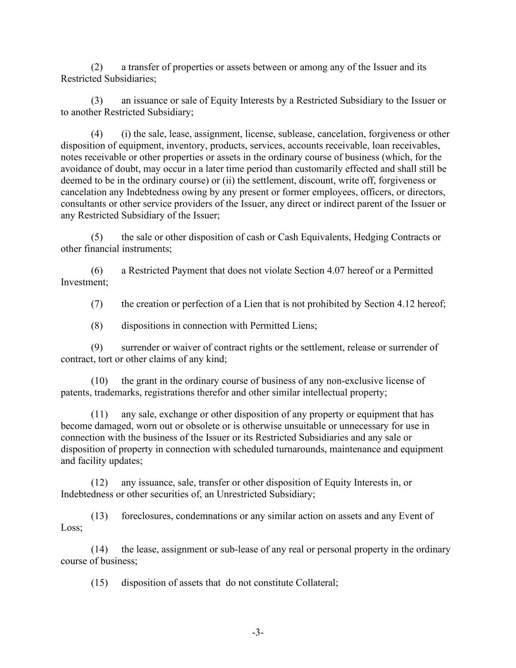 -3- (2) a transfer of properties or assets between or among any of the Issuer and its Restricted Subsidiaries; (3) an issuance or sale of Equity Interests by a Restricted Subsidiary to the Issuer or to another Restricted Subsidiary; (4) (i) the sale, lease, assignment, license, sublease, cancelation, forgiveness or other disposition of equipment, inventory, products, services, accounts receivable, loan receivables, notes receivable or other properties or assets in the ordinary course of business (which, for the avoidance of doubt, may occur in a later time period than customarily effected and shall still be deemed to be in the ordinary course) or (ii) the settlement, discount, write off, forgiveness or cancelation any Indebtedness owing by any present or former employees, officers, or directors, consultants or other service providers of the Issuer, any direct or indirect parent of the Issuer or any Restricted Subsidiary of the Issuer; (5) the sale or other disposition of cash or Cash Equivalents, Hedging Contracts or other financial instruments; (6) a Restricted Payment that does not violate Section 4.07 hereof or a Permitted Investment; (7) the creation or perfection of a Lien that is not prohibited by Section 4.12 hereof; (8) dispositions in connection with Permitted Liens; (9) surrender or waiver of contract rights or the settlement, release or surrender of contract, tort or other claims of any kind; (10) the grant in the ordinary course of business of any non-exclusive license of patents, trademarks, registrations therefor and other similar intellectual property; (11) any sale, exchange or other disposition of any property or equipment that has become damaged, worn out or obsolete or is otherwise unsuitable or unnecessary for use in connection with the business of the Issuer or its Restricted Subsidiaries and any sale or disposition of property in connection with scheduled turnarounds, maintenance and equipment and facility updates; (12) any issuance, sale, transfer or other disposition of Equity Interests in, or Indebtedness or other securities of, an Unrestricted Subsidiary; (13) foreclosures, condemnations or any similar action on assets and any Event of Loss; (14) the lease, assignment or sub-lease of any real or personal property in the ordinary course of business; (15) disposition of assets that do not constitute Collateral;