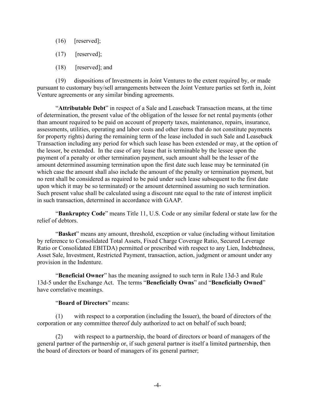 -4- (16) [reserved]; (17) [reserved]; (18) [reserved]; and (19) dispositions of Investments in Joint Ventures to the extent required by, or made pursuant to customary buy/sell arrangements between the Joint Venture parties set forth in, Joint Venture agreements or any similar binding agreements. “Attributable Debt” in respect of a Sale and Leaseback Transaction means, at the time of determination, the present value of the obligation of the lessee for net rental payments (other than amount required to be paid on account of property taxes, maintenance, repairs, insurance, assessments, utilities, operating and labor costs and other items that do not constitute payments for property rights) during the remaining term of the lease included in such Sale and Leaseback Transaction including any period for which such lease has been extended or may, at the option of the lessor, be extended. In the case of any lease that is terminable by the lessee upon the payment of a penalty or other termination payment, such amount shall be the lesser of the amount determined assuming termination upon the first date such lease may be terminated (in which case the amount shall also include the amount of the penalty or termination payment, but no rent shall be considered as required to be paid under such lease subsequent to the first date upon which it may be so terminated) or the amount determined assuming no such termination. Such present value shall be calculated using a discount rate equal to the rate of interest implicit in such transaction, determined in accordance with GAAP. “Bankruptcy Code” means Title 11, U.S. Code or any similar federal or state law for the relief of debtors. “Basket” means any amount, threshold, exception or value (including without limitation by reference to Consolidated Total Assets, Fixed Charge Coverage Ratio, Secured Leverage Ratio or Consolidated EBITDA) permitted or prescribed with respect to any Lien, Indebtedness, Asset Sale, Investment, Restricted Payment, transaction, action, judgment or amount under any provision in the Indenture. “Beneficial Owner” has the meaning assigned to such term in Rule 13d-3 and Rule 13d-5 under the Exchange Act. The terms “Beneficially Owns” and “Beneficially Owned” have correlative meanings. “Board of Directors” means: (1) with respect to a corporation (including the Issuer), the board of directors of the corporation or any committee thereof duly authorized to act on behalf of such board; (2) with respect to a partnership, the board of directors or board of managers of the general partner of the partnership or, if such general partner is itself a limited partnership, then the board of directors or board of managers of its general partner;