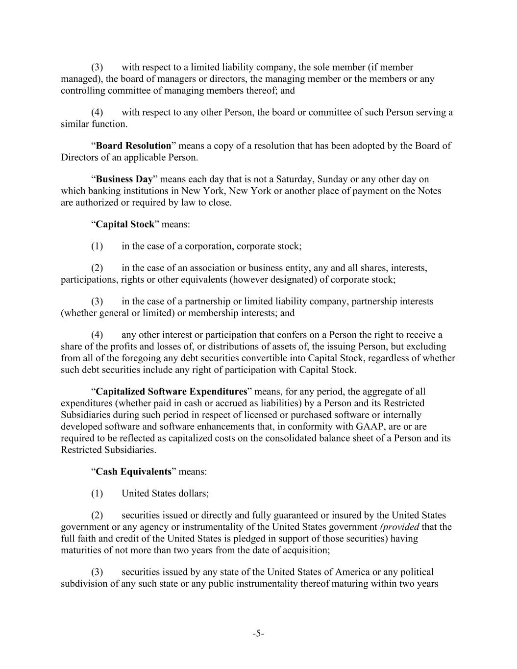 -5- (3) with respect to a limited liability company, the sole member (if member managed), the board of managers or directors, the managing member or the members or any controlling committee of managing members thereof; and (4) with respect to any other Person, the board or committee of such Person serving a similar function. “Board Resolution” means a copy of a resolution that has been adopted by the Board of Directors of an applicable Person. “Business Day” means each day that is not a Saturday, Sunday or any other day on which banking institutions in New York, New York or another place of payment on the Notes are authorized or required by law to close. “Capital Stock” means: (1) in the case of a corporation, corporate stock; (2) in the case of an association or business entity, any and all shares, interests, participations, rights or other equivalents (however designated) of corporate stock; (3) in the case of a partnership or limited liability company, partnership interests (whether general or limited) or membership interests; and (4) any other interest or participation that confers on a Person the right to receive a share of the profits and losses of, or distributions of assets of, the issuing Person, but excluding from all of the foregoing any debt securities convertible into Capital Stock, regardless of whether such debt securities include any right of participation with Capital Stock. “Capitalized Software Expenditures” means, for any period, the aggregate of all expenditures (whether paid in cash or accrued as liabilities) by a Person and its Restricted Subsidiaries during such period in respect of licensed or purchased software or internally developed software and software enhancements that, in conformity with GAAP, are or are required to be reflected as capitalized costs on the consolidated balance sheet of a Person and its Restricted Subsidiaries. “Cash Equivalents” means: (1) United States dollars; (2) securities issued or directly and fully guaranteed or insured by the United States government or any agency or instrumentality of the United States government (provided that the full faith and credit of the United States is pledged in support of those securities) having maturities of not more than two years from the date of acquisition; (3) securities issued by any state of the United States of America or any political subdivision of any such state or any public instrumentality thereof maturing within two years
