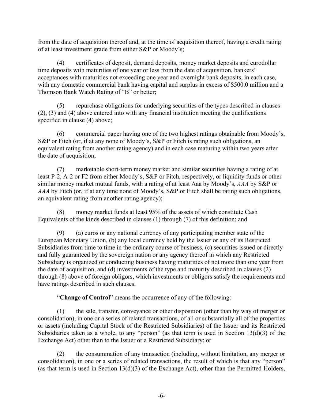 -6- from the date of acquisition thereof and, at the time of acquisition thereof, having a credit rating of at least investment grade from either S&P or Moody’s; (4) certificates of deposit, demand deposits, money market deposits and eurodollar time deposits with maturities of one year or less from the date of acquisition, bankers’ acceptances with maturities not exceeding one year and overnight bank deposits, in each case, with any domestic commercial bank having capital and surplus in excess of $500.0 million and a Thomson Bank Watch Rating of “B” or better; (5) repurchase obligations for underlying securities of the types described in clauses (2), (3) and (4) above entered into with any financial institution meeting the qualifications specified in clause (4) above; (6) commercial paper having one of the two highest ratings obtainable from Moody’s, S&P or Fitch (or, if at any none of Moody’s, S&P or Fitch is rating such obligations, an equivalent rating from another rating agency) and in each case maturing within two years after the date of acquisition; (7) marketable short-term money market and similar securities having a rating of at least P-2, A-2 or F2 from either Moody’s, S&P or Fitch, respectively, or liquidity funds or other similar money market mutual funds, with a rating of at least Aaa by Moody’s, AAA by S&P or AAA by Fitch (or, if at any time none of Moody’s, S&P or Fitch shall be rating such obligations, an equivalent rating from another rating agency); (8) money market funds at least 95% of the assets of which constitute Cash Equivalents of the kinds described in clauses (1) through (7) of this definition; and (9) (a) euros or any national currency of any participating member state of the European Monetary Union, (b) any local currency held by the Issuer or any of its Restricted Subsidiaries from time to time in the ordinary course of business, (c) securities issued or directly and fully guaranteed by the sovereign nation or any agency thereof in which any Restricted Subsidiary is organized or conducting business having maturities of not more than one year from the date of acquisition, and (d) investments of the type and maturity described in clauses (2) through (8) above of foreign obligors, which investments or obligors satisfy the requirements and have ratings described in such clauses. “Change of Control” means the occurrence of any of the following: (1) the sale, transfer, conveyance or other disposition (other than by way of merger or consolidation), in one or a series of related transactions, of all or substantially all of the properties or assets (including Capital Stock of the Restricted Subsidiaries) of the Issuer and its Restricted Subsidiaries taken as a whole, to any “person” (as that term is used in Section 13(d)(3) of the Exchange Act) other than to the Issuer or a Restricted Subsidiary; or (2) the consummation of any transaction (including, without limitation, any merger or consolidation), in one or a series of related transactions, the result of which is that any “person” (as that term is used in Section 13(d)(3) of the Exchange Act), other than the Permitted Holders,