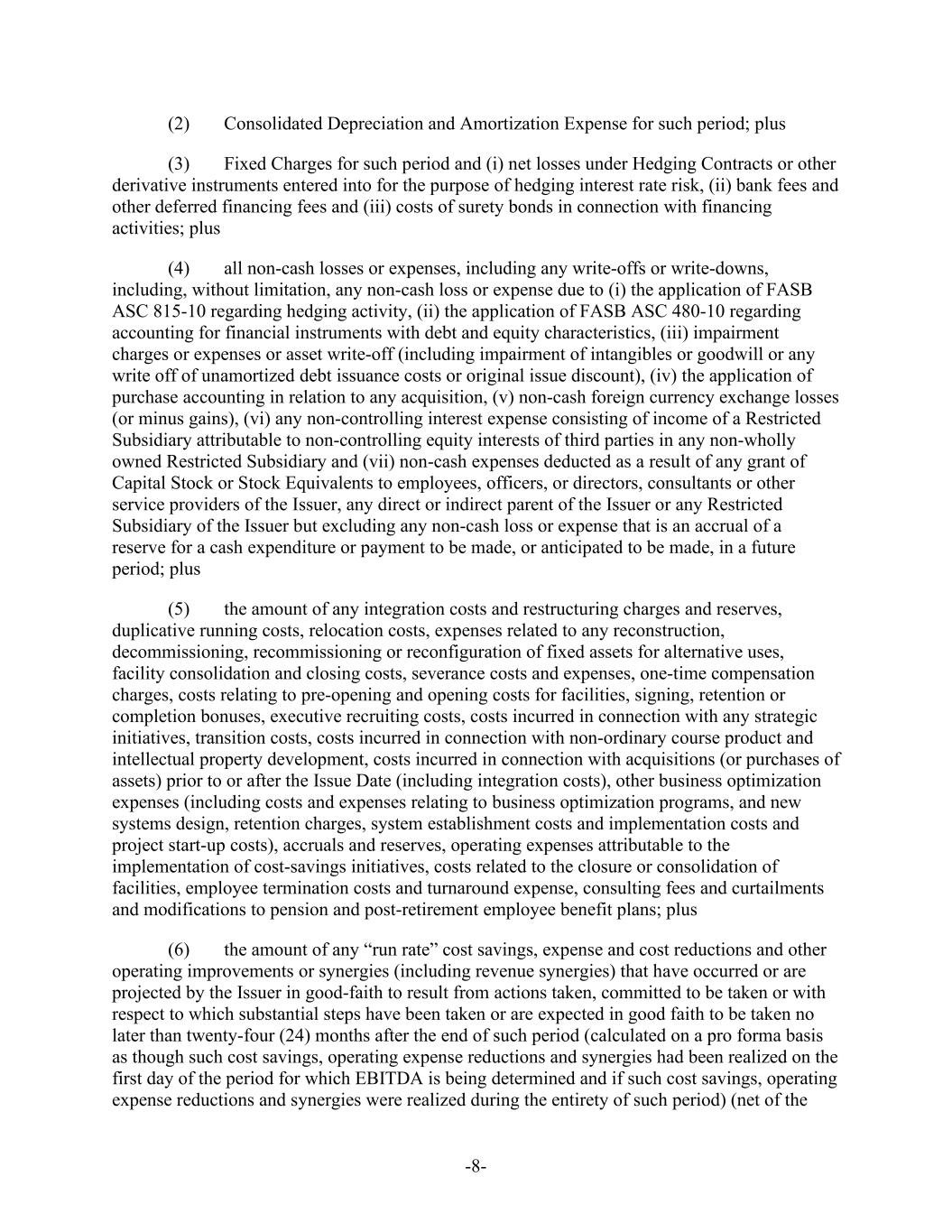 -8- (2) Consolidated Depreciation and Amortization Expense for such period; plus (3) Fixed Charges for such period and (i) net losses under Hedging Contracts or other derivative instruments entered into for the purpose of hedging interest rate risk, (ii) bank fees and other deferred financing fees and (iii) costs of surety bonds in connection with financing activities; plus (4) all non-cash losses or expenses, including any write-offs or write-downs, including, without limitation, any non-cash loss or expense due to (i) the application of FASB ASC 815-10 regarding hedging activity, (ii) the application of FASB ASC 480-10 regarding accounting for financial instruments with debt and equity characteristics, (iii) impairment charges or expenses or asset write-off (including impairment of intangibles or goodwill or any write off of unamortized debt issuance costs or original issue discount), (iv) the application of purchase accounting in relation to any acquisition, (v) non-cash foreign currency exchange losses (or minus gains), (vi) any non-controlling interest expense consisting of income of a Restricted Subsidiary attributable to non-controlling equity interests of third parties in any non-wholly owned Restricted Subsidiary and (vii) non-cash expenses deducted as a result of any grant of Capital Stock or Stock Equivalents to employees, officers, or directors, consultants or other service providers of the Issuer, any direct or indirect parent of the Issuer or any Restricted Subsidiary of the Issuer but excluding any non-cash loss or expense that is an accrual of a reserve for a cash expenditure or payment to be made, or anticipated to be made, in a future period; plus (5) the amount of any integration costs and restructuring charges and reserves, duplicative running costs, relocation costs, expenses related to any reconstruction, decommissioning, recommissioning or reconfiguration of fixed assets for alternative uses, facility consolidation and closing costs, severance costs and expenses, one-time compensation charges, costs relating to pre-opening and opening costs for facilities, signing, retention or completion bonuses, executive recruiting costs, costs incurred in connection with any strategic initiatives, transition costs, costs incurred in connection with non-ordinary course product and intellectual property development, costs incurred in connection with acquisitions (or purchases of assets) prior to or after the Issue Date (including integration costs), other business optimization expenses (including costs and expenses relating to business optimization programs, and new systems design, retention charges, system establishment costs and implementation costs and project start-up costs), accruals and reserves, operating expenses attributable to the implementation of cost-savings initiatives, costs related to the closure or consolidation of facilities, employee termination costs and turnaround expense, consulting fees and curtailments and modifications to pension and post-retirement employee benefit plans; plus (6) the amount of any “run rate” cost savings, expense and cost reductions and other operating improvements or synergies (including revenue synergies) that have occurred or are projected by the Issuer in good-faith to result from actions taken, committed to be taken or with respect to which substantial steps have been taken or are expected in good faith to be taken no later than twenty-four (24) months after the end of such period (calculated on a pro forma basis as though such cost savings, operating expense reductions and synergies had been realized on the first day of the period for which EBITDA is being determined and if such cost savings, operating expense reductions and synergies were realized during the entirety of such period) (net of the
