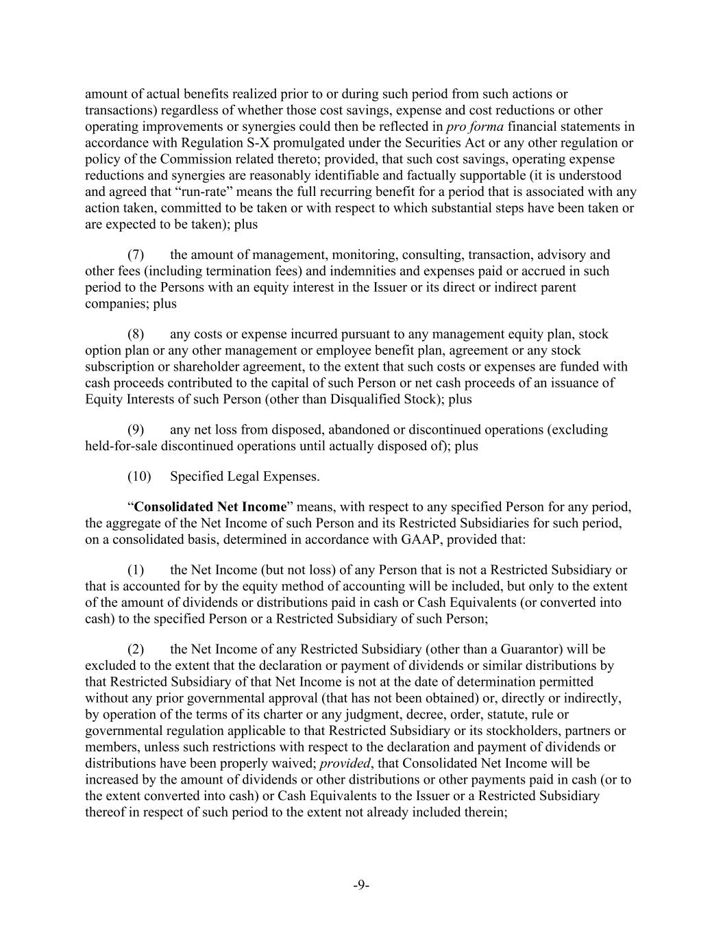 -9- amount of actual benefits realized prior to or during such period from such actions or transactions) regardless of whether those cost savings, expense and cost reductions or other operating improvements or synergies could then be reflected in pro forma financial statements in accordance with Regulation S-X promulgated under the Securities Act or any other regulation or policy of the Commission related thereto; provided, that such cost savings, operating expense reductions and synergies are reasonably identifiable and factually supportable (it is understood and agreed that “run-rate” means the full recurring benefit for a period that is associated with any action taken, committed to be taken or with respect to which substantial steps have been taken or are expected to be taken); plus (7) the amount of management, monitoring, consulting, transaction, advisory and other fees (including termination fees) and indemnities and expenses paid or accrued in such period to the Persons with an equity interest in the Issuer or its direct or indirect parent companies; plus (8) any costs or expense incurred pursuant to any management equity plan, stock option plan or any other management or employee benefit plan, agreement or any stock subscription or shareholder agreement, to the extent that such costs or expenses are funded with cash proceeds contributed to the capital of such Person or net cash proceeds of an issuance of Equity Interests of such Person (other than Disqualified Stock); plus (9) any net loss from disposed, abandoned or discontinued operations (excluding held-for-sale discontinued operations until actually disposed of); plus (10) Specified Legal Expenses. “Consolidated Net Income” means, with respect to any specified Person for any period, the aggregate of the Net Income of such Person and its Restricted Subsidiaries for such period, on a consolidated basis, determined in accordance with GAAP, provided that: (1) the Net Income (but not loss) of any Person that is not a Restricted Subsidiary or that is accounted for by the equity method of accounting will be included, but only to the extent of the amount of dividends or distributions paid in cash or Cash Equivalents (or converted into cash) to the specified Person or a Restricted Subsidiary of such Person; (2) the Net Income of any Restricted Subsidiary (other than a Guarantor) will be excluded to the extent that the declaration or payment of dividends or similar distributions by that Restricted Subsidiary of that Net Income is not at the date of determination permitted without any prior governmental approval (that has not been obtained) or, directly or indirectly, by operation of the terms of its charter or any judgment, decree, order, statute, rule or governmental regulation applicable to that Restricted Subsidiary or its stockholders, partners or members, unless such restrictions with respect to the declaration and payment of dividends or distributions have been properly waived; provided, that Consolidated Net Income will be increased by the amount of dividends or other distributions or other payments paid in cash (or to the extent converted into cash) or Cash Equivalents to the Issuer or a Restricted Subsidiary thereof in respect of such period to the extent not already included therein;