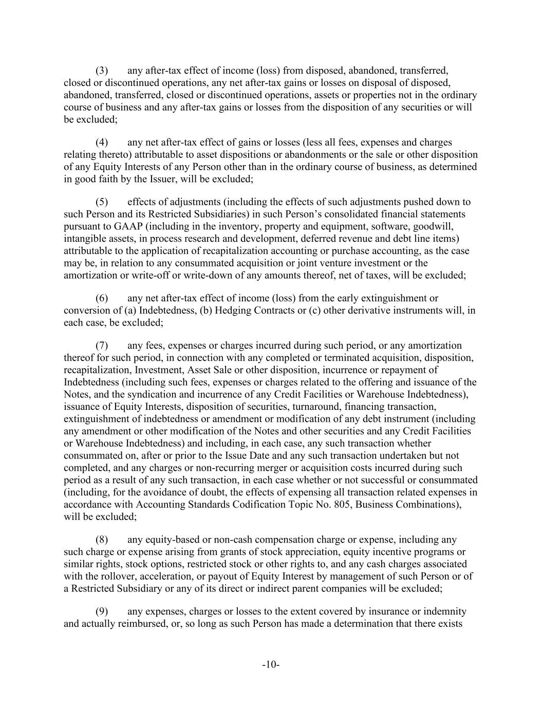 -10- (3) any after-tax effect of income (loss) from disposed, abandoned, transferred, closed or discontinued operations, any net after-tax gains or losses on disposal of disposed, abandoned, transferred, closed or discontinued operations, assets or properties not in the ordinary course of business and any after-tax gains or losses from the disposition of any securities or will be excluded; (4) any net after-tax effect of gains or losses (less all fees, expenses and charges relating thereto) attributable to asset dispositions or abandonments or the sale or other disposition of any Equity Interests of any Person other than in the ordinary course of business, as determined in good faith by the Issuer, will be excluded; (5) effects of adjustments (including the effects of such adjustments pushed down to such Person and its Restricted Subsidiaries) in such Person’s consolidated financial statements pursuant to GAAP (including in the inventory, property and equipment, software, goodwill, intangible assets, in process research and development, deferred revenue and debt line items) attributable to the application of recapitalization accounting or purchase accounting, as the case may be, in relation to any consummated acquisition or joint venture investment or the amortization or write-off or write-down of any amounts thereof, net of taxes, will be excluded; (6) any net after-tax effect of income (loss) from the early extinguishment or conversion of (a) Indebtedness, (b) Hedging Contracts or (c) other derivative instruments will, in each case, be excluded; (7) any fees, expenses or charges incurred during such period, or any amortization thereof for such period, in connection with any completed or terminated acquisition, disposition, recapitalization, Investment, Asset Sale or other disposition, incurrence or repayment of Indebtedness (including such fees, expenses or charges related to the offering and issuance of the Notes, and the syndication and incurrence of any Credit Facilities or Warehouse Indebtedness), issuance of Equity Interests, disposition of securities, turnaround, financing transaction, extinguishment of indebtedness or amendment or modification of any debt instrument (including any amendment or other modification of the Notes and other securities and any Credit Facilities or Warehouse Indebtedness) and including, in each case, any such transaction whether consummated on, after or prior to the Issue Date and any such transaction undertaken but not completed, and any charges or non-recurring merger or acquisition costs incurred during such period as a result of any such transaction, in each case whether or not successful or consummated (including, for the avoidance of doubt, the effects of expensing all transaction related expenses in accordance with Accounting Standards Codification Topic No. 805, Business Combinations), will be excluded; (8) any equity-based or non-cash compensation charge or expense, including any such charge or expense arising from grants of stock appreciation, equity incentive programs or similar rights, stock options, restricted stock or other rights to, and any cash charges associated with the rollover, acceleration, or payout of Equity Interest by management of such Person or of a Restricted Subsidiary or any of its direct or indirect parent companies will be excluded; (9) any expenses, charges or losses to the extent covered by insurance or indemnity and actually reimbursed, or, so long as such Person has made a determination that there exists