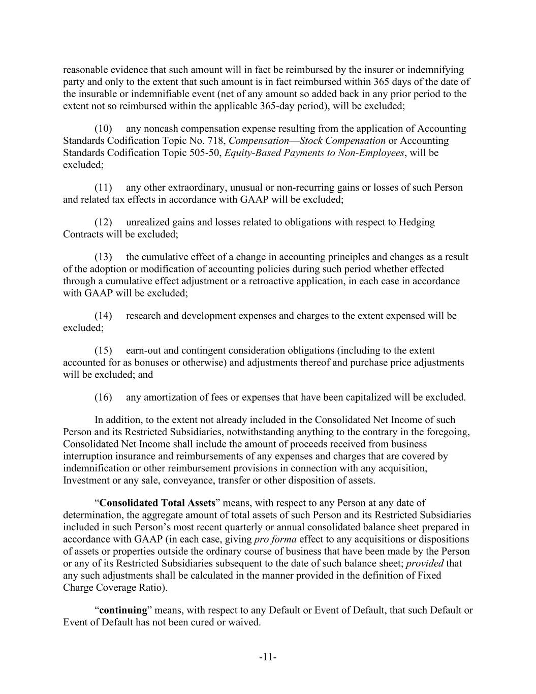 -11- reasonable evidence that such amount will in fact be reimbursed by the insurer or indemnifying party and only to the extent that such amount is in fact reimbursed within 365 days of the date of the insurable or indemnifiable event (net of any amount so added back in any prior period to the extent not so reimbursed within the applicable 365-day period), will be excluded; (10) any noncash compensation expense resulting from the application of Accounting Standards Codification Topic No. 718, Compensation—Stock Compensation or Accounting Standards Codification Topic 505-50, Equity-Based Payments to Non-Employees, will be excluded; (11) any other extraordinary, unusual or non-recurring gains or losses of such Person and related tax effects in accordance with GAAP will be excluded; (12) unrealized gains and losses related to obligations with respect to Hedging Contracts will be excluded; (13) the cumulative effect of a change in accounting principles and changes as a result of the adoption or modification of accounting policies during such period whether effected through a cumulative effect adjustment or a retroactive application, in each case in accordance with GAAP will be excluded; (14) research and development expenses and charges to the extent expensed will be excluded; (15) earn-out and contingent consideration obligations (including to the extent accounted for as bonuses or otherwise) and adjustments thereof and purchase price adjustments will be excluded; and (16) any amortization of fees or expenses that have been capitalized will be excluded. In addition, to the extent not already included in the Consolidated Net Income of such Person and its Restricted Subsidiaries, notwithstanding anything to the contrary in the foregoing, Consolidated Net Income shall include the amount of proceeds received from business interruption insurance and reimbursements of any expenses and charges that are covered by indemnification or other reimbursement provisions in connection with any acquisition, Investment or any sale, conveyance, transfer or other disposition of assets. “Consolidated Total Assets” means, with respect to any Person at any date of determination, the aggregate amount of total assets of such Person and its Restricted Subsidiaries included in such Person’s most recent quarterly or annual consolidated balance sheet prepared in accordance with GAAP (in each case, giving pro forma effect to any acquisitions or dispositions of assets or properties outside the ordinary course of business that have been made by the Person or any of its Restricted Subsidiaries subsequent to the date of such balance sheet; provided that any such adjustments shall be calculated in the manner provided in the definition of Fixed Charge Coverage Ratio). “continuing” means, with respect to any Default or Event of Default, that such Default or Event of Default has not been cured or waived.