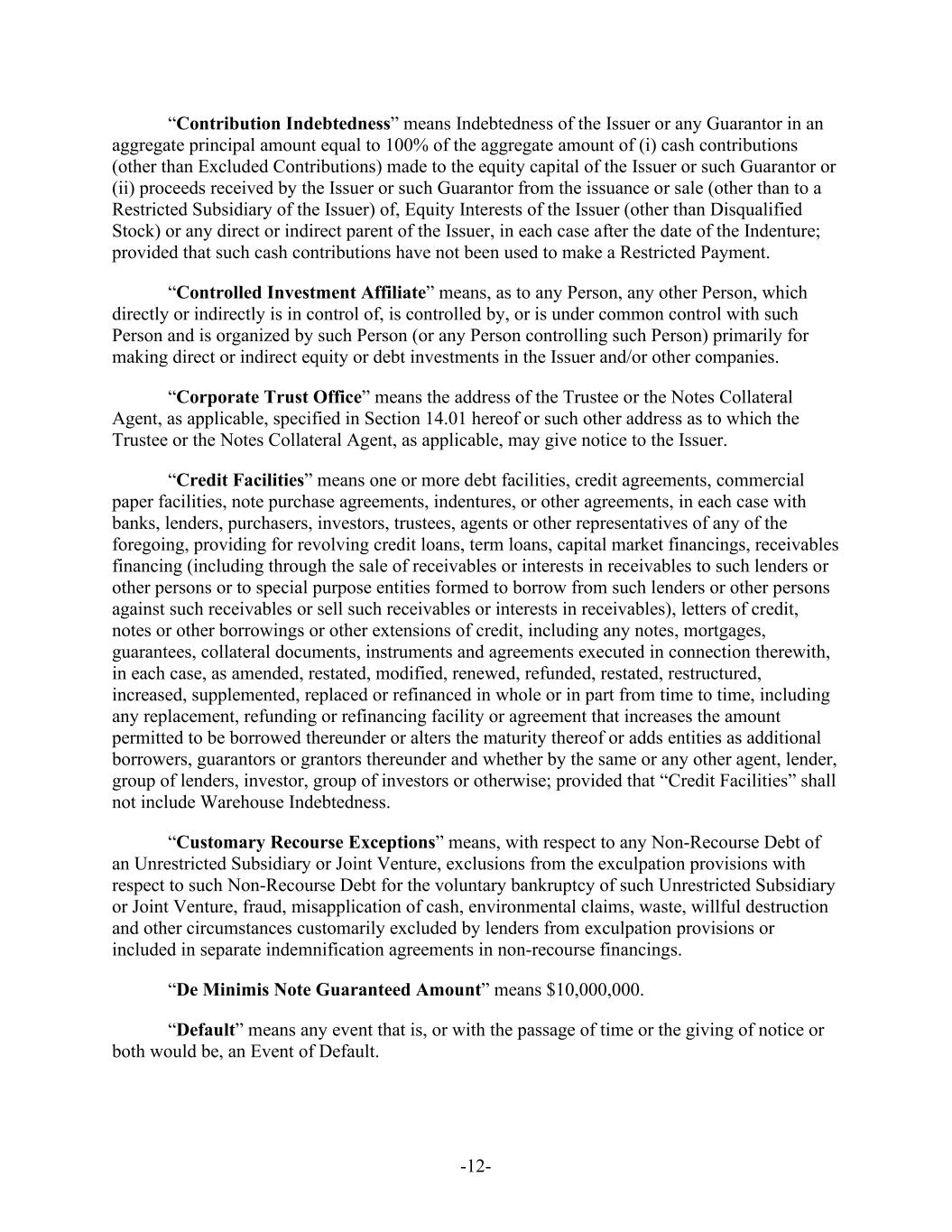 -12- “Contribution Indebtedness” means Indebtedness of the Issuer or any Guarantor in an aggregate principal amount equal to 100% of the aggregate amount of (i) cash contributions (other than Excluded Contributions) made to the equity capital of the Issuer or such Guarantor or (ii) proceeds received by the Issuer or such Guarantor from the issuance or sale (other than to a Restricted Subsidiary of the Issuer) of, Equity Interests of the Issuer (other than Disqualified Stock) or any direct or indirect parent of the Issuer, in each case after the date of the Indenture; provided that such cash contributions have not been used to make a Restricted Payment. “Controlled Investment Affiliate” means, as to any Person, any other Person, which directly or indirectly is in control of, is controlled by, or is under common control with such Person and is organized by such Person (or any Person controlling such Person) primarily for making direct or indirect equity or debt investments in the Issuer and/or other companies. “Corporate Trust Office” means the address of the Trustee or the Notes Collateral Agent, as applicable, specified in Section 14.01 hereof or such other address as to which the Trustee or the Notes Collateral Agent, as applicable, may give notice to the Issuer. “Credit Facilities” means one or more debt facilities, credit agreements, commercial paper facilities, note purchase agreements, indentures, or other agreements, in each case with banks, lenders, purchasers, investors, trustees, agents or other representatives of any of the foregoing, providing for revolving credit loans, term loans, capital market financings, receivables financing (including through the sale of receivables or interests in receivables to such lenders or other persons or to special purpose entities formed to borrow from such lenders or other persons against such receivables or sell such receivables or interests in receivables), letters of credit, notes or other borrowings or other extensions of credit, including any notes, mortgages, guarantees, collateral documents, instruments and agreements executed in connection therewith, in each case, as amended, restated, modified, renewed, refunded, restated, restructured, increased, supplemented, replaced or refinanced in whole or in part from time to time, including any replacement, refunding or refinancing facility or agreement that increases the amount permitted to be borrowed thereunder or alters the maturity thereof or adds entities as additional borrowers, guarantors or grantors thereunder and whether by the same or any other agent, lender, group of lenders, investor, group of investors or otherwise; provided that “Credit Facilities” shall not include Warehouse Indebtedness. “Customary Recourse Exceptions” means, with respect to any Non-Recourse Debt of an Unrestricted Subsidiary or Joint Venture, exclusions from the exculpation provisions with respect to such Non-Recourse Debt for the voluntary bankruptcy of such Unrestricted Subsidiary or Joint Venture, fraud, misapplication of cash, environmental claims, waste, willful destruction and other circumstances customarily excluded by lenders from exculpation provisions or included in separate indemnification agreements in non-recourse financings. “De Minimis Note Guaranteed Amount” means $10,000,000. “Default” means any event that is, or with the passage of time or the giving of notice or both would be, an Event of Default.