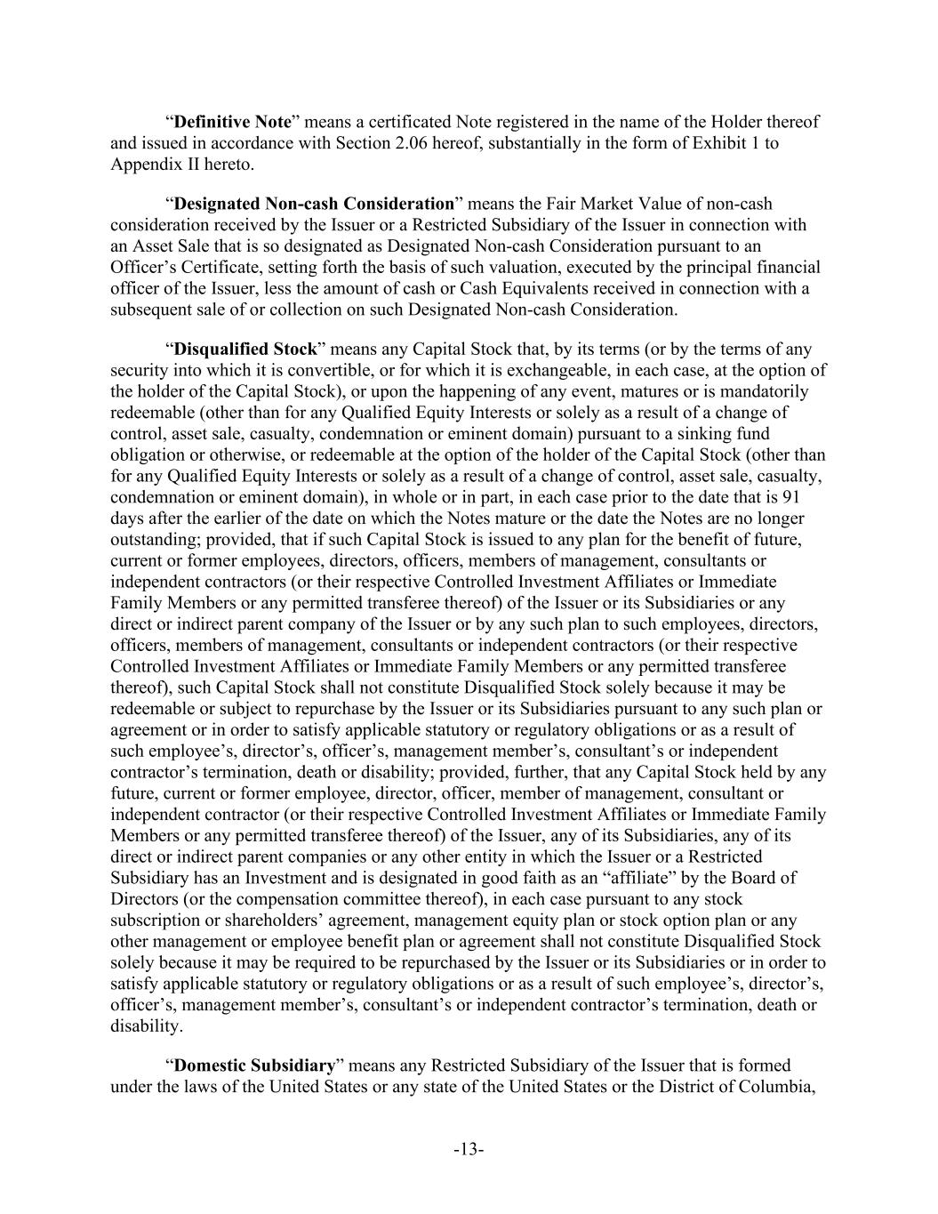 -13- “Definitive Note” means a certificated Note registered in the name of the Holder thereof and issued in accordance with Section 2.06 hereof, substantially in the form of Exhibit 1 to Appendix II hereto. “Designated Non-cash Consideration” means the Fair Market Value of non-cash consideration received by the Issuer or a Restricted Subsidiary of the Issuer in connection with an Asset Sale that is so designated as Designated Non-cash Consideration pursuant to an Officer’s Certificate, setting forth the basis of such valuation, executed by the principal financial officer of the Issuer, less the amount of cash or Cash Equivalents received in connection with a subsequent sale of or collection on such Designated Non-cash Consideration. “Disqualified Stock” means any Capital Stock that, by its terms (or by the terms of any security into which it is convertible, or for which it is exchangeable, in each case, at the option of the holder of the Capital Stock), or upon the happening of any event, matures or is mandatorily redeemable (other than for any Qualified Equity Interests or solely as a result of a change of control, asset sale, casualty, condemnation or eminent domain) pursuant to a sinking fund obligation or otherwise, or redeemable at the option of the holder of the Capital Stock (other than for any Qualified Equity Interests or solely as a result of a change of control, asset sale, casualty, condemnation or eminent domain), in whole or in part, in each case prior to the date that is 91 days after the earlier of the date on which the Notes mature or the date the Notes are no longer outstanding; provided, that if such Capital Stock is issued to any plan for the benefit of future, current or former employees, directors, officers, members of management, consultants or independent contractors (or their respective Controlled Investment Affiliates or Immediate Family Members or any permitted transferee thereof) of the Issuer or its Subsidiaries or any direct or indirect parent company of the Issuer or by any such plan to such employees, directors, officers, members of management, consultants or independent contractors (or their respective Controlled Investment Affiliates or Immediate Family Members or any permitted transferee thereof), such Capital Stock shall not constitute Disqualified Stock solely because it may be redeemable or subject to repurchase by the Issuer or its Subsidiaries pursuant to any such plan or agreement or in order to satisfy applicable statutory or regulatory obligations or as a result of such employee’s, director’s, officer’s, management member’s, consultant’s or independent contractor’s termination, death or disability; provided, further, that any Capital Stock held by any future, current or former employee, director, officer, member of management, consultant or independent contractor (or their respective Controlled Investment Affiliates or Immediate Family Members or any permitted transferee thereof) of the Issuer, any of its Subsidiaries, any of its direct or indirect parent companies or any other entity in which the Issuer or a Restricted Subsidiary has an Investment and is designated in good faith as an “affiliate” by the Board of Directors (or the compensation committee thereof), in each case pursuant to any stock subscription or shareholders’ agreement, management equity plan or stock option plan or any other management or employee benefit plan or agreement shall not constitute Disqualified Stock solely because it may be required to be repurchased by the Issuer or its Subsidiaries or in order to satisfy applicable statutory or regulatory obligations or as a result of such employee’s, director’s, officer’s, management member’s, consultant’s or independent contractor’s termination, death or disability. “Domestic Subsidiary” means any Restricted Subsidiary of the Issuer that is formed under the laws of the United States or any state of the United States or the District of Columbia,