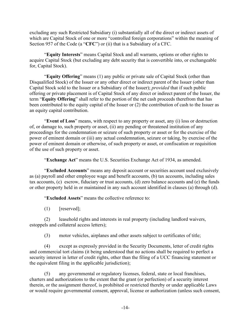 -14- excluding any such Restricted Subsidiary (i) substantially all of the direct or indirect assets of which are Capital Stock of one or more “controlled foreign corporations” within the meaning of Section 957 of the Code (a “CFC”) or (ii) that is a Subsidiary of a CFC. “Equity Interests” means Capital Stock and all warrants, options or other rights to acquire Capital Stock (but excluding any debt security that is convertible into, or exchangeable for, Capital Stock). “Equity Offering” means (1) any public or private sale of Capital Stock (other than Disqualified Stock) of the Issuer or any other direct or indirect parent of the Issuer (other than Capital Stock sold to the Issuer or a Subsidiary of the Issuer); provided that if such public offering or private placement is of Capital Stock of any direct or indirect parent of the Issuer, the term “Equity Offering” shall refer to the portion of the net cash proceeds therefrom that has been contributed to the equity capital of the Issuer or (2) the contribution of cash to the Issuer as an equity capital contribution. “Event of Loss” means, with respect to any property or asset, any (i) loss or destruction of, or damage to, such property or asset, (ii) any pending or threatened institution of any proceedings for the condemnation or seizure of such property or asset or for the exercise of the power of eminent domain or (iii) any actual condemnation, seizure or taking, by exercise of the power of eminent domain or otherwise, of such property or asset, or confiscation or requisition of the use of such property or asset. “Exchange Act” means the U.S. Securities Exchange Act of 1934, as amended. “Excluded Accounts” means any deposit account or securities account used exclusively as (a) payroll and other employee wage and benefit accounts, (b) tax accounts, including sales tax accounts, (c) escrow, fiduciary or trust accounts, (d) zero balance accounts and (e) the funds or other property held in or maintained in any such account identified in clauses (a) through (d). “Excluded Assets” means the collective reference to: (1) [reserved]; (2) leasehold rights and interests in real property (including landlord waivers, estoppels and collateral access letters); (3) motor vehicles, airplanes and other assets subject to certificates of title; (4) except as expressly provided in the Security Documents, letter of credit rights and commercial tort claims (it being understood that no actions shall be required to perfect a security interest in letter of credit rights, other than the filing of a UCC financing statement or the equivalent filing in the applicable jurisdiction); (5) any governmental or regulatory licenses, federal, state or local franchises, charters and authorizations to the extent that the grant (or perfection) of a security interest therein, or the assignment thereof, is prohibited or restricted thereby or under applicable Laws or would require governmental consent, approval, license or authorization (unless such consent,