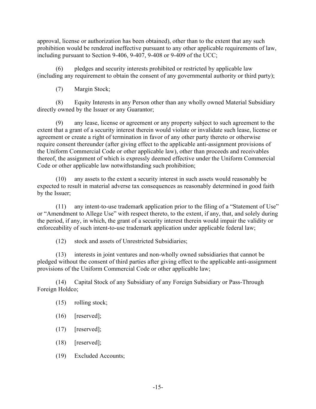 -15- approval, license or authorization has been obtained), other than to the extent that any such prohibition would be rendered ineffective pursuant to any other applicable requirements of law, including pursuant to Section 9-406, 9-407, 9-408 or 9-409 of the UCC; (6) pledges and security interests prohibited or restricted by applicable law (including any requirement to obtain the consent of any governmental authority or third party); (7) Margin Stock; (8) Equity Interests in any Person other than any wholly owned Material Subsidiary directly owned by the Issuer or any Guarantor; (9) any lease, license or agreement or any property subject to such agreement to the extent that a grant of a security interest therein would violate or invalidate such lease, license or agreement or create a right of termination in favor of any other party thereto or otherwise require consent thereunder (after giving effect to the applicable anti-assignment provisions of the Uniform Commercial Code or other applicable law), other than proceeds and receivables thereof, the assignment of which is expressly deemed effective under the Uniform Commercial Code or other applicable law notwithstanding such prohibition; (10) any assets to the extent a security interest in such assets would reasonably be expected to result in material adverse tax consequences as reasonably determined in good faith by the Issuer; (11) any intent-to-use trademark application prior to the filing of a “Statement of Use” or “Amendment to Allege Use” with respect thereto, to the extent, if any, that, and solely during the period, if any, in which, the grant of a security interest therein would impair the validity or enforceability of such intent-to-use trademark application under applicable federal law; (12) stock and assets of Unrestricted Subsidiaries; (13) interests in joint ventures and non-wholly owned subsidiaries that cannot be pledged without the consent of third parties after giving effect to the applicable anti-assignment provisions of the Uniform Commercial Code or other applicable law; (14) Capital Stock of any Subsidiary of any Foreign Subsidiary or Pass-Through Foreign Holdco; (15) rolling stock; (16) [reserved]; (17) [reserved]; (18) [reserved]; (19) Excluded Accounts;