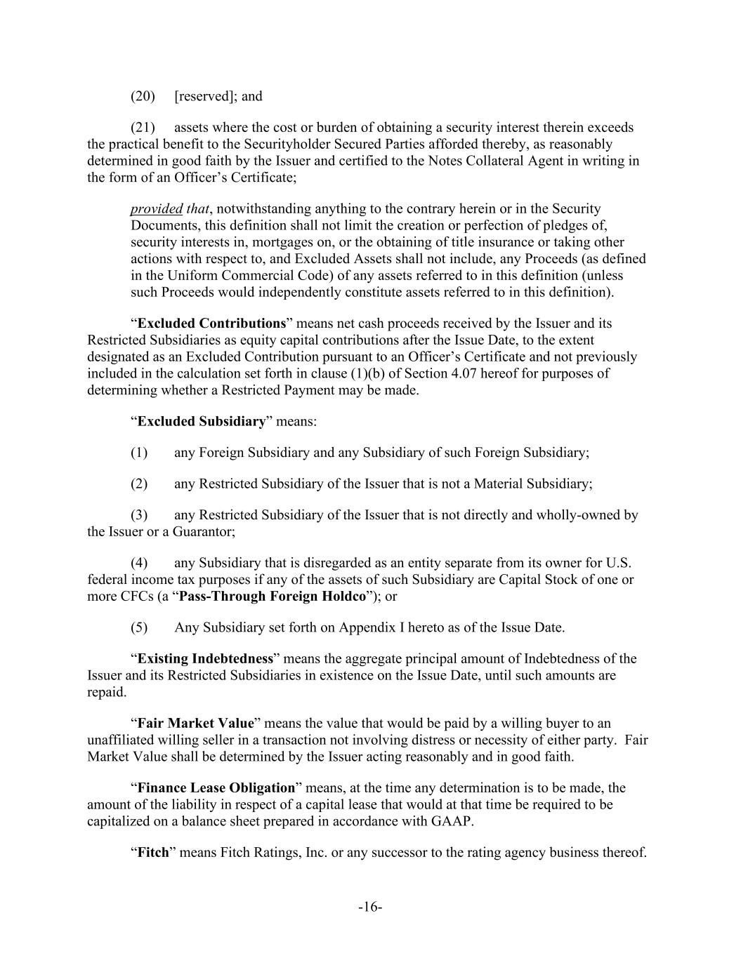 -16- (20) [reserved]; and (21) assets where the cost or burden of obtaining a security interest therein exceeds the practical benefit to the Securityholder Secured Parties afforded thereby, as reasonably determined in good faith by the Issuer and certified to the Notes Collateral Agent in writing in the form of an Officer’s Certificate; provided that, notwithstanding anything to the contrary herein or in the Security Documents, this definition shall not limit the creation or perfection of pledges of, security interests in, mortgages on, or the obtaining of title insurance or taking other actions with respect to, and Excluded Assets shall not include, any Proceeds (as defined in the Uniform Commercial Code) of any assets referred to in this definition (unless such Proceeds would independently constitute assets referred to in this definition). “Excluded Contributions” means net cash proceeds received by the Issuer and its Restricted Subsidiaries as equity capital contributions after the Issue Date, to the extent designated as an Excluded Contribution pursuant to an Officer’s Certificate and not previously included in the calculation set forth in clause (1)(b) of Section 4.07 hereof for purposes of determining whether a Restricted Payment may be made. “Excluded Subsidiary” means: (1) any Foreign Subsidiary and any Subsidiary of such Foreign Subsidiary; (2) any Restricted Subsidiary of the Issuer that is not a Material Subsidiary; (3) any Restricted Subsidiary of the Issuer that is not directly and wholly-owned by the Issuer or a Guarantor; (4) any Subsidiary that is disregarded as an entity separate from its owner for U.S. federal income tax purposes if any of the assets of such Subsidiary are Capital Stock of one or more CFCs (a “Pass-Through Foreign Holdco”); or (5) Any Subsidiary set forth on Appendix I hereto as of the Issue Date. “Existing Indebtedness” means the aggregate principal amount of Indebtedness of the Issuer and its Restricted Subsidiaries in existence on the Issue Date, until such amounts are repaid. “Fair Market Value” means the value that would be paid by a willing buyer to an unaffiliated willing seller in a transaction not involving distress or necessity of either party. Fair Market Value shall be determined by the Issuer acting reasonably and in good faith. “Finance Lease Obligation” means, at the time any determination is to be made, the amount of the liability in respect of a capital lease that would at that time be required to be capitalized on a balance sheet prepared in accordance with GAAP. “Fitch” means Fitch Ratings, Inc. or any successor to the rating agency business thereof.