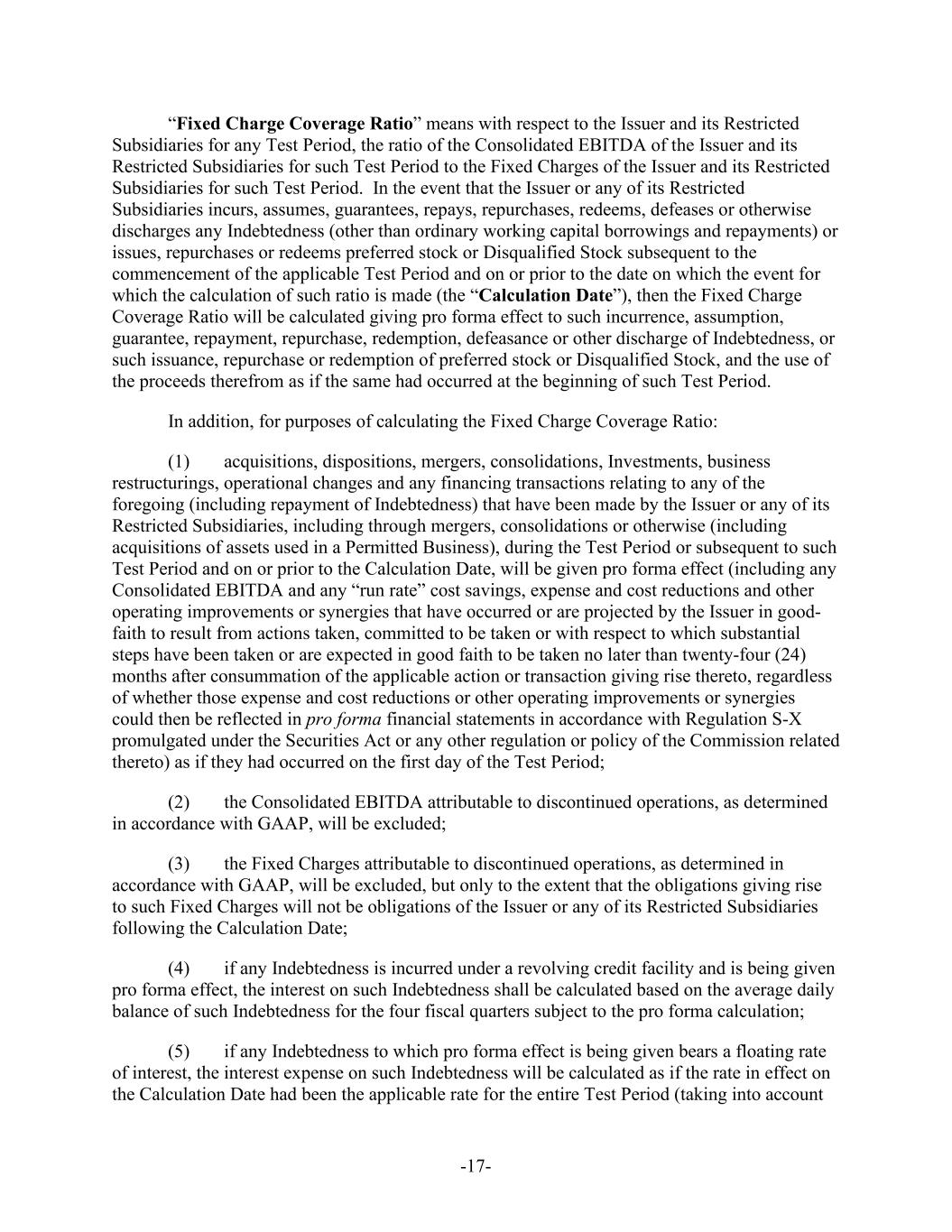 -17- “Fixed Charge Coverage Ratio” means with respect to the Issuer and its Restricted Subsidiaries for any Test Period, the ratio of the Consolidated EBITDA of the Issuer and its Restricted Subsidiaries for such Test Period to the Fixed Charges of the Issuer and its Restricted Subsidiaries for such Test Period. In the event that the Issuer or any of its Restricted Subsidiaries incurs, assumes, guarantees, repays, repurchases, redeems, defeases or otherwise discharges any Indebtedness (other than ordinary working capital borrowings and repayments) or issues, repurchases or redeems preferred stock or Disqualified Stock subsequent to the commencement of the applicable Test Period and on or prior to the date on which the event for which the calculation of such ratio is made (the “Calculation Date”), then the Fixed Charge Coverage Ratio will be calculated giving pro forma effect to such incurrence, assumption, guarantee, repayment, repurchase, redemption, defeasance or other discharge of Indebtedness, or such issuance, repurchase or redemption of preferred stock or Disqualified Stock, and the use of the proceeds therefrom as if the same had occurred at the beginning of such Test Period. In addition, for purposes of calculating the Fixed Charge Coverage Ratio: (1) acquisitions, dispositions, mergers, consolidations, Investments, business restructurings, operational changes and any financing transactions relating to any of the foregoing (including repayment of Indebtedness) that have been made by the Issuer or any of its Restricted Subsidiaries, including through mergers, consolidations or otherwise (including acquisitions of assets used in a Permitted Business), during the Test Period or subsequent to such Test Period and on or prior to the Calculation Date, will be given pro forma effect (including any Consolidated EBITDA and any “run rate” cost savings, expense and cost reductions and other operating improvements or synergies that have occurred or are projected by the Issuer in good- faith to result from actions taken, committed to be taken or with respect to which substantial steps have been taken or are expected in good faith to be taken no later than twenty-four (24) months after consummation of the applicable action or transaction giving rise thereto, regardless of whether those expense and cost reductions or other operating improvements or synergies could then be reflected in pro forma financial statements in accordance with Regulation S-X promulgated under the Securities Act or any other regulation or policy of the Commission related thereto) as if they had occurred on the first day of the Test Period; (2) the Consolidated EBITDA attributable to discontinued operations, as determined in accordance with GAAP, will be excluded; (3) the Fixed Charges attributable to discontinued operations, as determined in accordance with GAAP, will be excluded, but only to the extent that the obligations giving rise to such Fixed Charges will not be obligations of the Issuer or any of its Restricted Subsidiaries following the Calculation Date; (4) if any Indebtedness is incurred under a revolving credit facility and is being given pro forma effect, the interest on such Indebtedness shall be calculated based on the average daily balance of such Indebtedness for the four fiscal quarters subject to the pro forma calculation; (5) if any Indebtedness to which pro forma effect is being given bears a floating rate of interest, the interest expense on such Indebtedness will be calculated as if the rate in effect on the Calculation Date had been the applicable rate for the entire Test Period (taking into account