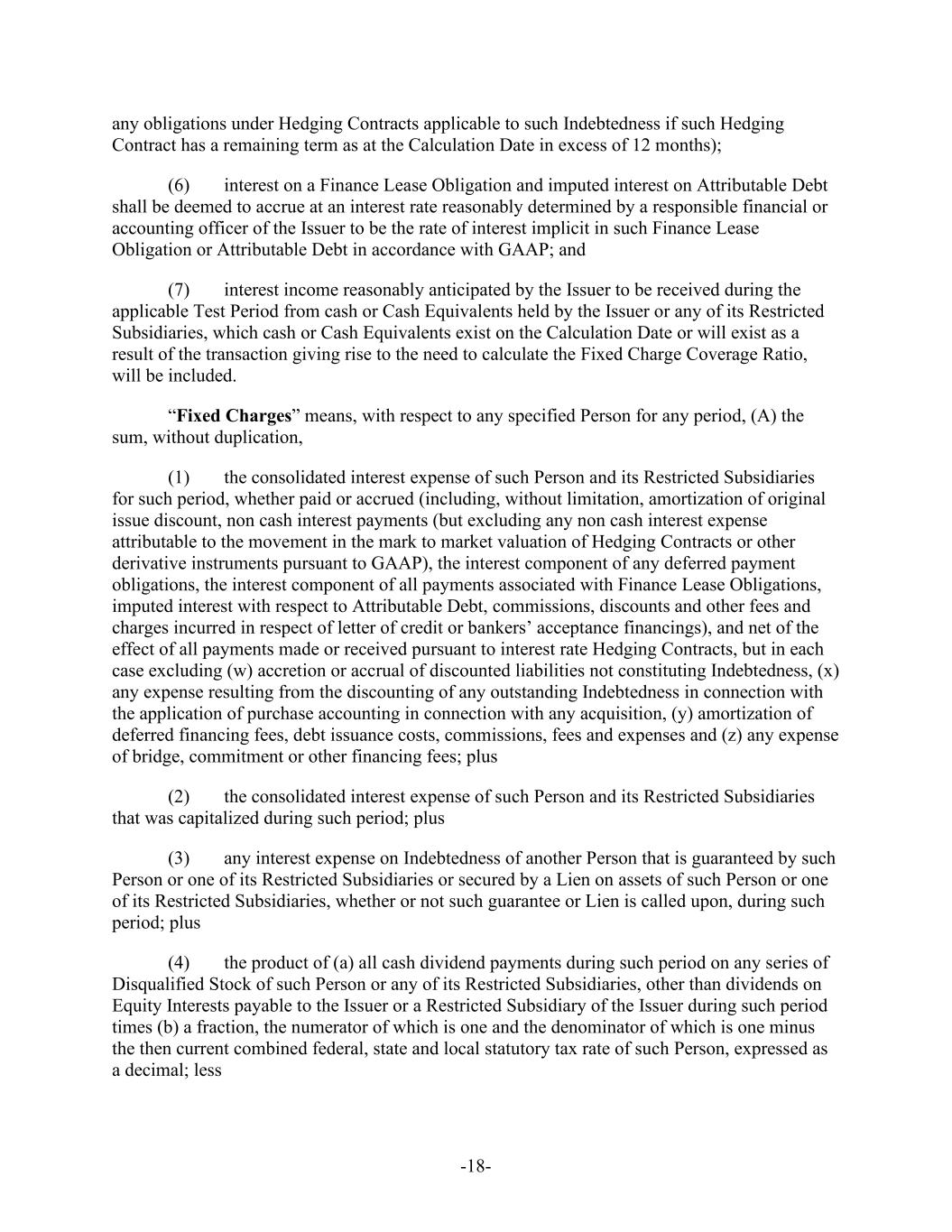 -18- any obligations under Hedging Contracts applicable to such Indebtedness if such Hedging Contract has a remaining term as at the Calculation Date in excess of 12 months); (6) interest on a Finance Lease Obligation and imputed interest on Attributable Debt shall be deemed to accrue at an interest rate reasonably determined by a responsible financial or accounting officer of the Issuer to be the rate of interest implicit in such Finance Lease Obligation or Attributable Debt in accordance with GAAP; and (7) interest income reasonably anticipated by the Issuer to be received during the applicable Test Period from cash or Cash Equivalents held by the Issuer or any of its Restricted Subsidiaries, which cash or Cash Equivalents exist on the Calculation Date or will exist as a result of the transaction giving rise to the need to calculate the Fixed Charge Coverage Ratio, will be included. “Fixed Charges” means, with respect to any specified Person for any period, (A) the sum, without duplication, (1) the consolidated interest expense of such Person and its Restricted Subsidiaries for such period, whether paid or accrued (including, without limitation, amortization of original issue discount, non cash interest payments (but excluding any non cash interest expense attributable to the movement in the mark to market valuation of Hedging Contracts or other derivative instruments pursuant to GAAP), the interest component of any deferred payment obligations, the interest component of all payments associated with Finance Lease Obligations, imputed interest with respect to Attributable Debt, commissions, discounts and other fees and charges incurred in respect of letter of credit or bankers’ acceptance financings), and net of the effect of all payments made or received pursuant to interest rate Hedging Contracts, but in each case excluding (w) accretion or accrual of discounted liabilities not constituting Indebtedness, (x) any expense resulting from the discounting of any outstanding Indebtedness in connection with the application of purchase accounting in connection with any acquisition, (y) amortization of deferred financing fees, debt issuance costs, commissions, fees and expenses and (z) any expense of bridge, commitment or other financing fees; plus (2) the consolidated interest expense of such Person and its Restricted Subsidiaries that was capitalized during such period; plus (3) any interest expense on Indebtedness of another Person that is guaranteed by such Person or one of its Restricted Subsidiaries or secured by a Lien on assets of such Person or one of its Restricted Subsidiaries, whether or not such guarantee or Lien is called upon, during such period; plus (4) the product of (a) all cash dividend payments during such period on any series of Disqualified Stock of such Person or any of its Restricted Subsidiaries, other than dividends on Equity Interests payable to the Issuer or a Restricted Subsidiary of the Issuer during such period times (b) a fraction, the numerator of which is one and the denominator of which is one minus the then current combined federal, state and local statutory tax rate of such Person, expressed as a decimal; less