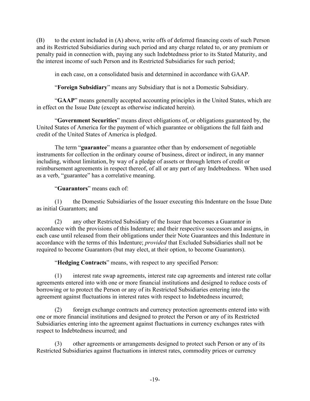 -19- (B) to the extent included in (A) above, write offs of deferred financing costs of such Person and its Restricted Subsidiaries during such period and any charge related to, or any premium or penalty paid in connection with, paying any such Indebtedness prior to its Stated Maturity, and the interest income of such Person and its Restricted Subsidiaries for such period; in each case, on a consolidated basis and determined in accordance with GAAP. “Foreign Subsidiary” means any Subsidiary that is not a Domestic Subsidiary. “GAAP” means generally accepted accounting principles in the United States, which are in effect on the Issue Date (except as otherwise indicated herein). “Government Securities” means direct obligations of, or obligations guaranteed by, the United States of America for the payment of which guarantee or obligations the full faith and credit of the United States of America is pledged. The term “guarantee” means a guarantee other than by endorsement of negotiable instruments for collection in the ordinary course of business, direct or indirect, in any manner including, without limitation, by way of a pledge of assets or through letters of credit or reimbursement agreements in respect thereof, of all or any part of any Indebtedness. When used as a verb, “guarantee” has a correlative meaning. “Guarantors” means each of: (1) the Domestic Subsidiaries of the Issuer executing this Indenture on the Issue Date as initial Guarantors; and (2) any other Restricted Subsidiary of the Issuer that becomes a Guarantor in accordance with the provisions of this Indenture; and their respective successors and assigns, in each case until released from their obligations under their Note Guarantees and this Indenture in accordance with the terms of this Indenture; provided that Excluded Subsidiaries shall not be required to become Guarantors (but may elect, at their option, to become Guarantors). “Hedging Contracts” means, with respect to any specified Person: (1) interest rate swap agreements, interest rate cap agreements and interest rate collar agreements entered into with one or more financial institutions and designed to reduce costs of borrowing or to protect the Person or any of its Restricted Subsidiaries entering into the agreement against fluctuations in interest rates with respect to Indebtedness incurred; (2) foreign exchange contracts and currency protection agreements entered into with one or more financial institutions and designed to protect the Person or any of its Restricted Subsidiaries entering into the agreement against fluctuations in currency exchanges rates with respect to Indebtedness incurred; and (3) other agreements or arrangements designed to protect such Person or any of its Restricted Subsidiaries against fluctuations in interest rates, commodity prices or currency