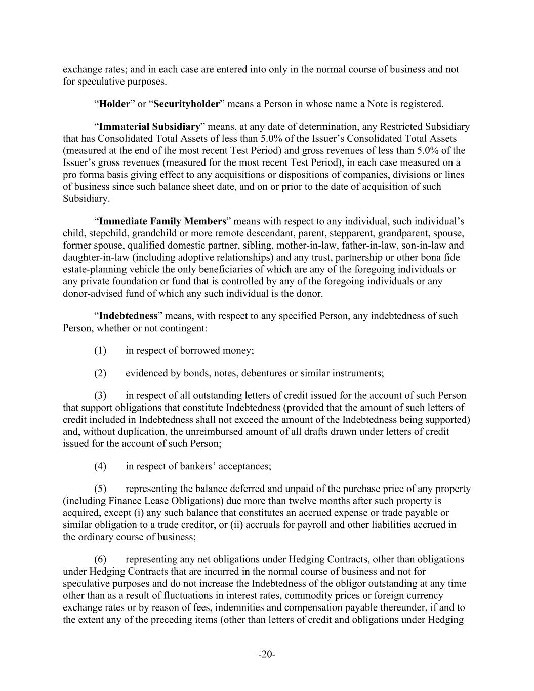 -20- exchange rates; and in each case are entered into only in the normal course of business and not for speculative purposes. “Holder” or “Securityholder” means a Person in whose name a Note is registered. “Immaterial Subsidiary” means, at any date of determination, any Restricted Subsidiary that has Consolidated Total Assets of less than 5.0% of the Issuer’s Consolidated Total Assets (measured at the end of the most recent Test Period) and gross revenues of less than 5.0% of the Issuer’s gross revenues (measured for the most recent Test Period), in each case measured on a pro forma basis giving effect to any acquisitions or dispositions of companies, divisions or lines of business since such balance sheet date, and on or prior to the date of acquisition of such Subsidiary. “Immediate Family Members” means with respect to any individual, such individual’s child, stepchild, grandchild or more remote descendant, parent, stepparent, grandparent, spouse, former spouse, qualified domestic partner, sibling, mother-in-law, father-in-law, son-in-law and daughter-in-law (including adoptive relationships) and any trust, partnership or other bona fide estate-planning vehicle the only beneficiaries of which are any of the foregoing individuals or any private foundation or fund that is controlled by any of the foregoing individuals or any donor-advised fund of which any such individual is the donor. “Indebtedness” means, with respect to any specified Person, any indebtedness of such Person, whether or not contingent: (1) in respect of borrowed money; (2) evidenced by bonds, notes, debentures or similar instruments; (3) in respect of all outstanding letters of credit issued for the account of such Person that support obligations that constitute Indebtedness (provided that the amount of such letters of credit included in Indebtedness shall not exceed the amount of the Indebtedness being supported) and, without duplication, the unreimbursed amount of all drafts drawn under letters of credit issued for the account of such Person; (4) in respect of bankers’ acceptances; (5) representing the balance deferred and unpaid of the purchase price of any property (including Finance Lease Obligations) due more than twelve months after such property is acquired, except (i) any such balance that constitutes an accrued expense or trade payable or similar obligation to a trade creditor, or (ii) accruals for payroll and other liabilities accrued in the ordinary course of business; (6) representing any net obligations under Hedging Contracts, other than obligations under Hedging Contracts that are incurred in the normal course of business and not for speculative purposes and do not increase the Indebtedness of the obligor outstanding at any time other than as a result of fluctuations in interest rates, commodity prices or foreign currency exchange rates or by reason of fees, indemnities and compensation payable thereunder, if and to the extent any of the preceding items (other than letters of credit and obligations under Hedging