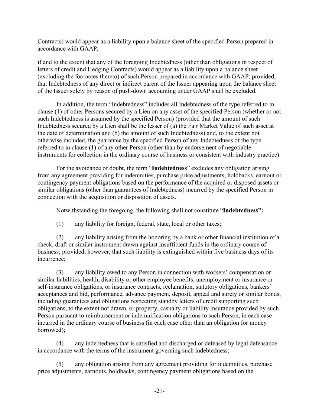 -21- Contracts) would appear as a liability upon a balance sheet of the specified Person prepared in accordance with GAAP; if and to the extent that any of the foregoing Indebtedness (other than obligations in respect of letters of credit and Hedging Contracts) would appear as a liability upon a balance sheet (excluding the footnotes thereto) of such Person prepared in accordance with GAAP; provided, that Indebtedness of any direct or indirect parent of the Issuer appearing upon the balance sheet of the Issuer solely by reason of push-down accounting under GAAP shall be excluded. In addition, the term “Indebtedness” includes all Indebtedness of the type referred to in clause (1) of other Persons secured by a Lien on any asset of the specified Person (whether or not such Indebtedness is assumed by the specified Person) (provided that the amount of such Indebtedness secured by a Lien shall be the lesser of (a) the Fair Market Value of such asset at the date of determination and (b) the amount of such Indebtedness) and, to the extent not otherwise included, the guarantee by the specified Person of any Indebtedness of the type referred to in clause (1) of any other Person (other than by endorsement of negotiable instruments for collection in the ordinary course of business or consistent with industry practice). For the avoidance of doubt, the term “Indebtedness” excludes any obligation arising from any agreement providing for indemnities, purchase price adjustments, holdbacks, earnout or contingency payment obligations based on the performance of the acquired or disposed assets or similar obligations (other than guarantees of Indebtedness) incurred by the specified Person in connection with the acquisition or disposition of assets. Notwithstanding the foregoing, the following shall not constitute “Indebtedness”: (1) any liability for foreign, federal, state, local or other taxes; (2) any liability arising from the honoring by a bank or other financial institution of a check, draft or similar instrument drawn against insufficient funds in the ordinary course of business; provided, however, that such liability is extinguished within five business days of its incurrence; (3) any liability owed to any Person in connection with workers’ compensation or similar liabilities, health, disability or other employee benefits, unemployment or insurance or self-insurance obligations, or insurance contracts, reclamation, statutory obligations, bankers’ acceptances and bid, performance, advance payment, deposit, appeal and surety or similar bonds, including guarantees and obligations respecting standby letters of credit supporting such obligations, to the extent not drawn, or property, casualty or liability insurance provided by such Person pursuant to reimbursement or indemnification obligations to such Person, in each case incurred in the ordinary course of business (in each case other than an obligation for money borrowed); (4) any indebtedness that is satisfied and discharged or defeased by legal defeasance in accordance with the terms of the instrument governing such indebtedness; (5) any obligation arising from any agreement providing for indemnities, purchase price adjustments, earnouts, holdbacks, contingency payment obligations based on the