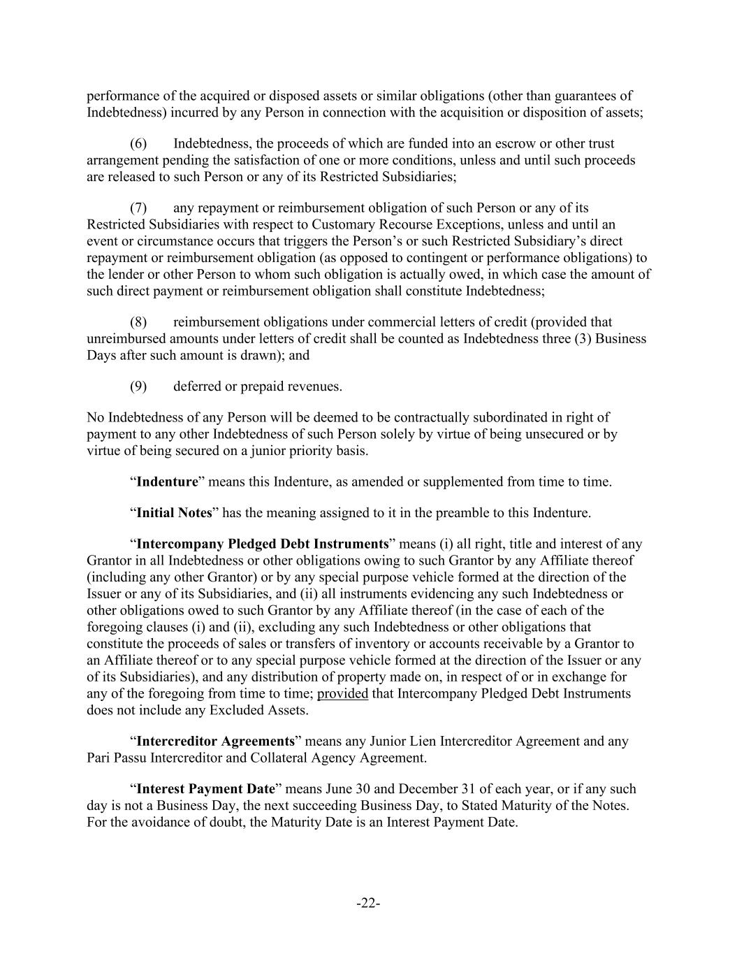 -22- performance of the acquired or disposed assets or similar obligations (other than guarantees of Indebtedness) incurred by any Person in connection with the acquisition or disposition of assets; (6) Indebtedness, the proceeds of which are funded into an escrow or other trust arrangement pending the satisfaction of one or more conditions, unless and until such proceeds are released to such Person or any of its Restricted Subsidiaries; (7) any repayment or reimbursement obligation of such Person or any of its Restricted Subsidiaries with respect to Customary Recourse Exceptions, unless and until an event or circumstance occurs that triggers the Person’s or such Restricted Subsidiary’s direct repayment or reimbursement obligation (as opposed to contingent or performance obligations) to the lender or other Person to whom such obligation is actually owed, in which case the amount of such direct payment or reimbursement obligation shall constitute Indebtedness; (8) reimbursement obligations under commercial letters of credit (provided that unreimbursed amounts under letters of credit shall be counted as Indebtedness three (3) Business Days after such amount is drawn); and (9) deferred or prepaid revenues. No Indebtedness of any Person will be deemed to be contractually subordinated in right of payment to any other Indebtedness of such Person solely by virtue of being unsecured or by virtue of being secured on a junior priority basis. “Indenture” means this Indenture, as amended or supplemented from time to time. “Initial Notes” has the meaning assigned to it in the preamble to this Indenture. “Intercompany Pledged Debt Instruments” means (i) all right, title and interest of any Grantor in all Indebtedness or other obligations owing to such Grantor by any Affiliate thereof (including any other Grantor) or by any special purpose vehicle formed at the direction of the Issuer or any of its Subsidiaries, and (ii) all instruments evidencing any such Indebtedness or other obligations owed to such Grantor by any Affiliate thereof (in the case of each of the foregoing clauses (i) and (ii), excluding any such Indebtedness or other obligations that constitute the proceeds of sales or transfers of inventory or accounts receivable by a Grantor to an Affiliate thereof or to any special purpose vehicle formed at the direction of the Issuer or any of its Subsidiaries), and any distribution of property made on, in respect of or in exchange for any of the foregoing from time to time; provided that Intercompany Pledged Debt Instruments does not include any Excluded Assets. “Intercreditor Agreements” means any Junior Lien Intercreditor Agreement and any Pari Passu Intercreditor and Collateral Agency Agreement. “Interest Payment Date” means June 30 and December 31 of each year, or if any such day is not a Business Day, the next succeeding Business Day, to Stated Maturity of the Notes. For the avoidance of doubt, the Maturity Date is an Interest Payment Date.