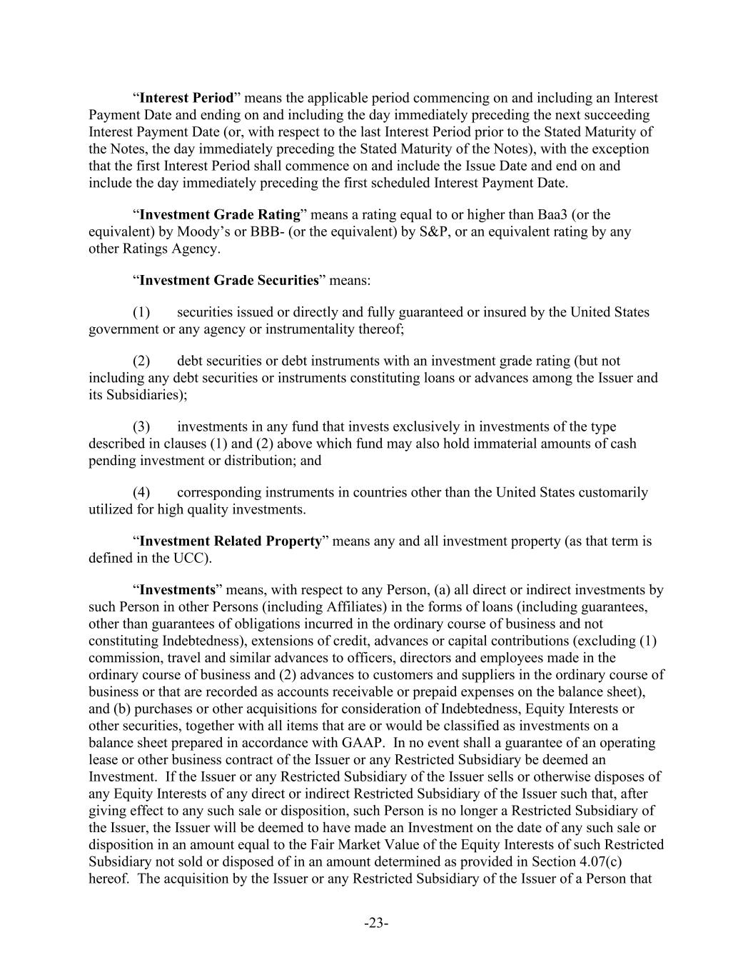 -23- “Interest Period” means the applicable period commencing on and including an Interest Payment Date and ending on and including the day immediately preceding the next succeeding Interest Payment Date (or, with respect to the last Interest Period prior to the Stated Maturity of the Notes, the day immediately preceding the Stated Maturity of the Notes), with the exception that the first Interest Period shall commence on and include the Issue Date and end on and include the day immediately preceding the first scheduled Interest Payment Date. “Investment Grade Rating” means a rating equal to or higher than Baa3 (or the equivalent) by Moody’s or BBB- (or the equivalent) by S&P, or an equivalent rating by any other Ratings Agency. “Investment Grade Securities” means: (1) securities issued or directly and fully guaranteed or insured by the United States government or any agency or instrumentality thereof; (2) debt securities or debt instruments with an investment grade rating (but not including any debt securities or instruments constituting loans or advances among the Issuer and its Subsidiaries); (3) investments in any fund that invests exclusively in investments of the type described in clauses (1) and (2) above which fund may also hold immaterial amounts of cash pending investment or distribution; and (4) corresponding instruments in countries other than the United States customarily utilized for high quality investments. “Investment Related Property” means any and all investment property (as that term is defined in the UCC). “Investments” means, with respect to any Person, (a) all direct or indirect investments by such Person in other Persons (including Affiliates) in the forms of loans (including guarantees, other than guarantees of obligations incurred in the ordinary course of business and not constituting Indebtedness), extensions of credit, advances or capital contributions (excluding (1) commission, travel and similar advances to officers, directors and employees made in the ordinary course of business and (2) advances to customers and suppliers in the ordinary course of business or that are recorded as accounts receivable or prepaid expenses on the balance sheet), and (b) purchases or other acquisitions for consideration of Indebtedness, Equity Interests or other securities, together with all items that are or would be classified as investments on a balance sheet prepared in accordance with GAAP. In no event shall a guarantee of an operating lease or other business contract of the Issuer or any Restricted Subsidiary be deemed an Investment. If the Issuer or any Restricted Subsidiary of the Issuer sells or otherwise disposes of any Equity Interests of any direct or indirect Restricted Subsidiary of the Issuer such that, after giving effect to any such sale or disposition, such Person is no longer a Restricted Subsidiary of the Issuer, the Issuer will be deemed to have made an Investment on the date of any such sale or disposition in an amount equal to the Fair Market Value of the Equity Interests of such Restricted Subsidiary not sold or disposed of in an amount determined as provided in Section 4.07(c) hereof. The acquisition by the Issuer or any Restricted Subsidiary of the Issuer of a Person that