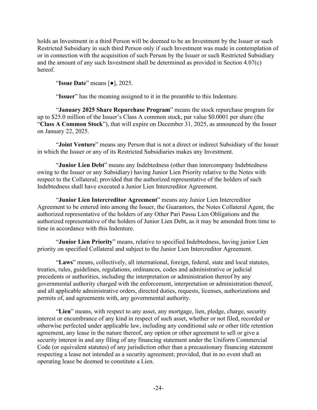 -24- holds an Investment in a third Person will be deemed to be an Investment by the Issuer or such Restricted Subsidiary in such third Person only if such Investment was made in contemplation of or in connection with the acquisition of such Person by the Issuer or such Restricted Subsidiary and the amount of any such Investment shall be determined as provided in Section 4.07(c) hereof. “Issue Date” means [●], 2025. “Issuer” has the meaning assigned to it in the preamble to this Indenture. “January 2025 Share Repurchase Program” means the stock repurchase program for up to $25.0 million of the Issuer’s Class A common stock, par value $0.0001 per share (the “Class A Common Stock”), that will expire on December 31, 2025, as announced by the Issuer on January 22, 2025. “Joint Venture” means any Person that is not a direct or indirect Subsidiary of the Issuer in which the Issuer or any of its Restricted Subsidiaries makes any Investment. “Junior Lien Debt” means any Indebtedness (other than intercompany Indebtedness owing to the Issuer or any Subsidiary) having Junior Lien Priority relative to the Notes with respect to the Collateral; provided that the authorized representative of the holders of such Indebtedness shall have executed a Junior Lien Intercreditor Agreement. “Junior Lien Intercreditor Agreement” means any Junior Lien Intercreditor Agreement to be entered into among the Issuer, the Guarantors, the Notes Collateral Agent, the authorized representative of the holders of any Other Pari Passu Lien Obligations and the authorized representative of the holders of Junior Lien Debt, as it may be amended from time to time in accordance with this Indenture. “Junior Lien Priority” means, relative to specified Indebtedness, having junior Lien priority on specified Collateral and subject to the Junior Lien Intercreditor Agreement. “Laws” means, collectively, all international, foreign, federal, state and local statutes, treaties, rules, guidelines, regulations, ordinances, codes and administrative or judicial precedents or authorities, including the interpretation or administration thereof by any governmental authority charged with the enforcement, interpretation or administration thereof, and all applicable administrative orders, directed duties, requests, licenses, authorizations and permits of, and agreements with, any governmental authority. “Lien” means, with respect to any asset, any mortgage, lien, pledge, charge, security interest or encumbrance of any kind in respect of such asset, whether or not filed, recorded or otherwise perfected under applicable law, including any conditional sale or other title retention agreement, any lease in the nature thereof, any option or other agreement to sell or give a security interest in and any filing of any financing statement under the Uniform Commercial Code (or equivalent statutes) of any jurisdiction other than a precautionary financing statement respecting a lease not intended as a security agreement; provided, that in no event shall an operating lease be deemed to constitute a Lien.