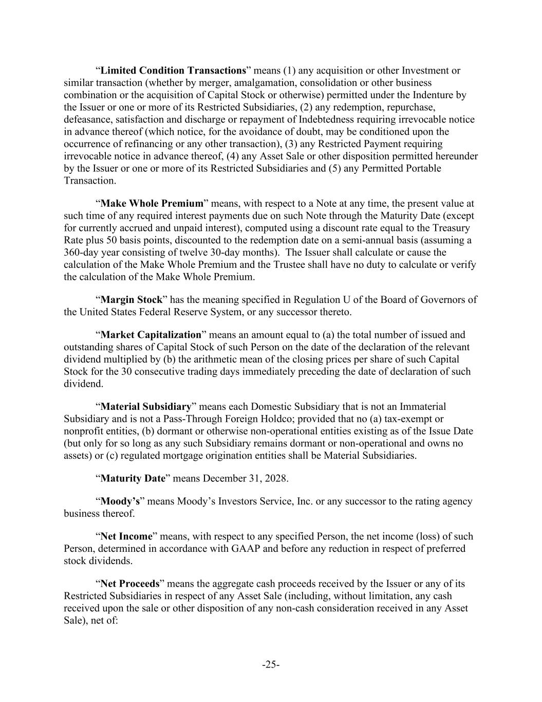 -25- “Limited Condition Transactions” means (1) any acquisition or other Investment or similar transaction (whether by merger, amalgamation, consolidation or other business combination or the acquisition of Capital Stock or otherwise) permitted under the Indenture by the Issuer or one or more of its Restricted Subsidiaries, (2) any redemption, repurchase, defeasance, satisfaction and discharge or repayment of Indebtedness requiring irrevocable notice in advance thereof (which notice, for the avoidance of doubt, may be conditioned upon the occurrence of refinancing or any other transaction), (3) any Restricted Payment requiring irrevocable notice in advance thereof, (4) any Asset Sale or other disposition permitted hereunder by the Issuer or one or more of its Restricted Subsidiaries and (5) any Permitted Portable Transaction. “Make Whole Premium” means, with respect to a Note at any time, the present value at such time of any required interest payments due on such Note through the Maturity Date (except for currently accrued and unpaid interest), computed using a discount rate equal to the Treasury Rate plus 50 basis points, discounted to the redemption date on a semi-annual basis (assuming a 360-day year consisting of twelve 30-day months). The Issuer shall calculate or cause the calculation of the Make Whole Premium and the Trustee shall have no duty to calculate or verify the calculation of the Make Whole Premium. “Margin Stock” has the meaning specified in Regulation U of the Board of Governors of the United States Federal Reserve System, or any successor thereto. “Market Capitalization” means an amount equal to (a) the total number of issued and outstanding shares of Capital Stock of such Person on the date of the declaration of the relevant dividend multiplied by (b) the arithmetic mean of the closing prices per share of such Capital Stock for the 30 consecutive trading days immediately preceding the date of declaration of such dividend. “Material Subsidiary” means each Domestic Subsidiary that is not an Immaterial Subsidiary and is not a Pass-Through Foreign Holdco; provided that no (a) tax-exempt or nonprofit entities, (b) dormant or otherwise non-operational entities existing as of the Issue Date (but only for so long as any such Subsidiary remains dormant or non-operational and owns no assets) or (c) regulated mortgage origination entities shall be Material Subsidiaries. “Maturity Date” means December 31, 2028. “Moody’s” means Moody’s Investors Service, Inc. or any successor to the rating agency business thereof. “Net Income” means, with respect to any specified Person, the net income (loss) of such Person, determined in accordance with GAAP and before any reduction in respect of preferred stock dividends. “Net Proceeds” means the aggregate cash proceeds received by the Issuer or any of its Restricted Subsidiaries in respect of any Asset Sale (including, without limitation, any cash received upon the sale or other disposition of any non-cash consideration received in any Asset Sale), net of: