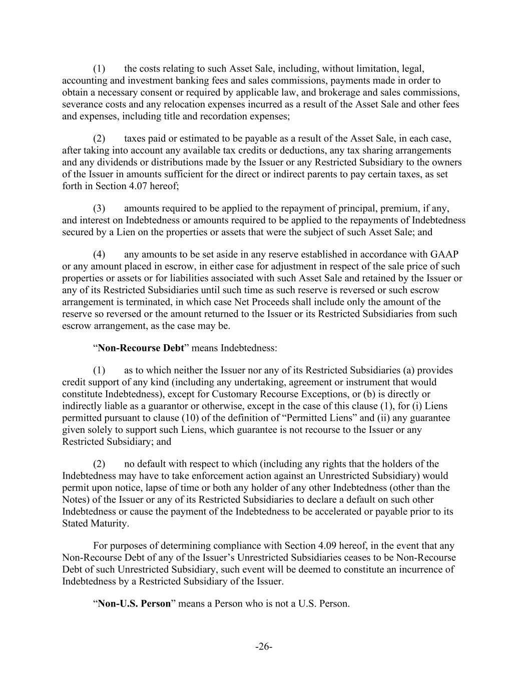 -26- (1) the costs relating to such Asset Sale, including, without limitation, legal, accounting and investment banking fees and sales commissions, payments made in order to obtain a necessary consent or required by applicable law, and brokerage and sales commissions, severance costs and any relocation expenses incurred as a result of the Asset Sale and other fees and expenses, including title and recordation expenses; (2) taxes paid or estimated to be payable as a result of the Asset Sale, in each case, after taking into account any available tax credits or deductions, any tax sharing arrangements and any dividends or distributions made by the Issuer or any Restricted Subsidiary to the owners of the Issuer in amounts sufficient for the direct or indirect parents to pay certain taxes, as set forth in Section 4.07 hereof; (3) amounts required to be applied to the repayment of principal, premium, if any, and interest on Indebtedness or amounts required to be applied to the repayments of Indebtedness secured by a Lien on the properties or assets that were the subject of such Asset Sale; and (4) any amounts to be set aside in any reserve established in accordance with GAAP or any amount placed in escrow, in either case for adjustment in respect of the sale price of such properties or assets or for liabilities associated with such Asset Sale and retained by the Issuer or any of its Restricted Subsidiaries until such time as such reserve is reversed or such escrow arrangement is terminated, in which case Net Proceeds shall include only the amount of the reserve so reversed or the amount returned to the Issuer or its Restricted Subsidiaries from such escrow arrangement, as the case may be. “Non-Recourse Debt” means Indebtedness: (1) as to which neither the Issuer nor any of its Restricted Subsidiaries (a) provides credit support of any kind (including any undertaking, agreement or instrument that would constitute Indebtedness), except for Customary Recourse Exceptions, or (b) is directly or indirectly liable as a guarantor or otherwise, except in the case of this clause (1), for (i) Liens permitted pursuant to clause (10) of the definition of “Permitted Liens” and (ii) any guarantee given solely to support such Liens, which guarantee is not recourse to the Issuer or any Restricted Subsidiary; and (2) no default with respect to which (including any rights that the holders of the Indebtedness may have to take enforcement action against an Unrestricted Subsidiary) would permit upon notice, lapse of time or both any holder of any other Indebtedness (other than the Notes) of the Issuer or any of its Restricted Subsidiaries to declare a default on such other Indebtedness or cause the payment of the Indebtedness to be accelerated or payable prior to its Stated Maturity. For purposes of determining compliance with Section 4.09 hereof, in the event that any Non-Recourse Debt of any of the Issuer’s Unrestricted Subsidiaries ceases to be Non-Recourse Debt of such Unrestricted Subsidiary, such event will be deemed to constitute an incurrence of Indebtedness by a Restricted Subsidiary of the Issuer. “Non-U.S. Person” means a Person who is not a U.S. Person.