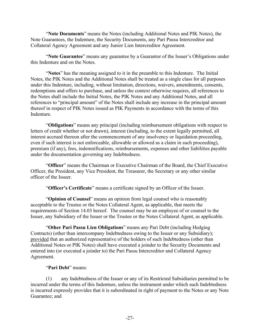 -27- “Note Documents” means the Notes (including Additional Notes and PIK Notes), the Note Guarantees, the Indenture, the Security Documents, any Pari Passu Intercreditor and Collateral Agency Agreement and any Junior Lien Intercreditor Agreement. “Note Guarantee” means any guarantee by a Guarantor of the Issuer’s Obligations under this Indenture and on the Notes. “Notes” has the meaning assigned to it in the preamble to this Indenture. The Initial Notes, the PIK Notes and the Additional Notes shall be treated as a single class for all purposes under this Indenture, including, without limitation, directions, waivers, amendments, consents, redemptions and offers to purchase, and unless the context otherwise requires, all references to the Notes shall include the Initial Notes, the PIK Notes and any Additional Notes, and all references to “principal amount” of the Notes shall include any increase in the principal amount thereof in respect of PIK Notes issued as PIK Payments in accordance with the terms of this Indenture. “Obligations” means any principal (including reimbursement obligations with respect to letters of credit whether or not drawn), interest (including, to the extent legally permitted, all interest accrued thereon after the commencement of any insolvency or liquidation proceeding, even if such interest is not enforceable, allowable or allowed as a claim in such proceeding), premium (if any), fees, indemnifications, reimbursements, expenses and other liabilities payable under the documentation governing any Indebtedness. “Officer” means the Chairman or Executive Chairman of the Board, the Chief Executive Officer, the President, any Vice President, the Treasurer, the Secretary or any other similar officer of the Issuer. “Officer’s Certificate” means a certificate signed by an Officer of the Issuer. “Opinion of Counsel” means an opinion from legal counsel who is reasonably acceptable to the Trustee or the Notes Collateral Agent, as applicable, that meets the requirements of Section 14.03 hereof. The counsel may be an employee of or counsel to the Issuer, any Subsidiary of the Issuer or the Trustee or the Notes Collateral Agent, as applicable. “Other Pari Passu Lien Obligations” means any Pari Debt (including Hedging Contracts) (other than intercompany Indebtedness owing to the Issuer or any Subsidiary); provided that an authorized representative of the holders of such Indebtedness (other than Additional Notes or PIK Notes) shall have executed a joinder to the Security Documents and entered into (or executed a joinder to) the Pari Passu Intercreditor and Collateral Agency Agreement. “Pari Debt” means: (1) any Indebtedness of the Issuer or any of its Restricted Subsidiaries permitted to be incurred under the terms of this Indenture, unless the instrument under which such Indebtedness is incurred expressly provides that it is subordinated in right of payment to the Notes or any Note Guarantee; and