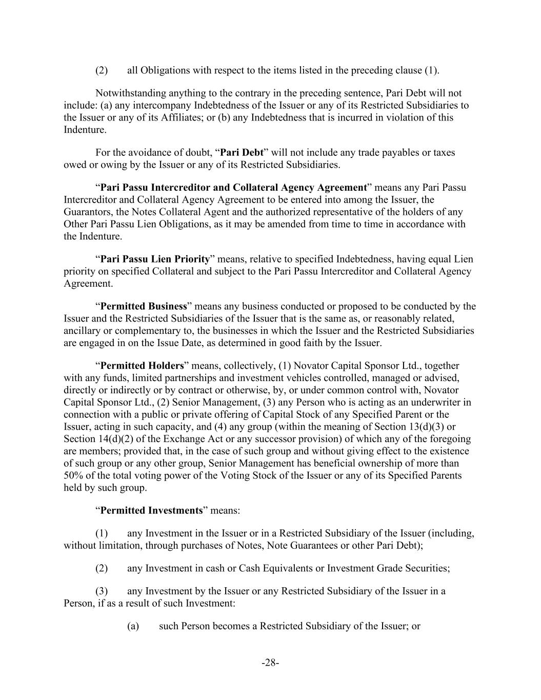 -28- (2) all Obligations with respect to the items listed in the preceding clause (1). Notwithstanding anything to the contrary in the preceding sentence, Pari Debt will not include: (a) any intercompany Indebtedness of the Issuer or any of its Restricted Subsidiaries to the Issuer or any of its Affiliates; or (b) any Indebtedness that is incurred in violation of this Indenture. For the avoidance of doubt, “Pari Debt” will not include any trade payables or taxes owed or owing by the Issuer or any of its Restricted Subsidiaries. “Pari Passu Intercreditor and Collateral Agency Agreement” means any Pari Passu Intercreditor and Collateral Agency Agreement to be entered into among the Issuer, the Guarantors, the Notes Collateral Agent and the authorized representative of the holders of any Other Pari Passu Lien Obligations, as it may be amended from time to time in accordance with the Indenture. “Pari Passu Lien Priority” means, relative to specified Indebtedness, having equal Lien priority on specified Collateral and subject to the Pari Passu Intercreditor and Collateral Agency Agreement. “Permitted Business” means any business conducted or proposed to be conducted by the Issuer and the Restricted Subsidiaries of the Issuer that is the same as, or reasonably related, ancillary or complementary to, the businesses in which the Issuer and the Restricted Subsidiaries are engaged in on the Issue Date, as determined in good faith by the Issuer. “Permitted Holders” means, collectively, (1) Novator Capital Sponsor Ltd., together with any funds, limited partnerships and investment vehicles controlled, managed or advised, directly or indirectly or by contract or otherwise, by, or under common control with, Novator Capital Sponsor Ltd., (2) Senior Management, (3) any Person who is acting as an underwriter in connection with a public or private offering of Capital Stock of any Specified Parent or the Issuer, acting in such capacity, and (4) any group (within the meaning of Section 13(d)(3) or Section 14(d)(2) of the Exchange Act or any successor provision) of which any of the foregoing are members; provided that, in the case of such group and without giving effect to the existence of such group or any other group, Senior Management has beneficial ownership of more than 50% of the total voting power of the Voting Stock of the Issuer or any of its Specified Parents held by such group. “Permitted Investments” means: (1) any Investment in the Issuer or in a Restricted Subsidiary of the Issuer (including, without limitation, through purchases of Notes, Note Guarantees or other Pari Debt); (2) any Investment in cash or Cash Equivalents or Investment Grade Securities; (3) any Investment by the Issuer or any Restricted Subsidiary of the Issuer in a Person, if as a result of such Investment: (a) such Person becomes a Restricted Subsidiary of the Issuer; or
