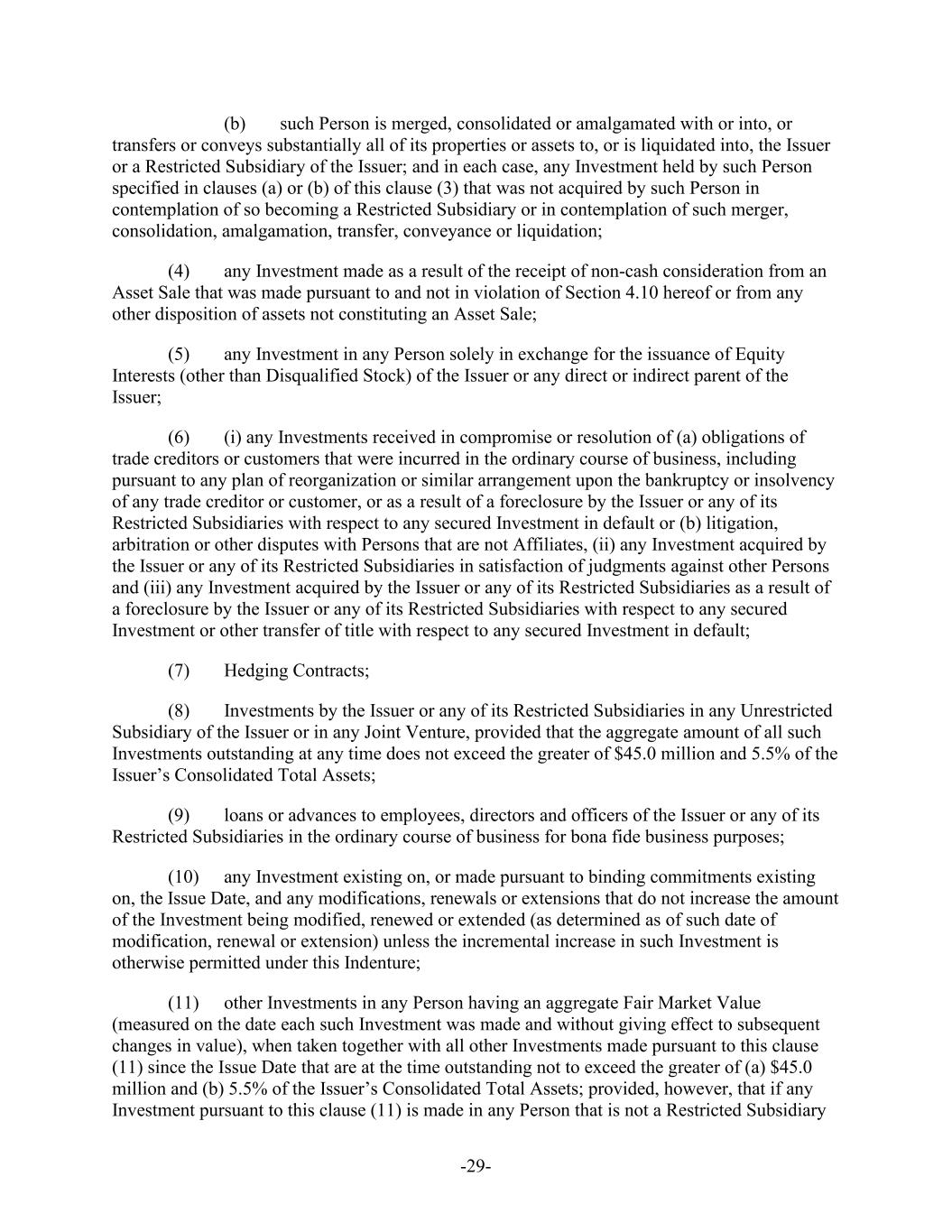-29- (b) such Person is merged, consolidated or amalgamated with or into, or transfers or conveys substantially all of its properties or assets to, or is liquidated into, the Issuer or a Restricted Subsidiary of the Issuer; and in each case, any Investment held by such Person specified in clauses (a) or (b) of this clause (3) that was not acquired by such Person in contemplation of so becoming a Restricted Subsidiary or in contemplation of such merger, consolidation, amalgamation, transfer, conveyance or liquidation; (4) any Investment made as a result of the receipt of non-cash consideration from an Asset Sale that was made pursuant to and not in violation of Section 4.10 hereof or from any other disposition of assets not constituting an Asset Sale; (5) any Investment in any Person solely in exchange for the issuance of Equity Interests (other than Disqualified Stock) of the Issuer or any direct or indirect parent of the Issuer; (6) (i) any Investments received in compromise or resolution of (a) obligations of trade creditors or customers that were incurred in the ordinary course of business, including pursuant to any plan of reorganization or similar arrangement upon the bankruptcy or insolvency of any trade creditor or customer, or as a result of a foreclosure by the Issuer or any of its Restricted Subsidiaries with respect to any secured Investment in default or (b) litigation, arbitration or other disputes with Persons that are not Affiliates, (ii) any Investment acquired by the Issuer or any of its Restricted Subsidiaries in satisfaction of judgments against other Persons and (iii) any Investment acquired by the Issuer or any of its Restricted Subsidiaries as a result of a foreclosure by the Issuer or any of its Restricted Subsidiaries with respect to any secured Investment or other transfer of title with respect to any secured Investment in default; (7) Hedging Contracts; (8) Investments by the Issuer or any of its Restricted Subsidiaries in any Unrestricted Subsidiary of the Issuer or in any Joint Venture, provided that the aggregate amount of all such Investments outstanding at any time does not exceed the greater of $45.0 million and 5.5% of the Issuer’s Consolidated Total Assets; (9) loans or advances to employees, directors and officers of the Issuer or any of its Restricted Subsidiaries in the ordinary course of business for bona fide business purposes; (10) any Investment existing on, or made pursuant to binding commitments existing on, the Issue Date, and any modifications, renewals or extensions that do not increase the amount of the Investment being modified, renewed or extended (as determined as of such date of modification, renewal or extension) unless the incremental increase in such Investment is otherwise permitted under this Indenture; (11) other Investments in any Person having an aggregate Fair Market Value (measured on the date each such Investment was made and without giving effect to subsequent changes in value), when taken together with all other Investments made pursuant to this clause (11) since the Issue Date that are at the time outstanding not to exceed the greater of (a) $45.0 million and (b) 5.5% of the Issuer’s Consolidated Total Assets; provided, however, that if any Investment pursuant to this clause (11) is made in any Person that is not a Restricted Subsidiary