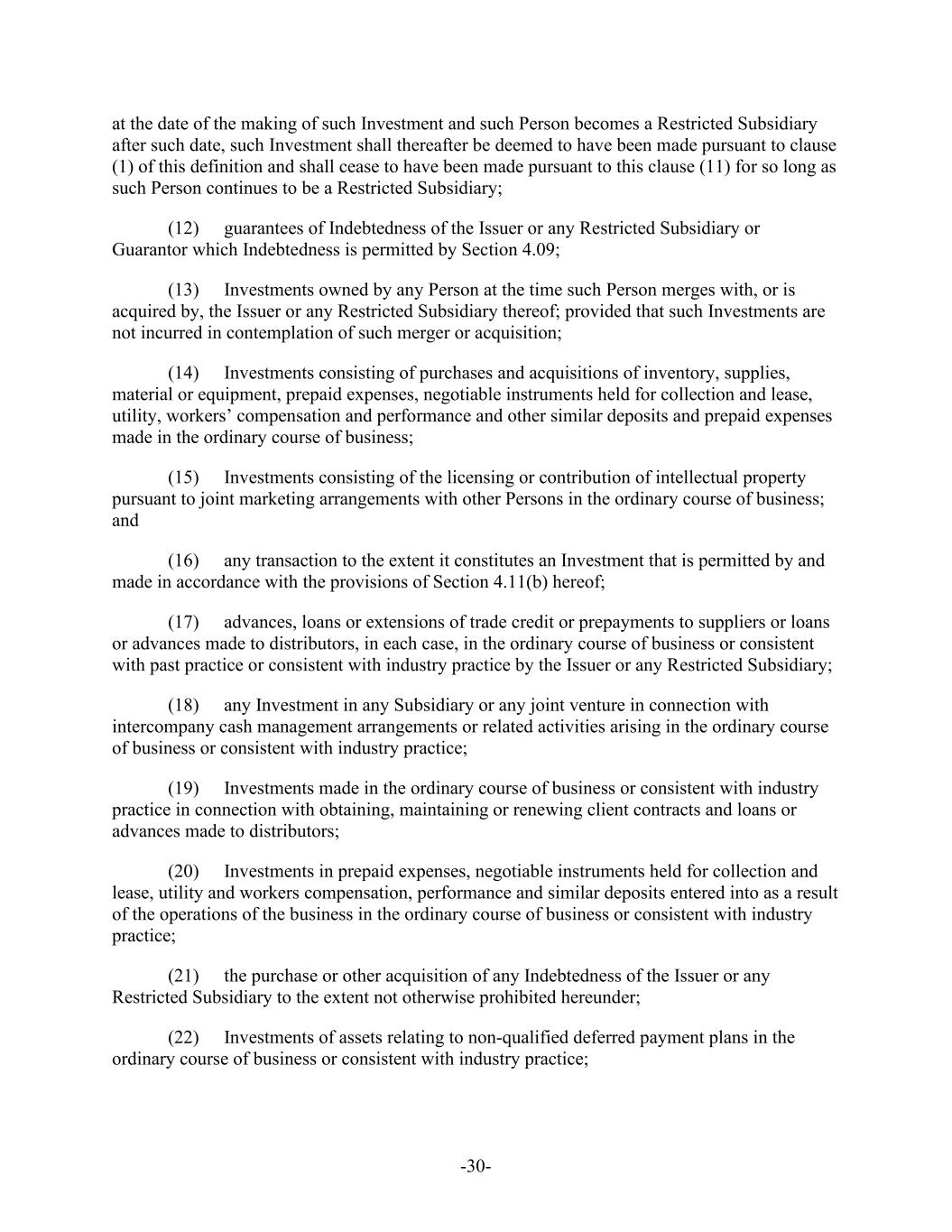 -30- at the date of the making of such Investment and such Person becomes a Restricted Subsidiary after such date, such Investment shall thereafter be deemed to have been made pursuant to clause (1) of this definition and shall cease to have been made pursuant to this clause (11) for so long as such Person continues to be a Restricted Subsidiary; (12) guarantees of Indebtedness of the Issuer or any Restricted Subsidiary or Guarantor which Indebtedness is permitted by Section 4.09; (13) Investments owned by any Person at the time such Person merges with, or is acquired by, the Issuer or any Restricted Subsidiary thereof; provided that such Investments are not incurred in contemplation of such merger or acquisition; (14) Investments consisting of purchases and acquisitions of inventory, supplies, material or equipment, prepaid expenses, negotiable instruments held for collection and lease, utility, workers’ compensation and performance and other similar deposits and prepaid expenses made in the ordinary course of business; (15) Investments consisting of the licensing or contribution of intellectual property pursuant to joint marketing arrangements with other Persons in the ordinary course of business; and (16) any transaction to the extent it constitutes an Investment that is permitted by and made in accordance with the provisions of Section 4.11(b) hereof; (17) advances, loans or extensions of trade credit or prepayments to suppliers or loans or advances made to distributors, in each case, in the ordinary course of business or consistent with past practice or consistent with industry practice by the Issuer or any Restricted Subsidiary; (18) any Investment in any Subsidiary or any joint venture in connection with intercompany cash management arrangements or related activities arising in the ordinary course of business or consistent with industry practice; (19) Investments made in the ordinary course of business or consistent with industry practice in connection with obtaining, maintaining or renewing client contracts and loans or advances made to distributors; (20) Investments in prepaid expenses, negotiable instruments held for collection and lease, utility and workers compensation, performance and similar deposits entered into as a result of the operations of the business in the ordinary course of business or consistent with industry practice; (21) the purchase or other acquisition of any Indebtedness of the Issuer or any Restricted Subsidiary to the extent not otherwise prohibited hereunder; (22) Investments of assets relating to non-qualified deferred payment plans in the ordinary course of business or consistent with industry practice;