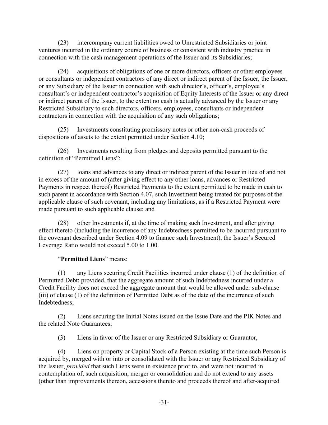-31- (23) intercompany current liabilities owed to Unrestricted Subsidiaries or joint ventures incurred in the ordinary course of business or consistent with industry practice in connection with the cash management operations of the Issuer and its Subsidiaries; (24) acquisitions of obligations of one or more directors, officers or other employees or consultants or independent contractors of any direct or indirect parent of the Issuer, the Issuer, or any Subsidiary of the Issuer in connection with such director’s, officer’s, employee’s consultant’s or independent contractor’s acquisition of Equity Interests of the Issuer or any direct or indirect parent of the Issuer, to the extent no cash is actually advanced by the Issuer or any Restricted Subsidiary to such directors, officers, employees, consultants or independent contractors in connection with the acquisition of any such obligations; (25) Investments constituting promissory notes or other non-cash proceeds of dispositions of assets to the extent permitted under Section 4.10; (26) Investments resulting from pledges and deposits permitted pursuant to the definition of “Permitted Liens”; (27) loans and advances to any direct or indirect parent of the Issuer in lieu of and not in excess of the amount of (after giving effect to any other loans, advances or Restricted Payments in respect thereof) Restricted Payments to the extent permitted to be made in cash to such parent in accordance with Section 4.07, such Investment being treated for purposes of the applicable clause of such covenant, including any limitations, as if a Restricted Payment were made pursuant to such applicable clause; and (28) other Investments if, at the time of making such Investment, and after giving effect thereto (including the incurrence of any Indebtedness permitted to be incurred pursuant to the covenant described under Section 4.09 to finance such Investment), the Issuer’s Secured Leverage Ratio would not exceed 5.00 to 1.00. “Permitted Liens” means: (1) any Liens securing Credit Facilities incurred under clause (1) of the definition of Permitted Debt; provided, that the aggregate amount of such Indebtedness incurred under a Credit Facility does not exceed the aggregate amount that would be allowed under sub-clause (iii) of clause (1) of the definition of Permitted Debt as of the date of the incurrence of such Indebtedness; (2) Liens securing the Initial Notes issued on the Issue Date and the PIK Notes and the related Note Guarantees; (3) Liens in favor of the Issuer or any Restricted Subsidiary or Guarantor, (4) Liens on property or Capital Stock of a Person existing at the time such Person is acquired by, merged with or into or consolidated with the Issuer or any Restricted Subsidiary of the Issuer, provided that such Liens were in existence prior to, and were not incurred in contemplation of, such acquisition, merger or consolidation and do not extend to any assets (other than improvements thereon, accessions thereto and proceeds thereof and after-acquired