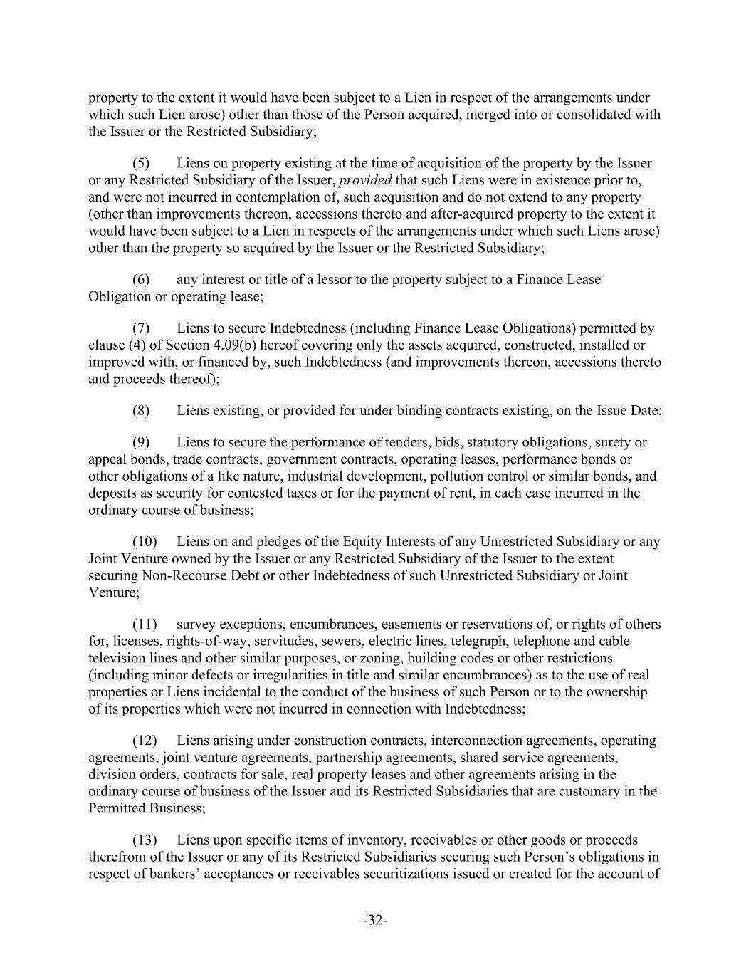 -32- property to the extent it would have been subject to a Lien in respect of the arrangements under which such Lien arose) other than those of the Person acquired, merged into or consolidated with the Issuer or the Restricted Subsidiary; (5) Liens on property existing at the time of acquisition of the property by the Issuer or any Restricted Subsidiary of the Issuer, provided that such Liens were in existence prior to, and were not incurred in contemplation of, such acquisition and do not extend to any property (other than improvements thereon, accessions thereto and after-acquired property to the extent it would have been subject to a Lien in respects of the arrangements under which such Liens arose) other than the property so acquired by the Issuer or the Restricted Subsidiary; (6) any interest or title of a lessor to the property subject to a Finance Lease Obligation or operating lease; (7) Liens to secure Indebtedness (including Finance Lease Obligations) permitted by clause (4) of Section 4.09(b) hereof covering only the assets acquired, constructed, installed or improved with, or financed by, such Indebtedness (and improvements thereon, accessions thereto and proceeds thereof); (8) Liens existing, or provided for under binding contracts existing, on the Issue Date; (9) Liens to secure the performance of tenders, bids, statutory obligations, surety or appeal bonds, trade contracts, government contracts, operating leases, performance bonds or other obligations of a like nature, industrial development, pollution control or similar bonds, and deposits as security for contested taxes or for the payment of rent, in each case incurred in the ordinary course of business; (10) Liens on and pledges of the Equity Interests of any Unrestricted Subsidiary or any Joint Venture owned by the Issuer or any Restricted Subsidiary of the Issuer to the extent securing Non-Recourse Debt or other Indebtedness of such Unrestricted Subsidiary or Joint Venture; (11) survey exceptions, encumbrances, easements or reservations of, or rights of others for, licenses, rights-of-way, servitudes, sewers, electric lines, telegraph, telephone and cable television lines and other similar purposes, or zoning, building codes or other restrictions (including minor defects or irregularities in title and similar encumbrances) as to the use of real properties or Liens incidental to the conduct of the business of such Person or to the ownership of its properties which were not incurred in connection with Indebtedness; (12) Liens arising under construction contracts, interconnection agreements, operating agreements, joint venture agreements, partnership agreements, shared service agreements, division orders, contracts for sale, real property leases and other agreements arising in the ordinary course of business of the Issuer and its Restricted Subsidiaries that are customary in the Permitted Business; (13) Liens upon specific items of inventory, receivables or other goods or proceeds therefrom of the Issuer or any of its Restricted Subsidiaries securing such Person’s obligations in respect of bankers’ acceptances or receivables securitizations issued or created for the account of