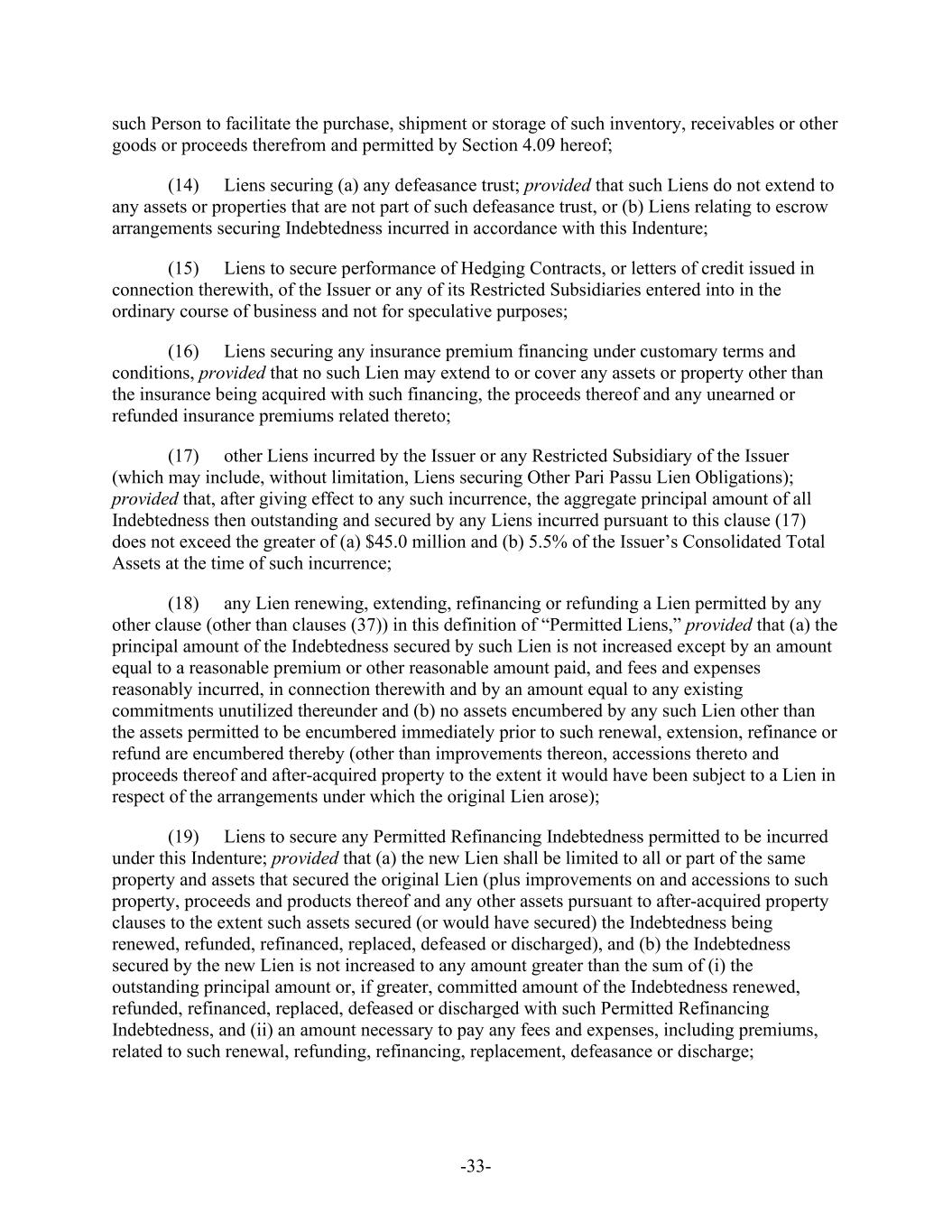 -33- such Person to facilitate the purchase, shipment or storage of such inventory, receivables or other goods or proceeds therefrom and permitted by Section 4.09 hereof; (14) Liens securing (a) any defeasance trust; provided that such Liens do not extend to any assets or properties that are not part of such defeasance trust, or (b) Liens relating to escrow arrangements securing Indebtedness incurred in accordance with this Indenture; (15) Liens to secure performance of Hedging Contracts, or letters of credit issued in connection therewith, of the Issuer or any of its Restricted Subsidiaries entered into in the ordinary course of business and not for speculative purposes; (16) Liens securing any insurance premium financing under customary terms and conditions, provided that no such Lien may extend to or cover any assets or property other than the insurance being acquired with such financing, the proceeds thereof and any unearned or refunded insurance premiums related thereto; (17) other Liens incurred by the Issuer or any Restricted Subsidiary of the Issuer (which may include, without limitation, Liens securing Other Pari Passu Lien Obligations); provided that, after giving effect to any such incurrence, the aggregate principal amount of all Indebtedness then outstanding and secured by any Liens incurred pursuant to this clause (17) does not exceed the greater of (a) $45.0 million and (b) 5.5% of the Issuer’s Consolidated Total Assets at the time of such incurrence; (18) any Lien renewing, extending, refinancing or refunding a Lien permitted by any other clause (other than clauses (37)) in this definition of “Permitted Liens,” provided that (a) the principal amount of the Indebtedness secured by such Lien is not increased except by an amount equal to a reasonable premium or other reasonable amount paid, and fees and expenses reasonably incurred, in connection therewith and by an amount equal to any existing commitments unutilized thereunder and (b) no assets encumbered by any such Lien other than the assets permitted to be encumbered immediately prior to such renewal, extension, refinance or refund are encumbered thereby (other than improvements thereon, accessions thereto and proceeds thereof and after-acquired property to the extent it would have been subject to a Lien in respect of the arrangements under which the original Lien arose); (19) Liens to secure any Permitted Refinancing Indebtedness permitted to be incurred under this Indenture; provided that (a) the new Lien shall be limited to all or part of the same property and assets that secured the original Lien (plus improvements on and accessions to such property, proceeds and products thereof and any other assets pursuant to after-acquired property clauses to the extent such assets secured (or would have secured) the Indebtedness being renewed, refunded, refinanced, replaced, defeased or discharged), and (b) the Indebtedness secured by the new Lien is not increased to any amount greater than the sum of (i) the outstanding principal amount or, if greater, committed amount of the Indebtedness renewed, refunded, refinanced, replaced, defeased or discharged with such Permitted Refinancing Indebtedness, and (ii) an amount necessary to pay any fees and expenses, including premiums, related to such renewal, refunding, refinancing, replacement, defeasance or discharge;