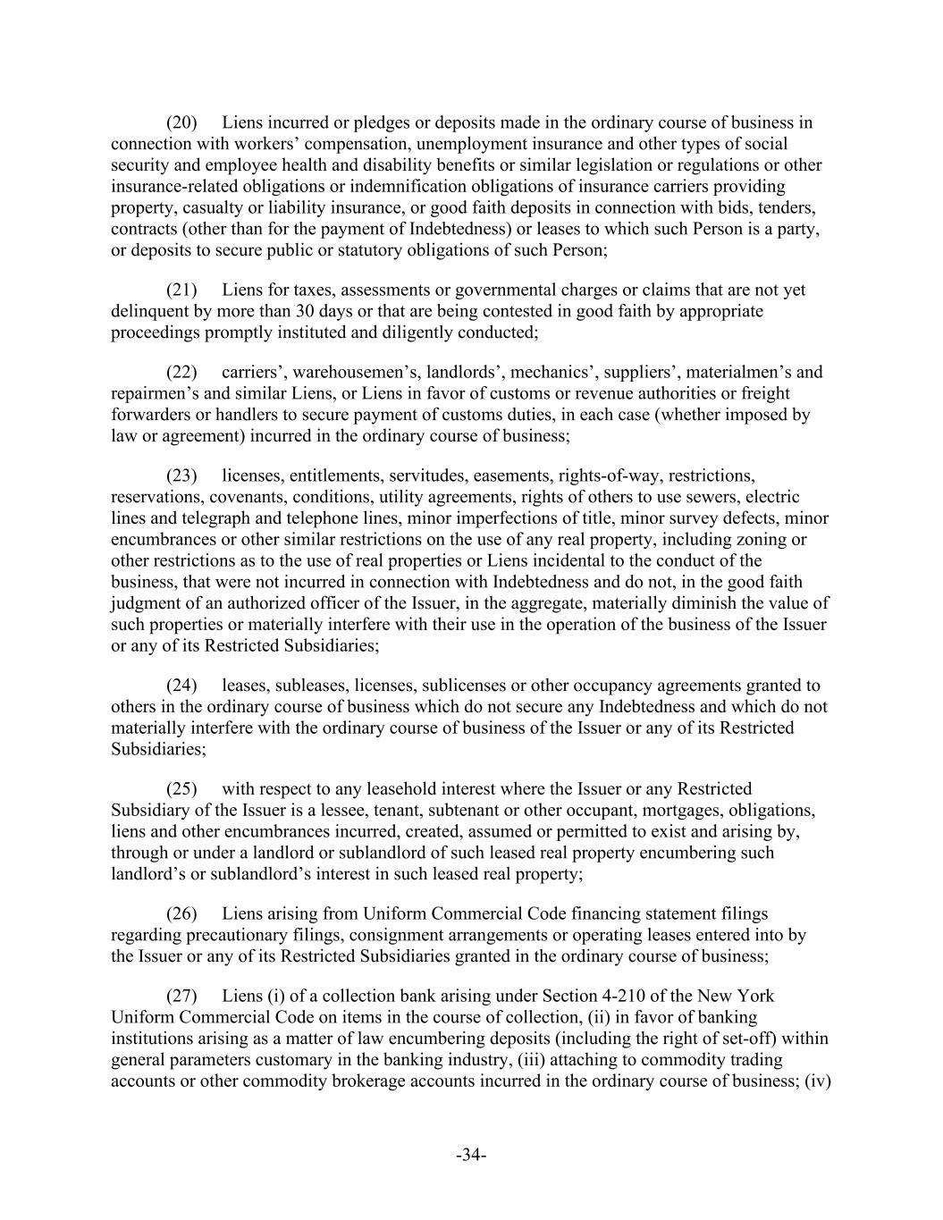 -34- (20) Liens incurred or pledges or deposits made in the ordinary course of business in connection with workers’ compensation, unemployment insurance and other types of social security and employee health and disability benefits or similar legislation or regulations or other insurance-related obligations or indemnification obligations of insurance carriers providing property, casualty or liability insurance, or good faith deposits in connection with bids, tenders, contracts (other than for the payment of Indebtedness) or leases to which such Person is a party, or deposits to secure public or statutory obligations of such Person; (21) Liens for taxes, assessments or governmental charges or claims that are not yet delinquent by more than 30 days or that are being contested in good faith by appropriate proceedings promptly instituted and diligently conducted; (22) carriers’, warehousemen’s, landlords’, mechanics’, suppliers’, materialmen’s and repairmen’s and similar Liens, or Liens in favor of customs or revenue authorities or freight forwarders or handlers to secure payment of customs duties, in each case (whether imposed by law or agreement) incurred in the ordinary course of business; (23) licenses, entitlements, servitudes, easements, rights-of-way, restrictions, reservations, covenants, conditions, utility agreements, rights of others to use sewers, electric lines and telegraph and telephone lines, minor imperfections of title, minor survey defects, minor encumbrances or other similar restrictions on the use of any real property, including zoning or other restrictions as to the use of real properties or Liens incidental to the conduct of the business, that were not incurred in connection with Indebtedness and do not, in the good faith judgment of an authorized officer of the Issuer, in the aggregate, materially diminish the value of such properties or materially interfere with their use in the operation of the business of the Issuer or any of its Restricted Subsidiaries; (24) leases, subleases, licenses, sublicenses or other occupancy agreements granted to others in the ordinary course of business which do not secure any Indebtedness and which do not materially interfere with the ordinary course of business of the Issuer or any of its Restricted Subsidiaries; (25) with respect to any leasehold interest where the Issuer or any Restricted Subsidiary of the Issuer is a lessee, tenant, subtenant or other occupant, mortgages, obligations, liens and other encumbrances incurred, created, assumed or permitted to exist and arising by, through or under a landlord or sublandlord of such leased real property encumbering such landlord’s or sublandlord’s interest in such leased real property; (26) Liens arising from Uniform Commercial Code financing statement filings regarding precautionary filings, consignment arrangements or operating leases entered into by the Issuer or any of its Restricted Subsidiaries granted in the ordinary course of business; (27) Liens (i) of a collection bank arising under Section 4-210 of the New York Uniform Commercial Code on items in the course of collection, (ii) in favor of banking institutions arising as a matter of law encumbering deposits (including the right of set-off) within general parameters customary in the banking industry, (iii) attaching to commodity trading accounts or other commodity brokerage accounts incurred in the ordinary course of business; (iv)
