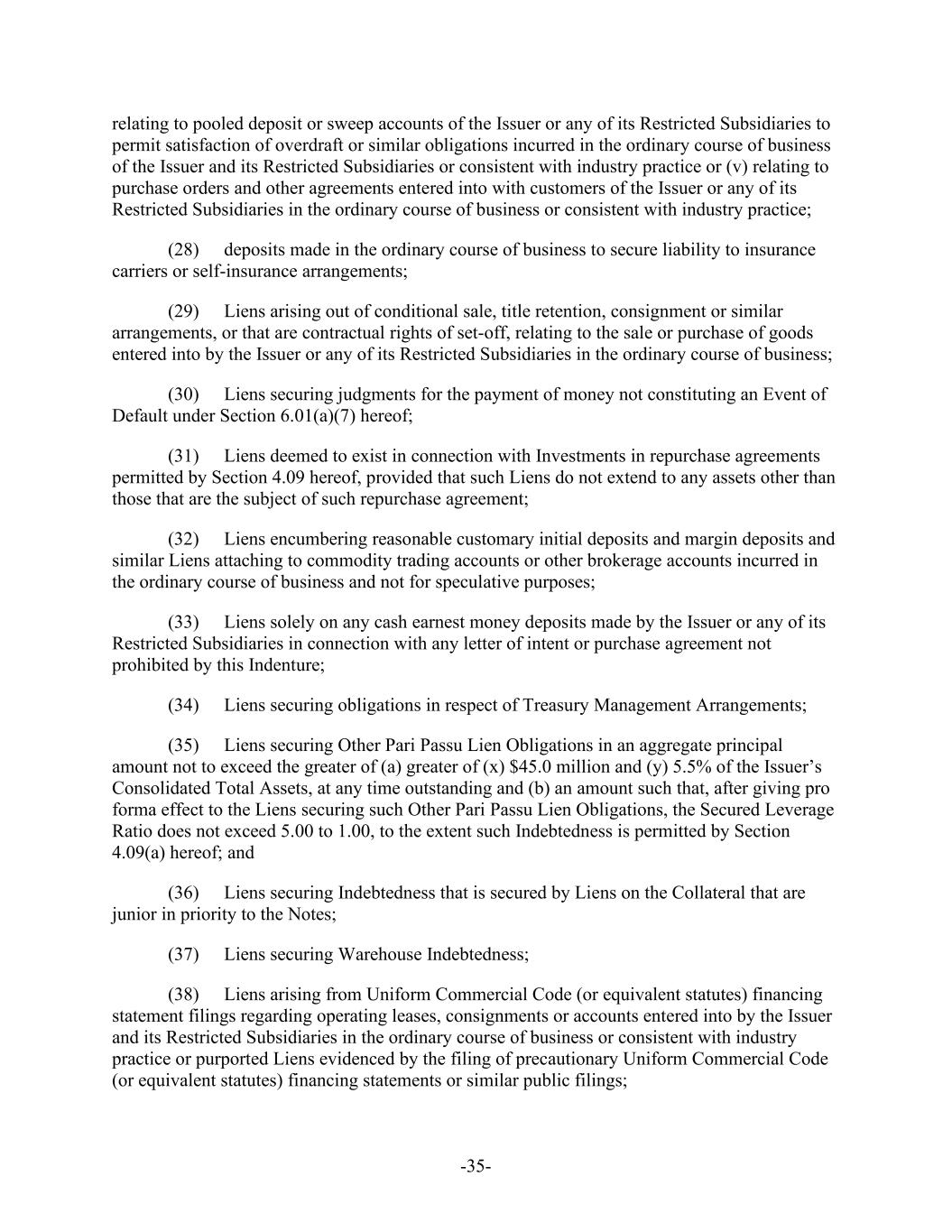 -35- relating to pooled deposit or sweep accounts of the Issuer or any of its Restricted Subsidiaries to permit satisfaction of overdraft or similar obligations incurred in the ordinary course of business of the Issuer and its Restricted Subsidiaries or consistent with industry practice or (v) relating to purchase orders and other agreements entered into with customers of the Issuer or any of its Restricted Subsidiaries in the ordinary course of business or consistent with industry practice; (28) deposits made in the ordinary course of business to secure liability to insurance carriers or self-insurance arrangements; (29) Liens arising out of conditional sale, title retention, consignment or similar arrangements, or that are contractual rights of set-off, relating to the sale or purchase of goods entered into by the Issuer or any of its Restricted Subsidiaries in the ordinary course of business; (30) Liens securing judgments for the payment of money not constituting an Event of Default under Section 6.01(a)(7) hereof; (31) Liens deemed to exist in connection with Investments in repurchase agreements permitted by Section 4.09 hereof, provided that such Liens do not extend to any assets other than those that are the subject of such repurchase agreement; (32) Liens encumbering reasonable customary initial deposits and margin deposits and similar Liens attaching to commodity trading accounts or other brokerage accounts incurred in the ordinary course of business and not for speculative purposes; (33) Liens solely on any cash earnest money deposits made by the Issuer or any of its Restricted Subsidiaries in connection with any letter of intent or purchase agreement not prohibited by this Indenture; (34) Liens securing obligations in respect of Treasury Management Arrangements; (35) Liens securing Other Pari Passu Lien Obligations in an aggregate principal amount not to exceed the greater of (a) greater of (x) $45.0 million and (y) 5.5% of the Issuer’s Consolidated Total Assets, at any time outstanding and (b) an amount such that, after giving pro forma effect to the Liens securing such Other Pari Passu Lien Obligations, the Secured Leverage Ratio does not exceed 5.00 to 1.00, to the extent such Indebtedness is permitted by Section 4.09(a) hereof; and (36) Liens securing Indebtedness that is secured by Liens on the Collateral that are junior in priority to the Notes; (37) Liens securing Warehouse Indebtedness; (38) Liens arising from Uniform Commercial Code (or equivalent statutes) financing statement filings regarding operating leases, consignments or accounts entered into by the Issuer and its Restricted Subsidiaries in the ordinary course of business or consistent with industry practice or purported Liens evidenced by the filing of precautionary Uniform Commercial Code (or equivalent statutes) financing statements or similar public filings;