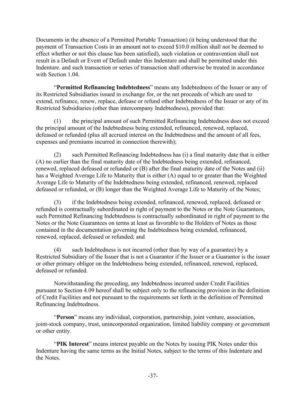 -37- Documents in the absence of a Permitted Portable Transaction) (it being understood that the payment of Transaction Costs in an amount not to exceed $10.0 million shall not be deemed to effect whether or not this clause has been satisfied), such violation or contravention shall not result in a Default or Event of Default under this Indenture and shall be permitted under this Indenture. and such transaction or series of transaction shall otherwise be treated in accordance with Section 1.04. “Permitted Refinancing Indebtedness” means any Indebtedness of the Issuer or any of its Restricted Subsidiaries issued in exchange for, or the net proceeds of which are used to extend, refinance, renew, replace, defease or refund other Indebtedness of the Issuer or any of its Restricted Subsidiaries (other than intercompany Indebtedness), provided that: (1) the principal amount of such Permitted Refinancing Indebtedness does not exceed the principal amount of the Indebtedness being extended, refinanced, renewed, replaced, defeased or refunded (plus all accrued interest on the Indebtedness and the amount of all fees, expenses and premiums incurred in connection therewith); (2) such Permitted Refinancing Indebtedness has (i) a final maturity date that is either (A) no earlier than the final maturity date of the Indebtedness being extended, refinanced, renewed, replaced defeased or refunded or (B) after the final maturity date of the Notes and (ii) has a Weighted Average Life to Maturity that is either (A) equal to or greater than the Weighted Average Life to Maturity of the Indebtedness being extended, refinanced, renewed, replaced defeased or refunded, or (B) longer than the Weighted Average Life to Maturity of the Notes; (3) if the Indebtedness being extended, refinanced, renewed, replaced, defeased or refunded is contractually subordinated in right of payment to the Notes or the Note Guarantees, such Permitted Refinancing Indebtedness is contractually subordinated in right of payment to the Notes or the Note Guarantees on terms at least as favorable to the Holders of Notes as those contained in the documentation governing the Indebtedness being extended, refinanced, renewed, replaced, defeased or refunded; and (4) such Indebtedness is not incurred (other than by way of a guarantee) by a Restricted Subsidiary of the Issuer that is not a Guarantor if the Issuer or a Guarantor is the issuer or other primary obligor on the Indebtedness being extended, refinanced, renewed, replaced, defeased or refunded. Notwithstanding the preceding, any Indebtedness incurred under Credit Facilities pursuant to Section 4.09 hereof shall be subject only to the refinancing provision in the definition of Credit Facilities and not pursuant to the requirements set forth in the definition of Permitted Refinancing Indebtedness. “Person” means any individual, corporation, partnership, joint venture, association, joint-stock company, trust, unincorporated organization, limited liability company or government or other entity. “PIK Interest” means interest payable on the Notes by issuing PIK Notes under this Indenture having the same terms as the Initial Notes, subject to the terms of this Indenture and the Notes.