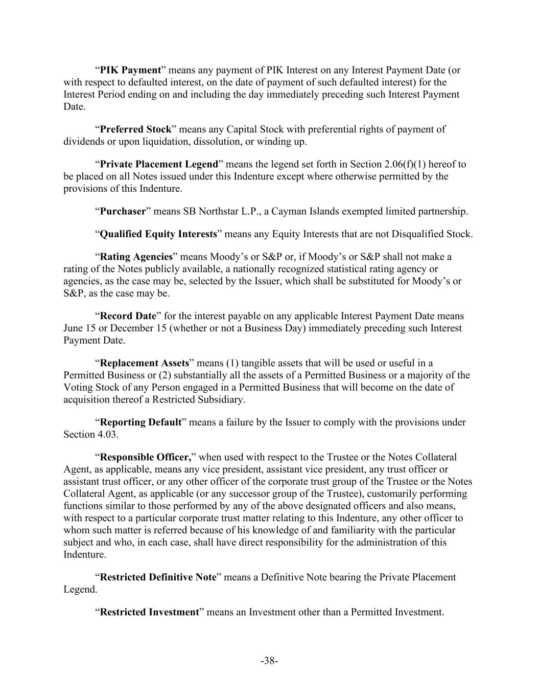 -38- “PIK Payment” means any payment of PIK Interest on any Interest Payment Date (or with respect to defaulted interest, on the date of payment of such defaulted interest) for the Interest Period ending on and including the day immediately preceding such Interest Payment Date. “Preferred Stock” means any Capital Stock with preferential rights of payment of dividends or upon liquidation, dissolution, or winding up. “Private Placement Legend” means the legend set forth in Section 2.06(f)(1) hereof to be placed on all Notes issued under this Indenture except where otherwise permitted by the provisions of this Indenture. “Purchaser” means SB Northstar L.P., a Cayman Islands exempted limited partnership. “Qualified Equity Interests” means any Equity Interests that are not Disqualified Stock. “Rating Agencies” means Moody’s or S&P or, if Moody’s or S&P shall not make a rating of the Notes publicly available, a nationally recognized statistical rating agency or agencies, as the case may be, selected by the Issuer, which shall be substituted for Moody’s or S&P, as the case may be. “Record Date” for the interest payable on any applicable Interest Payment Date means June 15 or December 15 (whether or not a Business Day) immediately preceding such Interest Payment Date. “Replacement Assets” means (1) tangible assets that will be used or useful in a Permitted Business or (2) substantially all the assets of a Permitted Business or a majority of the Voting Stock of any Person engaged in a Permitted Business that will become on the date of acquisition thereof a Restricted Subsidiary. “Reporting Default” means a failure by the Issuer to comply with the provisions under Section 4.03. “Responsible Officer,” when used with respect to the Trustee or the Notes Collateral Agent, as applicable, means any vice president, assistant vice president, any trust officer or assistant trust officer, or any other officer of the corporate trust group of the Trustee or the Notes Collateral Agent, as applicable (or any successor group of the Trustee), customarily performing functions similar to those performed by any of the above designated officers and also means, with respect to a particular corporate trust matter relating to this Indenture, any other officer to whom such matter is referred because of his knowledge of and familiarity with the particular subject and who, in each case, shall have direct responsibility for the administration of this Indenture. “Restricted Definitive Note” means a Definitive Note bearing the Private Placement Legend. “Restricted Investment” means an Investment other than a Permitted Investment.