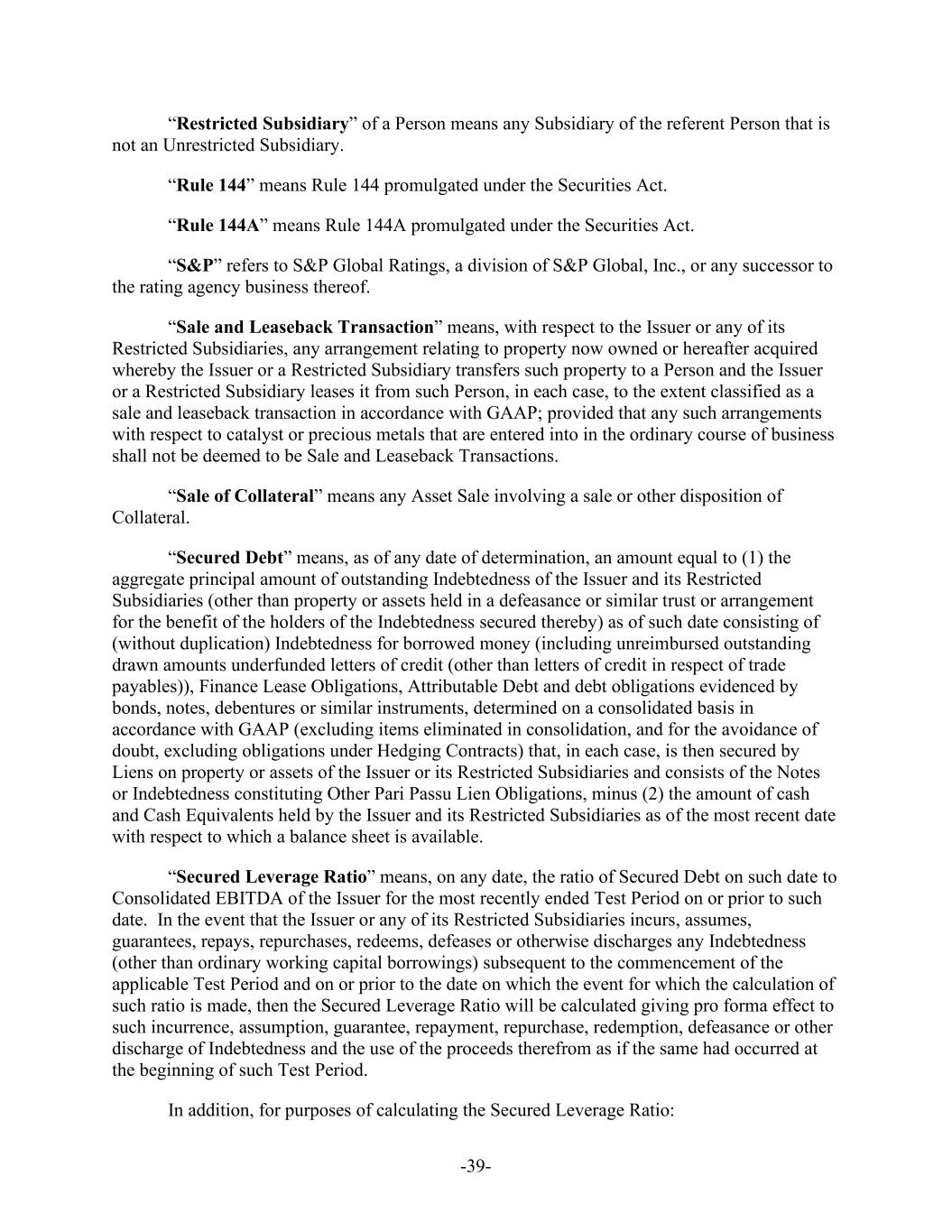 -39- “Restricted Subsidiary” of a Person means any Subsidiary of the referent Person that is not an Unrestricted Subsidiary. “Rule 144” means Rule 144 promulgated under the Securities Act. “Rule 144A” means Rule 144A promulgated under the Securities Act. “S&P” refers to S&P Global Ratings, a division of S&P Global, Inc., or any successor to the rating agency business thereof. “Sale and Leaseback Transaction” means, with respect to the Issuer or any of its Restricted Subsidiaries, any arrangement relating to property now owned or hereafter acquired whereby the Issuer or a Restricted Subsidiary transfers such property to a Person and the Issuer or a Restricted Subsidiary leases it from such Person, in each case, to the extent classified as a sale and leaseback transaction in accordance with GAAP; provided that any such arrangements with respect to catalyst or precious metals that are entered into in the ordinary course of business shall not be deemed to be Sale and Leaseback Transactions. “Sale of Collateral” means any Asset Sale involving a sale or other disposition of Collateral. “Secured Debt” means, as of any date of determination, an amount equal to (1) the aggregate principal amount of outstanding Indebtedness of the Issuer and its Restricted Subsidiaries (other than property or assets held in a defeasance or similar trust or arrangement for the benefit of the holders of the Indebtedness secured thereby) as of such date consisting of (without duplication) Indebtedness for borrowed money (including unreimbursed outstanding drawn amounts underfunded letters of credit (other than letters of credit in respect of trade payables)), Finance Lease Obligations, Attributable Debt and debt obligations evidenced by bonds, notes, debentures or similar instruments, determined on a consolidated basis in accordance with GAAP (excluding items eliminated in consolidation, and for the avoidance of doubt, excluding obligations under Hedging Contracts) that, in each case, is then secured by Liens on property or assets of the Issuer or its Restricted Subsidiaries and consists of the Notes or Indebtedness constituting Other Pari Passu Lien Obligations, minus (2) the amount of cash and Cash Equivalents held by the Issuer and its Restricted Subsidiaries as of the most recent date with respect to which a balance sheet is available. “Secured Leverage Ratio” means, on any date, the ratio of Secured Debt on such date to Consolidated EBITDA of the Issuer for the most recently ended Test Period on or prior to such date. In the event that the Issuer or any of its Restricted Subsidiaries incurs, assumes, guarantees, repays, repurchases, redeems, defeases or otherwise discharges any Indebtedness (other than ordinary working capital borrowings) subsequent to the commencement of the applicable Test Period and on or prior to the date on which the event for which the calculation of such ratio is made, then the Secured Leverage Ratio will be calculated giving pro forma effect to such incurrence, assumption, guarantee, repayment, repurchase, redemption, defeasance or other discharge of Indebtedness and the use of the proceeds therefrom as if the same had occurred at the beginning of such Test Period. In addition, for purposes of calculating the Secured Leverage Ratio: