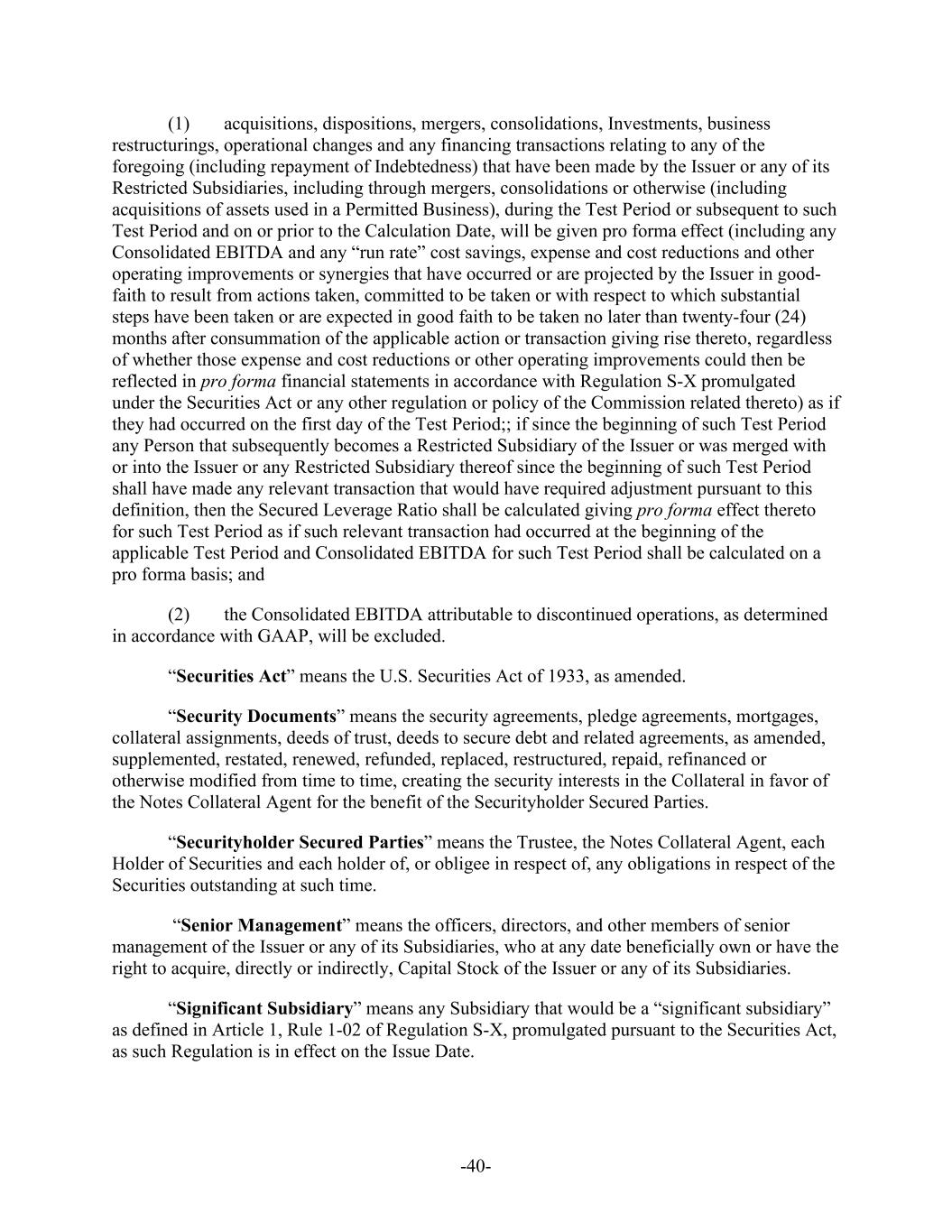 -40- (1) acquisitions, dispositions, mergers, consolidations, Investments, business restructurings, operational changes and any financing transactions relating to any of the foregoing (including repayment of Indebtedness) that have been made by the Issuer or any of its Restricted Subsidiaries, including through mergers, consolidations or otherwise (including acquisitions of assets used in a Permitted Business), during the Test Period or subsequent to such Test Period and on or prior to the Calculation Date, will be given pro forma effect (including any Consolidated EBITDA and any “run rate” cost savings, expense and cost reductions and other operating improvements or synergies that have occurred or are projected by the Issuer in good- faith to result from actions taken, committed to be taken or with respect to which substantial steps have been taken or are expected in good faith to be taken no later than twenty-four (24) months after consummation of the applicable action or transaction giving rise thereto, regardless of whether those expense and cost reductions or other operating improvements could then be reflected in pro forma financial statements in accordance with Regulation S-X promulgated under the Securities Act or any other regulation or policy of the Commission related thereto) as if they had occurred on the first day of the Test Period;; if since the beginning of such Test Period any Person that subsequently becomes a Restricted Subsidiary of the Issuer or was merged with or into the Issuer or any Restricted Subsidiary thereof since the beginning of such Test Period shall have made any relevant transaction that would have required adjustment pursuant to this definition, then the Secured Leverage Ratio shall be calculated giving pro forma effect thereto for such Test Period as if such relevant transaction had occurred at the beginning of the applicable Test Period and Consolidated EBITDA for such Test Period shall be calculated on a pro forma basis; and (2) the Consolidated EBITDA attributable to discontinued operations, as determined in accordance with GAAP, will be excluded. “Securities Act” means the U.S. Securities Act of 1933, as amended. “Security Documents” means the security agreements, pledge agreements, mortgages, collateral assignments, deeds of trust, deeds to secure debt and related agreements, as amended, supplemented, restated, renewed, refunded, replaced, restructured, repaid, refinanced or otherwise modified from time to time, creating the security interests in the Collateral in favor of the Notes Collateral Agent for the benefit of the Securityholder Secured Parties. “Securityholder Secured Parties” means the Trustee, the Notes Collateral Agent, each Holder of Securities and each holder of, or obligee in respect of, any obligations in respect of the Securities outstanding at such time. “Senior Management” means the officers, directors, and other members of senior management of the Issuer or any of its Subsidiaries, who at any date beneficially own or have the right to acquire, directly or indirectly, Capital Stock of the Issuer or any of its Subsidiaries. “Significant Subsidiary” means any Subsidiary that would be a “significant subsidiary” as defined in Article 1, Rule 1-02 of Regulation S-X, promulgated pursuant to the Securities Act, as such Regulation is in effect on the Issue Date.