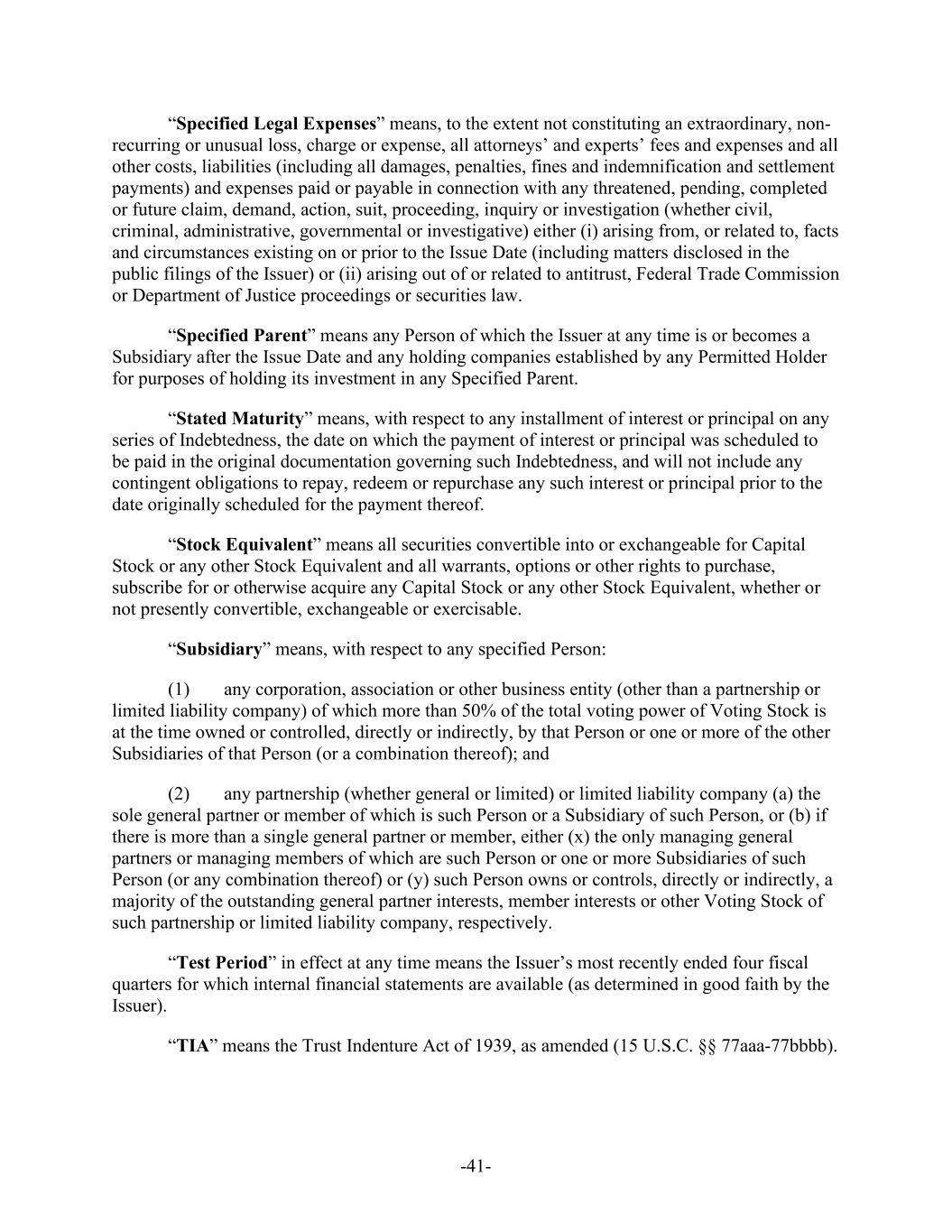 -41- “Specified Legal Expenses” means, to the extent not constituting an extraordinary, non- recurring or unusual loss, charge or expense, all attorneys’ and experts’ fees and expenses and all other costs, liabilities (including all damages, penalties, fines and indemnification and settlement payments) and expenses paid or payable in connection with any threatened, pending, completed or future claim, demand, action, suit, proceeding, inquiry or investigation (whether civil, criminal, administrative, governmental or investigative) either (i) arising from, or related to, facts and circumstances existing on or prior to the Issue Date (including matters disclosed in the public filings of the Issuer) or (ii) arising out of or related to antitrust, Federal Trade Commission or Department of Justice proceedings or securities law. “Specified Parent” means any Person of which the Issuer at any time is or becomes a Subsidiary after the Issue Date and any holding companies established by any Permitted Holder for purposes of holding its investment in any Specified Parent. “Stated Maturity” means, with respect to any installment of interest or principal on any series of Indebtedness, the date on which the payment of interest or principal was scheduled to be paid in the original documentation governing such Indebtedness, and will not include any contingent obligations to repay, redeem or repurchase any such interest or principal prior to the date originally scheduled for the payment thereof. “Stock Equivalent” means all securities convertible into or exchangeable for Capital Stock or any other Stock Equivalent and all warrants, options or other rights to purchase, subscribe for or otherwise acquire any Capital Stock or any other Stock Equivalent, whether or not presently convertible, exchangeable or exercisable. “Subsidiary” means, with respect to any specified Person: (1) any corporation, association or other business entity (other than a partnership or limited liability company) of which more than 50% of the total voting power of Voting Stock is at the time owned or controlled, directly or indirectly, by that Person or one or more of the other Subsidiaries of that Person (or a combination thereof); and (2) any partnership (whether general or limited) or limited liability company (a) the sole general partner or member of which is such Person or a Subsidiary of such Person, or (b) if there is more than a single general partner or member, either (x) the only managing general partners or managing members of which are such Person or one or more Subsidiaries of such Person (or any combination thereof) or (y) such Person owns or controls, directly or indirectly, a majority of the outstanding general partner interests, member interests or other Voting Stock of such partnership or limited liability company, respectively. “Test Period” in effect at any time means the Issuer’s most recently ended four fiscal quarters for which internal financial statements are available (as determined in good faith by the Issuer). “TIA” means the Trust Indenture Act of 1939, as amended (15 U.S.C. §§ 77aaa-77bbbb).