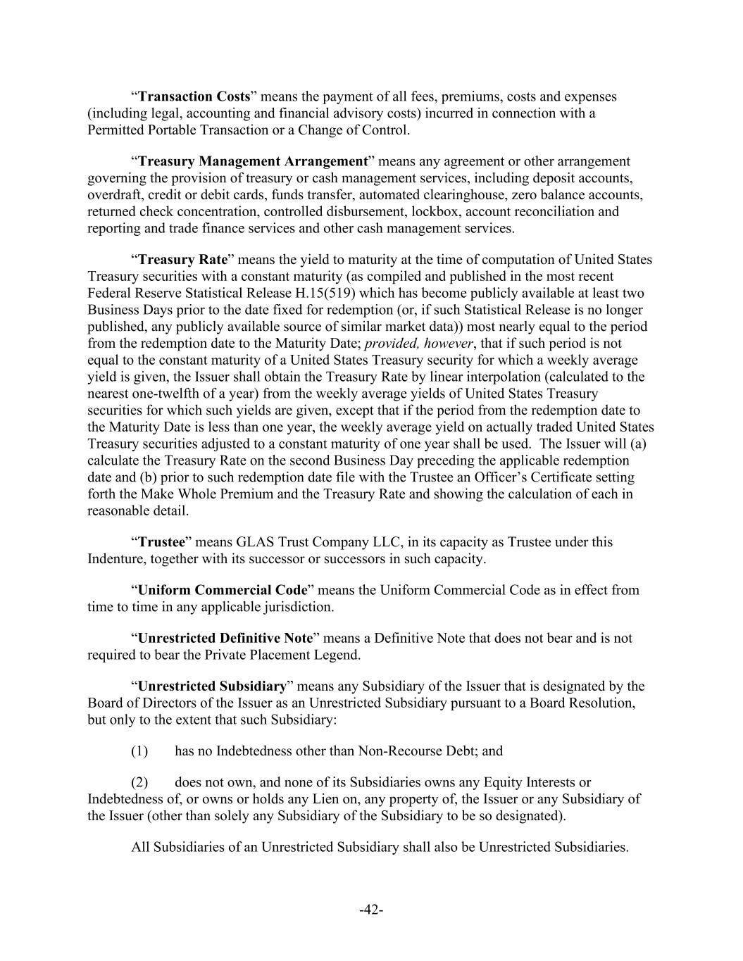 -42- “Transaction Costs” means the payment of all fees, premiums, costs and expenses (including legal, accounting and financial advisory costs) incurred in connection with a Permitted Portable Transaction or a Change of Control. “Treasury Management Arrangement” means any agreement or other arrangement governing the provision of treasury or cash management services, including deposit accounts, overdraft, credit or debit cards, funds transfer, automated clearinghouse, zero balance accounts, returned check concentration, controlled disbursement, lockbox, account reconciliation and reporting and trade finance services and other cash management services. “Treasury Rate” means the yield to maturity at the time of computation of United States Treasury securities with a constant maturity (as compiled and published in the most recent Federal Reserve Statistical Release H.15(519) which has become publicly available at least two Business Days prior to the date fixed for redemption (or, if such Statistical Release is no longer published, any publicly available source of similar market data)) most nearly equal to the period from the redemption date to the Maturity Date; provided, however, that if such period is not equal to the constant maturity of a United States Treasury security for which a weekly average yield is given, the Issuer shall obtain the Treasury Rate by linear interpolation (calculated to the nearest one-twelfth of a year) from the weekly average yields of United States Treasury securities for which such yields are given, except that if the period from the redemption date to the Maturity Date is less than one year, the weekly average yield on actually traded United States Treasury securities adjusted to a constant maturity of one year shall be used. The Issuer will (a) calculate the Treasury Rate on the second Business Day preceding the applicable redemption date and (b) prior to such redemption date file with the Trustee an Officer’s Certificate setting forth the Make Whole Premium and the Treasury Rate and showing the calculation of each in reasonable detail. “Trustee” means GLAS Trust Company LLC, in its capacity as Trustee under this Indenture, together with its successor or successors in such capacity. “Uniform Commercial Code” means the Uniform Commercial Code as in effect from time to time in any applicable jurisdiction. “Unrestricted Definitive Note” means a Definitive Note that does not bear and is not required to bear the Private Placement Legend. “Unrestricted Subsidiary” means any Subsidiary of the Issuer that is designated by the Board of Directors of the Issuer as an Unrestricted Subsidiary pursuant to a Board Resolution, but only to the extent that such Subsidiary: (1) has no Indebtedness other than Non-Recourse Debt; and (2) does not own, and none of its Subsidiaries owns any Equity Interests or Indebtedness of, or owns or holds any Lien on, any property of, the Issuer or any Subsidiary of the Issuer (other than solely any Subsidiary of the Subsidiary to be so designated). All Subsidiaries of an Unrestricted Subsidiary shall also be Unrestricted Subsidiaries.