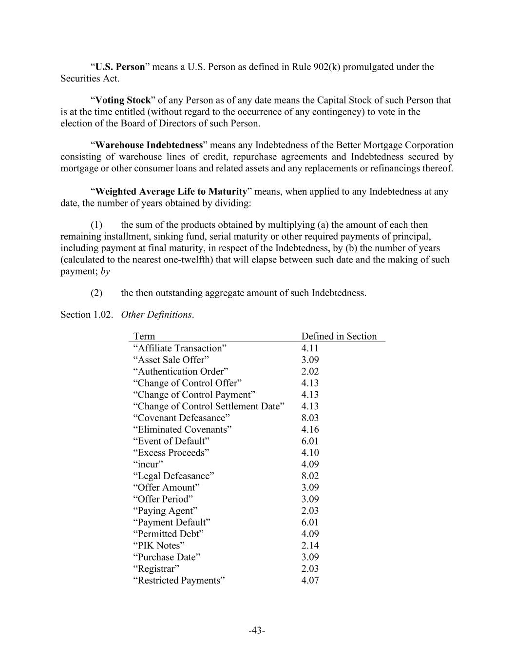 -43- “U.S. Person” means a U.S. Person as defined in Rule 902(k) promulgated under the Securities Act. “Voting Stock” of any Person as of any date means the Capital Stock of such Person that is at the time entitled (without regard to the occurrence of any contingency) to vote in the election of the Board of Directors of such Person. “Warehouse Indebtedness” means any Indebtedness of the Better Mortgage Corporation consisting of warehouse lines of credit, repurchase agreements and Indebtedness secured by mortgage or other consumer loans and related assets and any replacements or refinancings thereof. “Weighted Average Life to Maturity” means, when applied to any Indebtedness at any date, the number of years obtained by dividing: (1) the sum of the products obtained by multiplying (a) the amount of each then remaining installment, sinking fund, serial maturity or other required payments of principal, including payment at final maturity, in respect of the Indebtedness, by (b) the number of years (calculated to the nearest one-twelfth) that will elapse between such date and the making of such payment; by (2) the then outstanding aggregate amount of such Indebtedness. Section 1.02. Other Definitions. Term Defined in Section “Affiliate Transaction” 4.11 “Asset Sale Offer” 3.09 “Authentication Order” 2.02 “Change of Control Offer” 4.13 “Change of Control Payment” 4.13 “Change of Control Settlement Date” 4.13 “Covenant Defeasance” 8.03 “Eliminated Covenants” 4.16 “Event of Default” 6.01 “Excess Proceeds” 4.10 “incur” 4.09 “Legal Defeasance” 8.02 “Offer Amount” 3.09 “Offer Period” 3.09 “Paying Agent” 2.03 “Payment Default” 6.01 “Permitted Debt” 4.09 “PIK Notes” 2.14 “Purchase Date” 3.09 “Registrar” 2.03 “Restricted Payments” 4.07