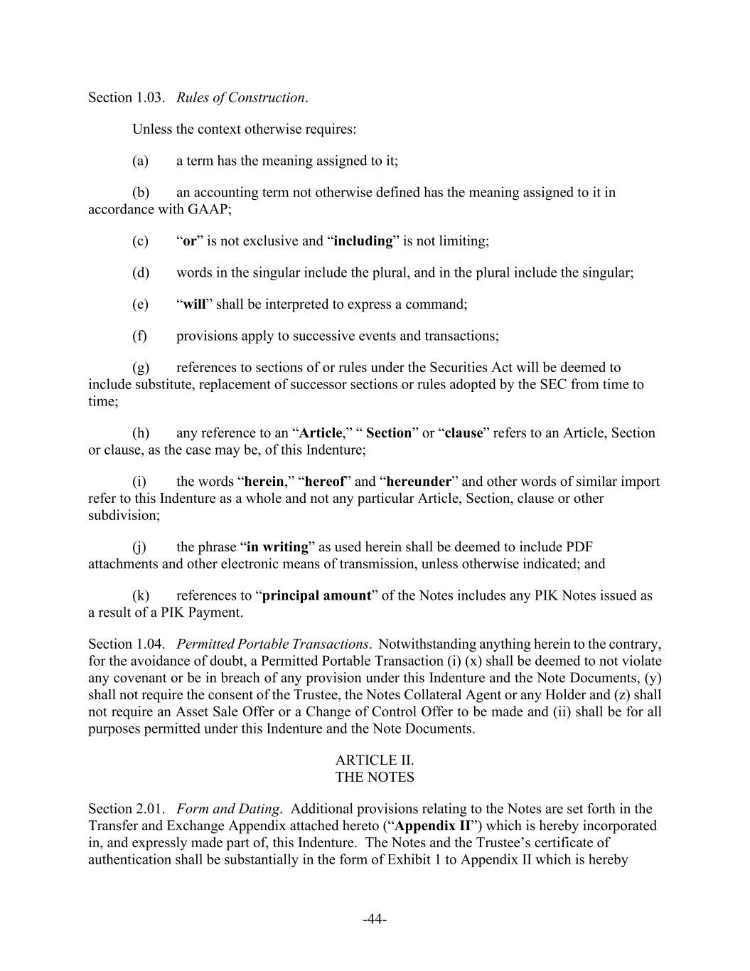 -44- Section 1.03. Rules of Construction. Unless the context otherwise requires: (a) a term has the meaning assigned to it; (b) an accounting term not otherwise defined has the meaning assigned to it in accordance with GAAP; (c) “or” is not exclusive and “including” is not limiting; (d) words in the singular include the plural, and in the plural include the singular; (e) “will” shall be interpreted to express a command; (f) provisions apply to successive events and transactions; (g) references to sections of or rules under the Securities Act will be deemed to include substitute, replacement of successor sections or rules adopted by the SEC from time to time; (h) any reference to an “Article,” “ Section” or “clause” refers to an Article, Section or clause, as the case may be, of this Indenture; (i) the words “herein,” “hereof” and “hereunder” and other words of similar import refer to this Indenture as a whole and not any particular Article, Section, clause or other subdivision; (j) the phrase “in writing” as used herein shall be deemed to include PDF attachments and other electronic means of transmission, unless otherwise indicated; and (k) references to “principal amount” of the Notes includes any PIK Notes issued as a result of a PIK Payment. Section 1.04. Permitted Portable Transactions. Notwithstanding anything herein to the contrary, for the avoidance of doubt, a Permitted Portable Transaction (i) (x) shall be deemed to not violate any covenant or be in breach of any provision under this Indenture and the Note Documents, (y) shall not require the consent of the Trustee, the Notes Collateral Agent or any Holder and (z) shall not require an Asset Sale Offer or a Change of Control Offer to be made and (ii) shall be for all purposes permitted under this Indenture and the Note Documents. ARTICLE II. THE NOTES Section 2.01. Form and Dating. Additional provisions relating to the Notes are set forth in the Transfer and Exchange Appendix attached hereto (“Appendix II”) which is hereby incorporated in, and expressly made part of, this Indenture. The Notes and the Trustee’s certificate of authentication shall be substantially in the form of Exhibit 1 to Appendix II which is hereby
